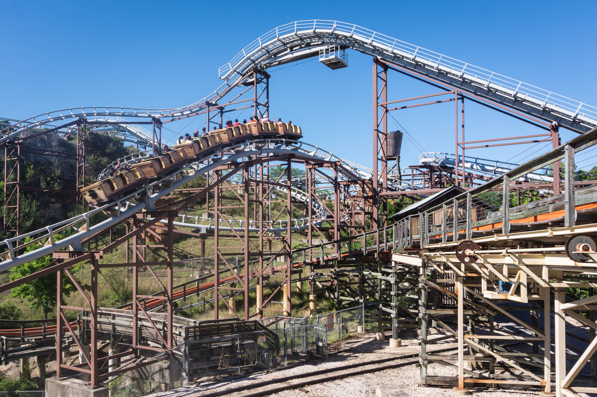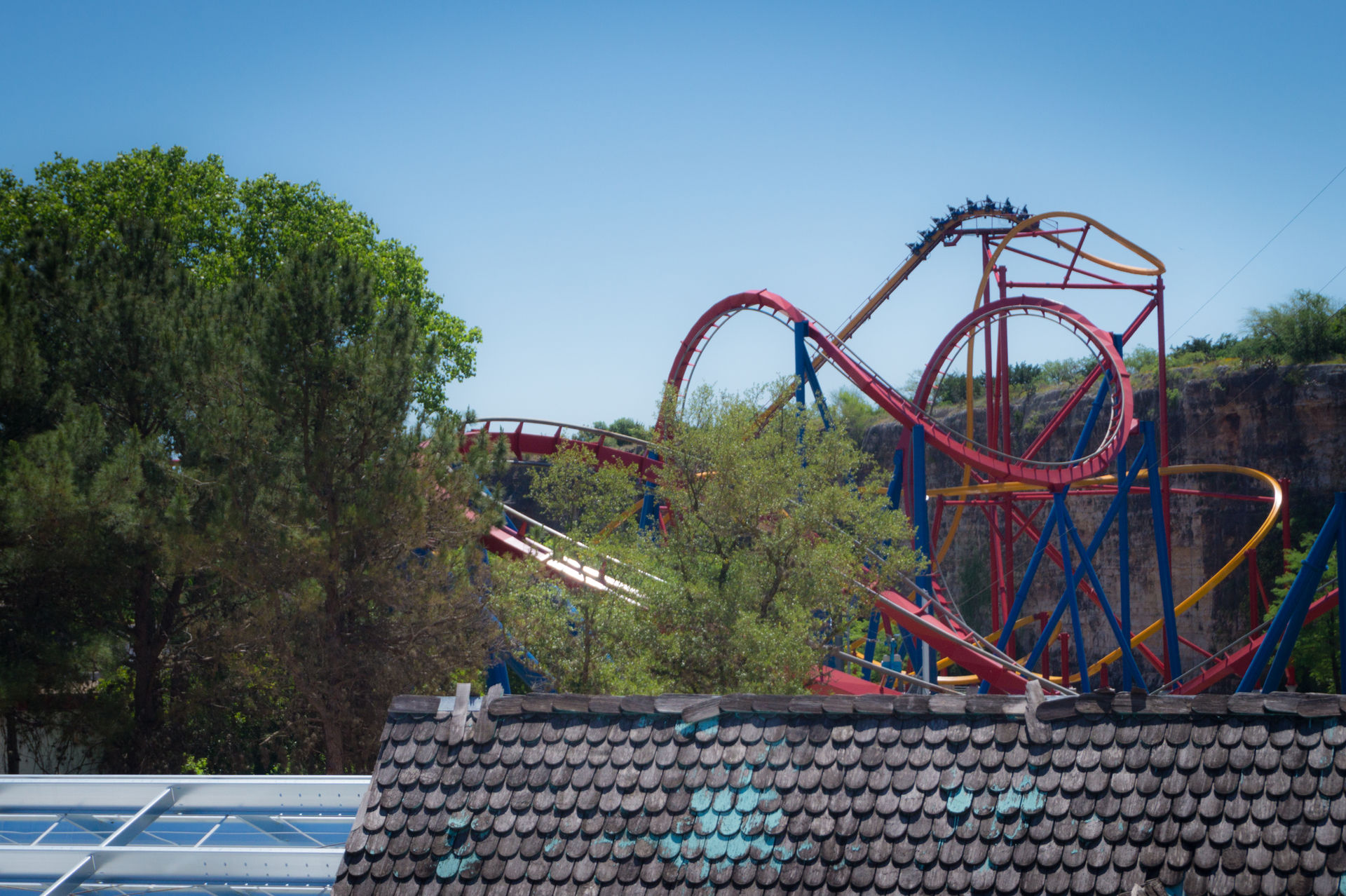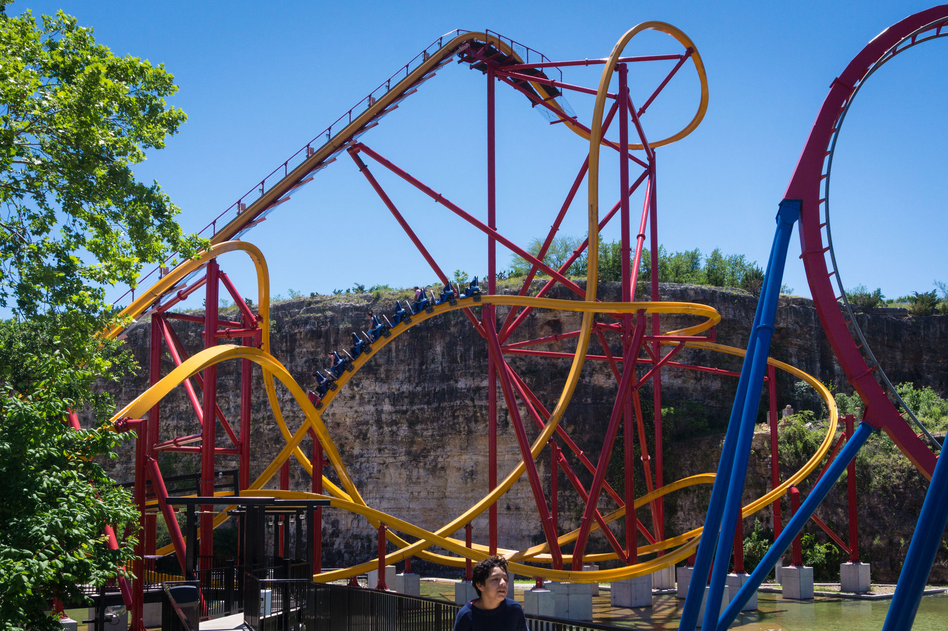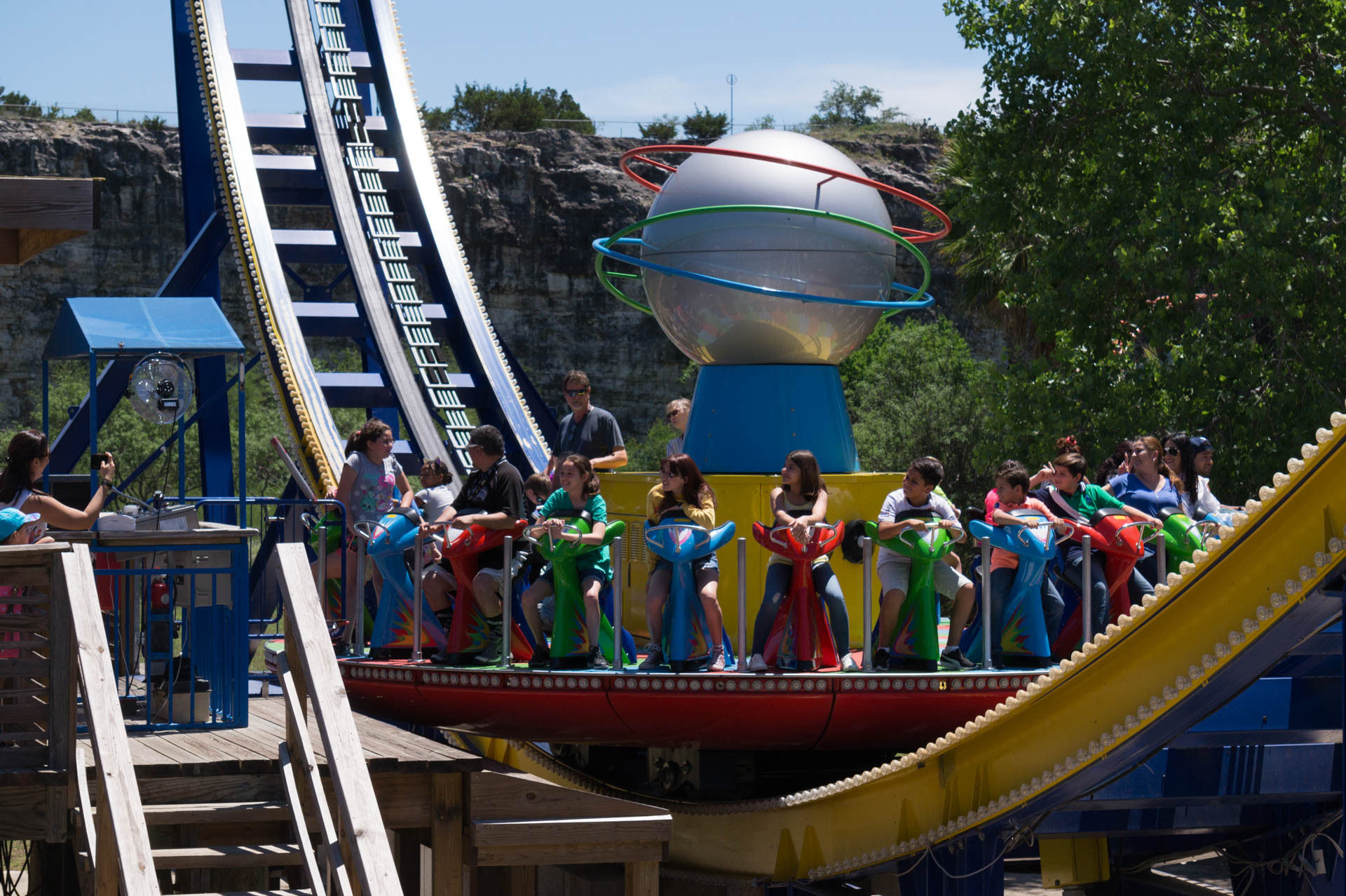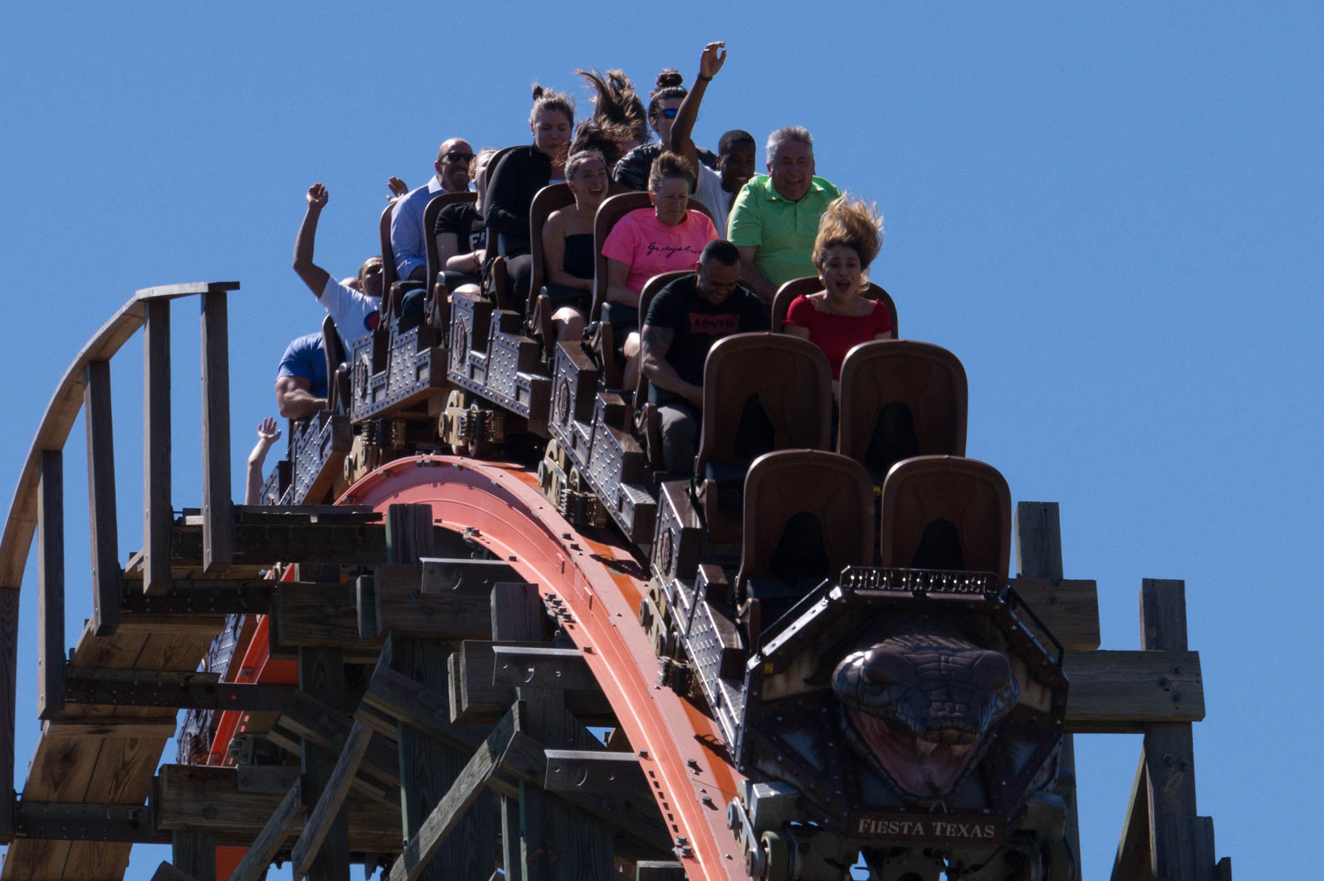 Oben an der Steinbruchwand angekommen, genießen wir den Blick auf das Einkaufszentrum The Shops at La Cantera, bevor wir uns in einer immer steiler werdenden Kurve nach unten begeben. In unsere Sitze gepresst, rasen wir nun durch das erste Tal, bevor wir in den großen Looping einfahren.