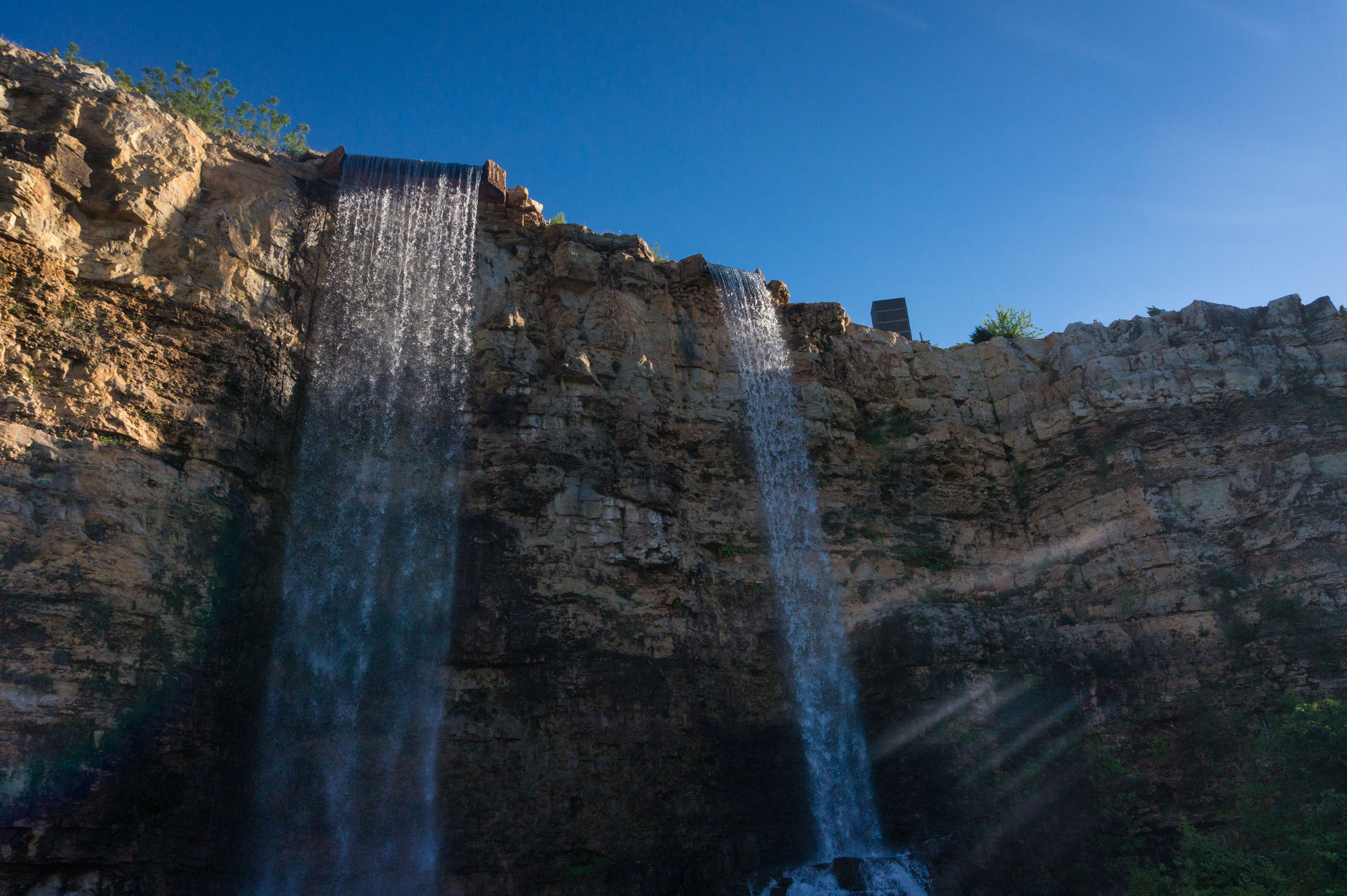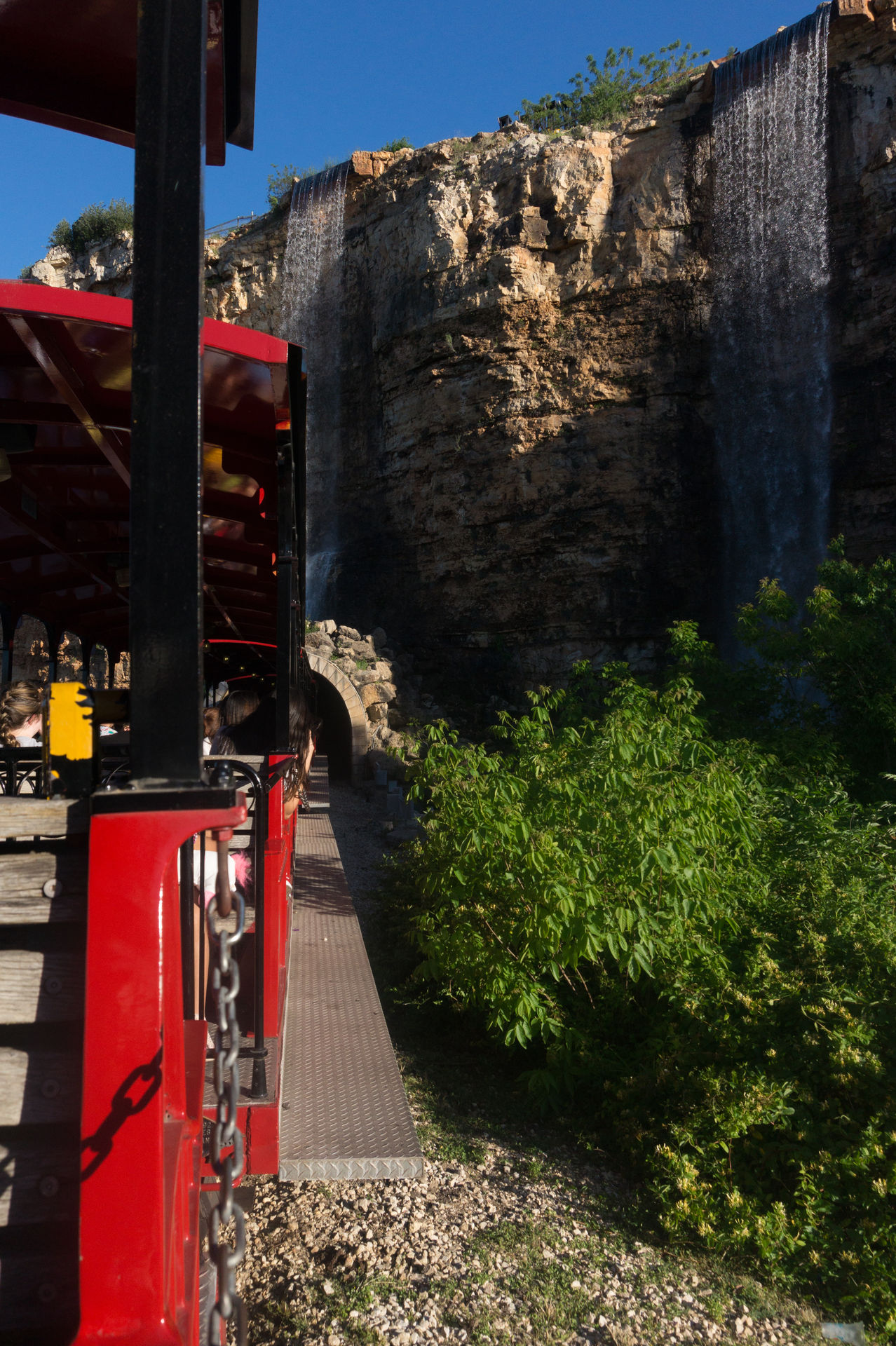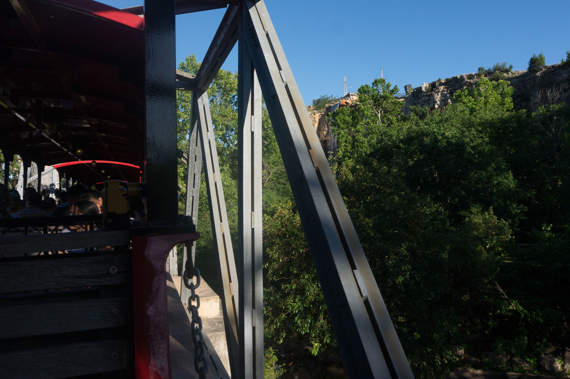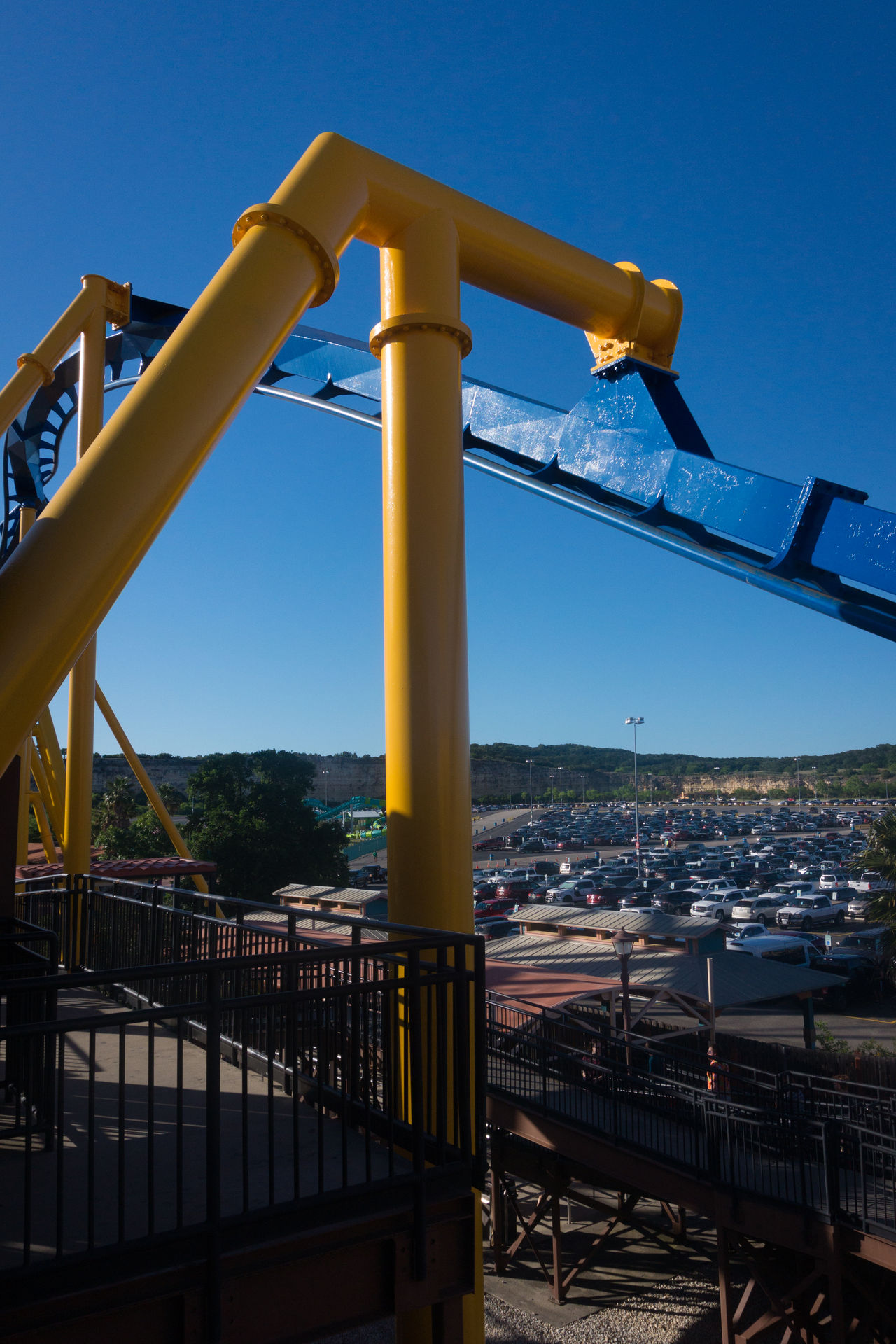 Oben an der Steinbruchwand angekommen, genießen wir den Blick auf das Einkaufszentrum The Shops at La Cantera, bevor wir uns in einer immer steiler werdenden Kurve nach unten begeben. In unsere Sitze gepresst, rasen wir nun durch das erste Tal, bevor wir in den großen Looping einfahren.