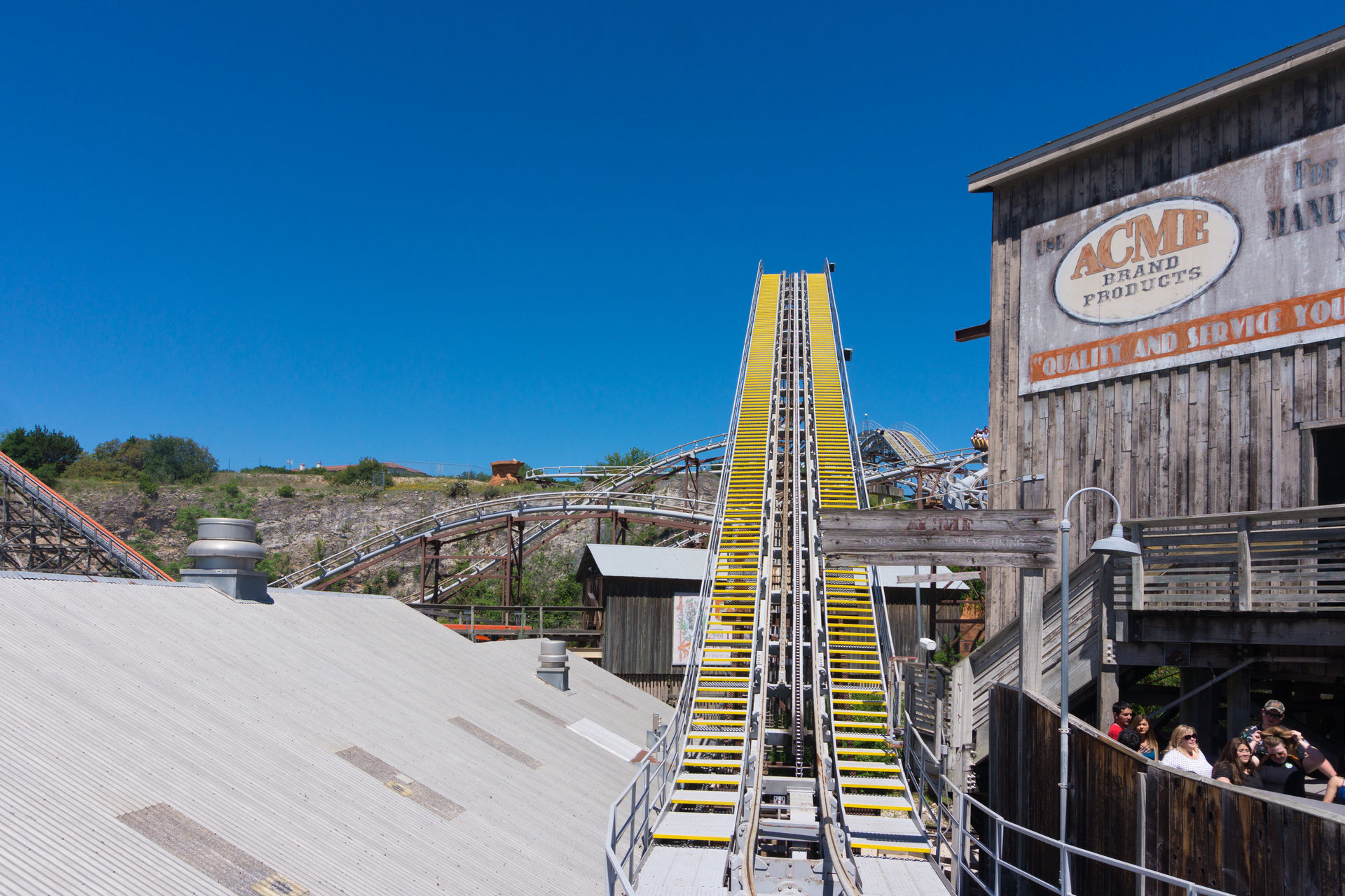 Wir beginnen unsere Reise mit einem hervorragenden Blick auf die Achterbahn Road Runner Express. Nach einer Kurve erreichen wir den Lifthügel der Bahn.