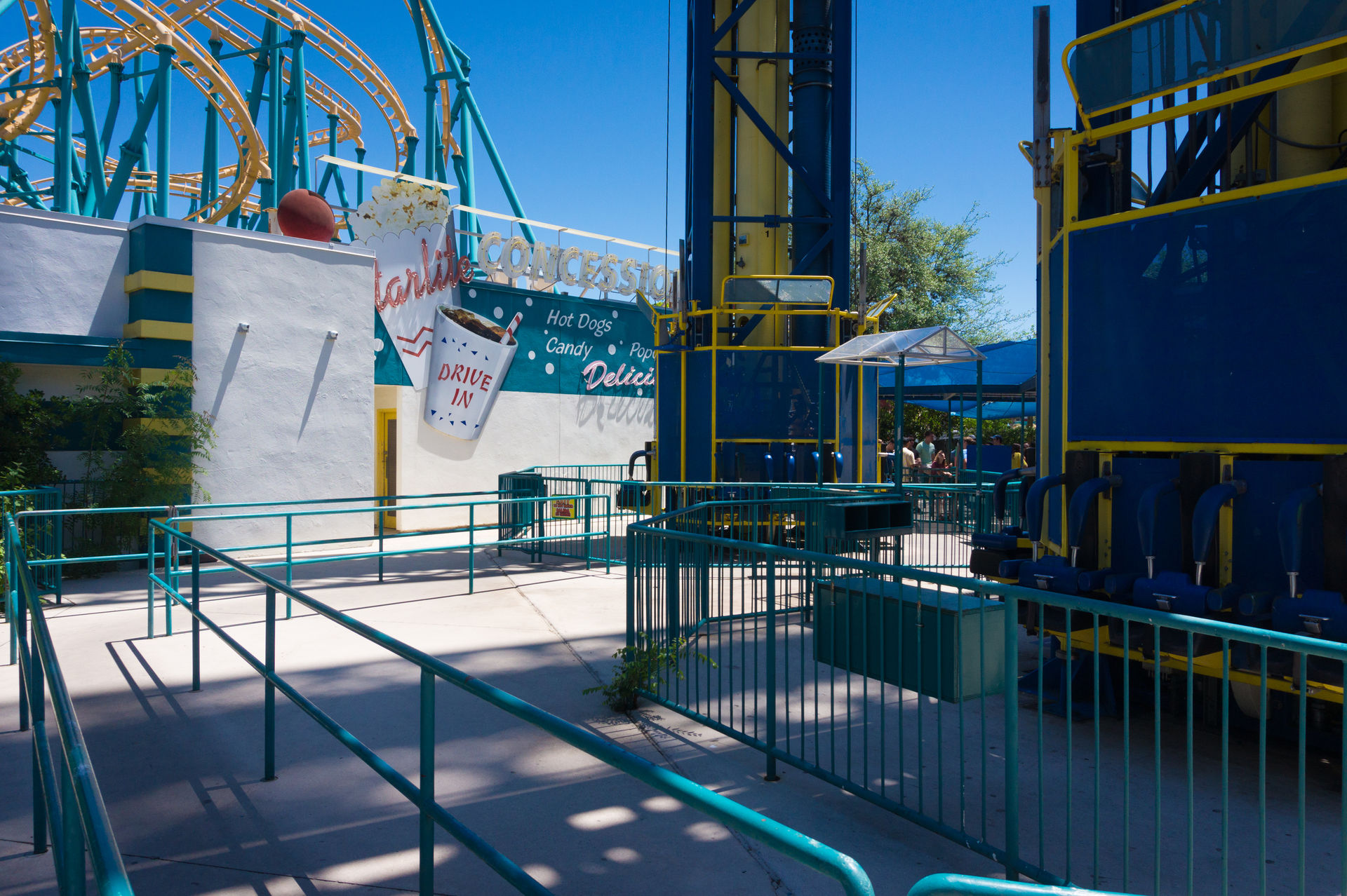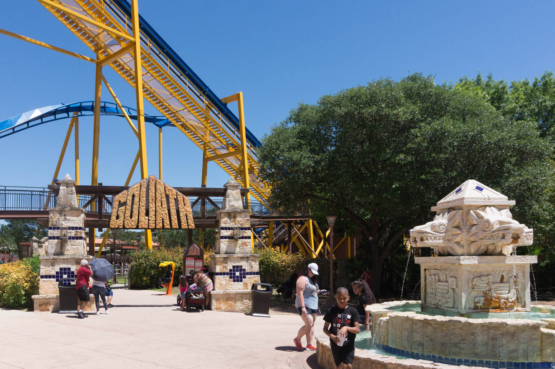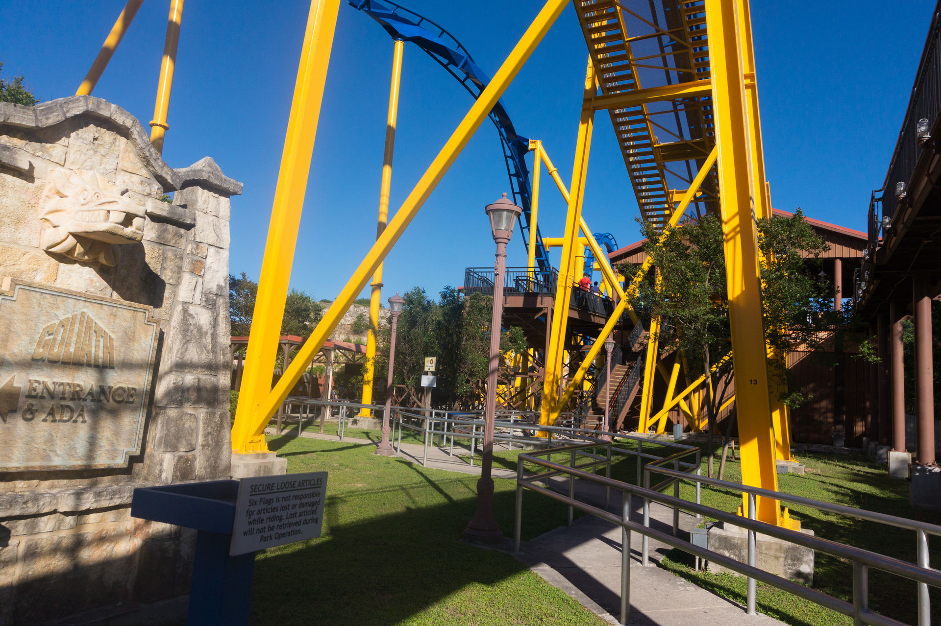 Wir begeben uns nun zurück zum Eingang des Parks, um eine Fahrt mit Goliath, dem Inverted Coaster von Six Flags Fiesta Texas, zu machen.