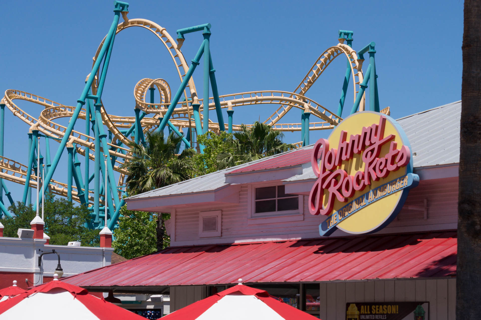 Schon die Fahrt zum Parkplatz bietet eine wunderschöne Aussicht. Ich nutzte meine Platin-Mitgliedschaft für das bevorzugte Parken, denn dies war mein letzter Besuch in einem Six Flags Park in diesem Jahr und ich wollte den Rabatt – trotz des geringeren Andrangs – noch für mich nutzen. betreten wir nun den Park.