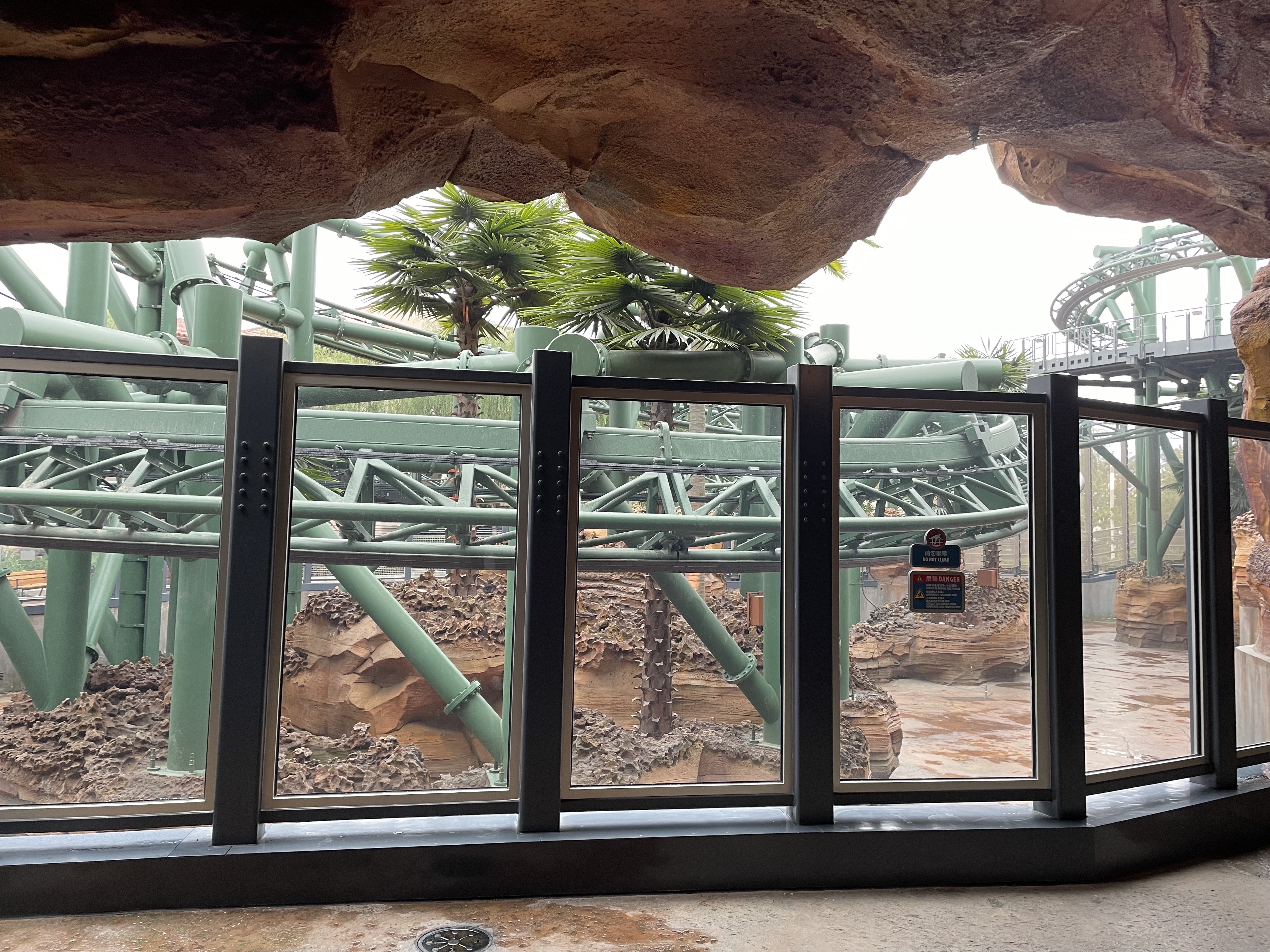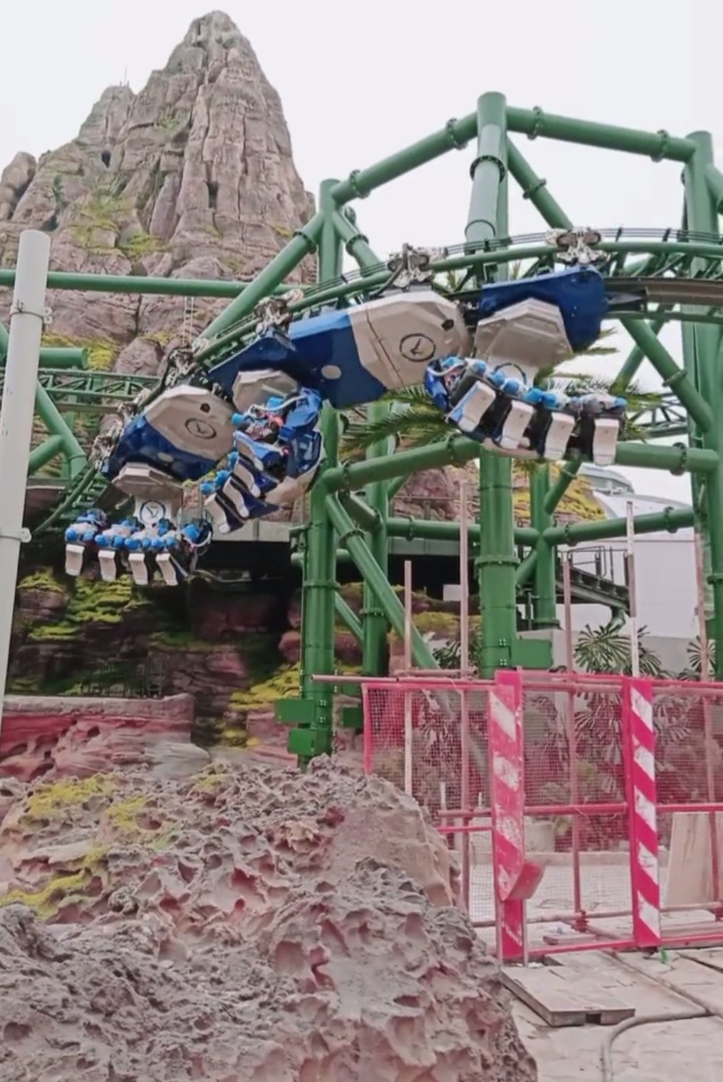 Vor allem verschwendet man hier komplett das Potenzial der drehbaren Züge. Ich hätte hier noch nicht einmal Animatronics erwartet. Viel eher ein paar Bereiche, bei denen man vor großen Screens stehen bleibt. Bei diesem riesigen Berg und der Voliere rechnet man ja auch irgendwie mit mehr Thematisierung. Ich kann mir vorstellen, dass hier sehr hohe Wartezeiten entstehen und die Leute dann echt enttäuscht raus kommen, weil man hier die überdimensionierte Version der Pteranodon Flyers aus Orlando hingestellt hat.