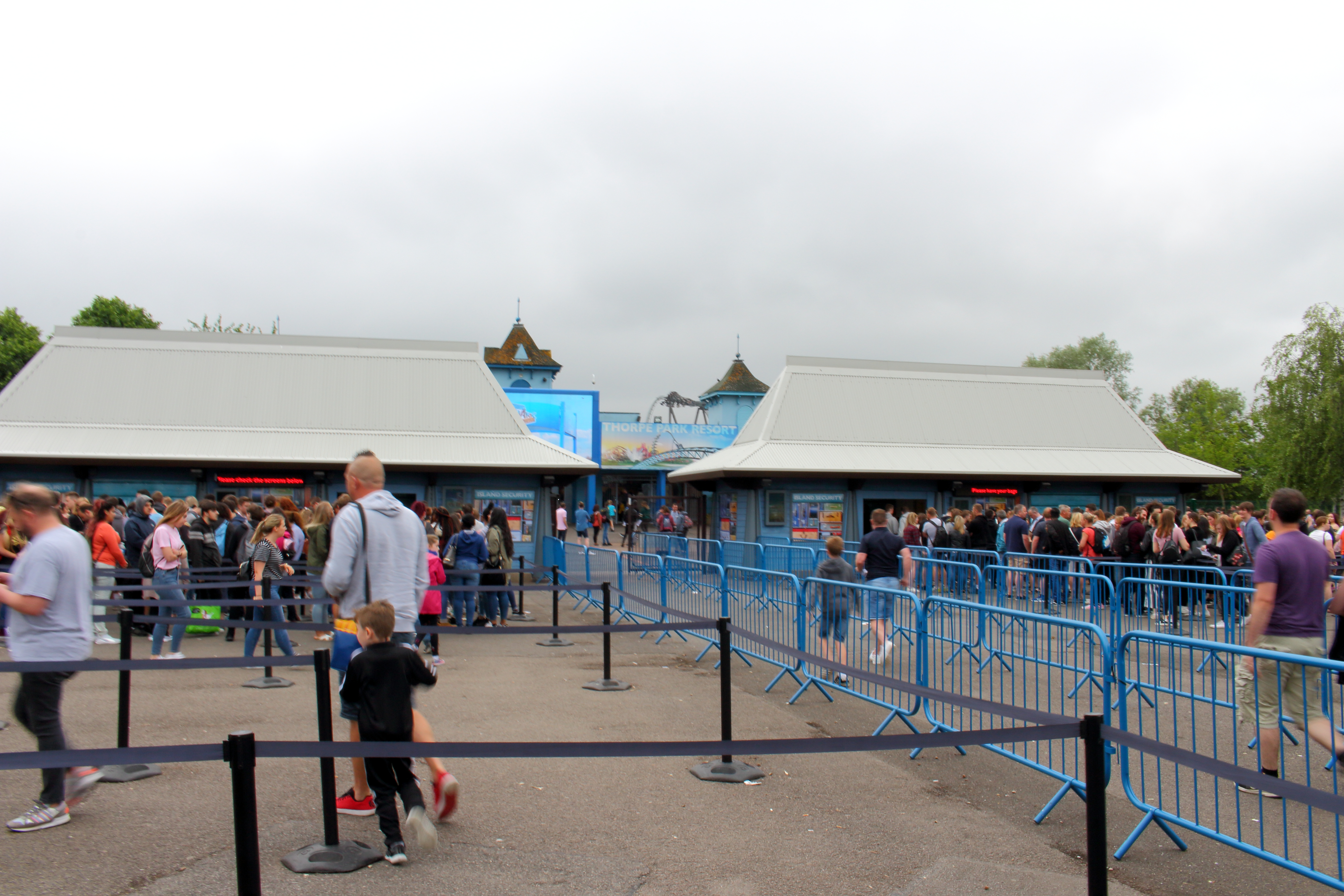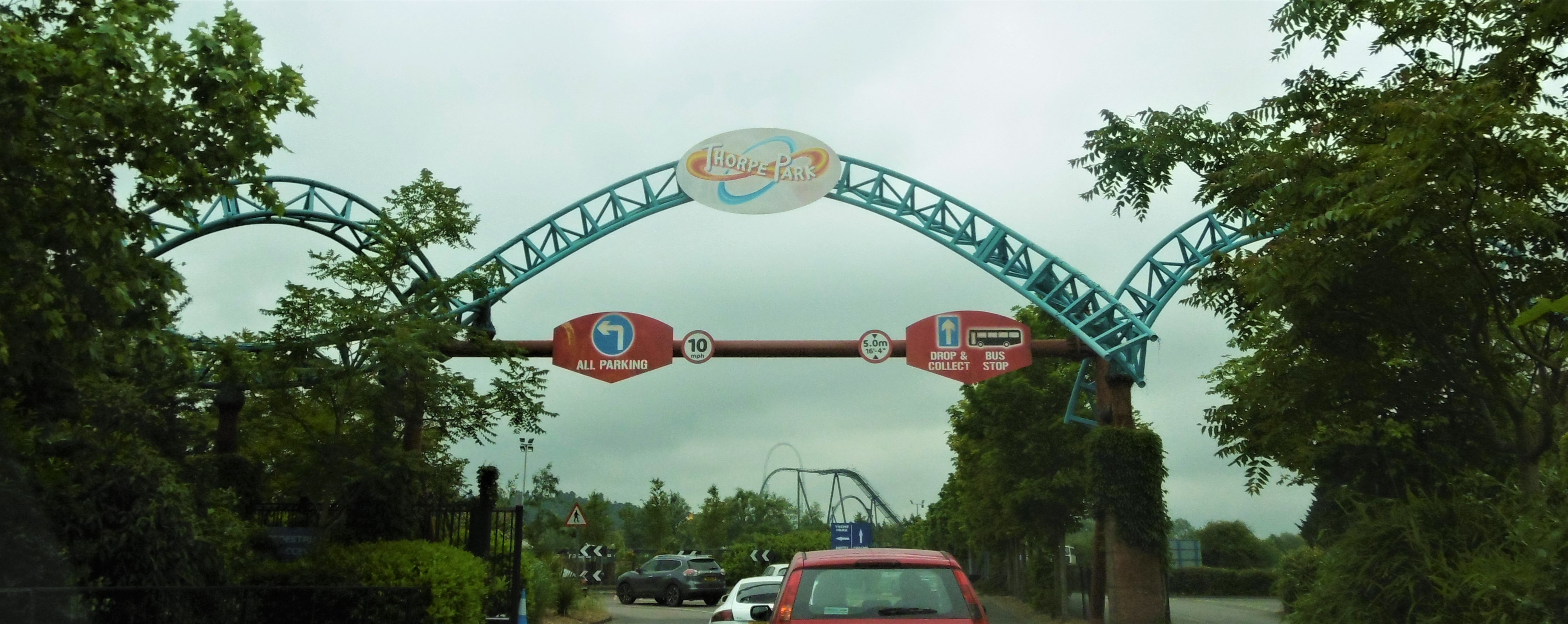B&M Wing-Coaster hatte ich die Befürchtung, dass wir noch ewig brauchen werden, bis wir in den Park kommen. Irgendwann haben wir uns gefragt, warum die Briten nicht die eingezeichnete doppelte Anfahrtsspur verwenden und sind links an den Autos vorbeigefahren, was uns dann etliche Autos nachmachten (Den Tipp gaben wir dann auch an das etwas später nachkommende zweite Auto unserer Gruppe weiter, die so auch etwas Zeit sparen konnten). So konnten wir bis kurz vor unseren Stellplatz in der Nähe des Eingangs (mit Blick auf mein vorab auserkorener verblichen bläulicher Go-to-Coaster) fahren und meine innere Unruhe besänftigte sich wieder etwas.