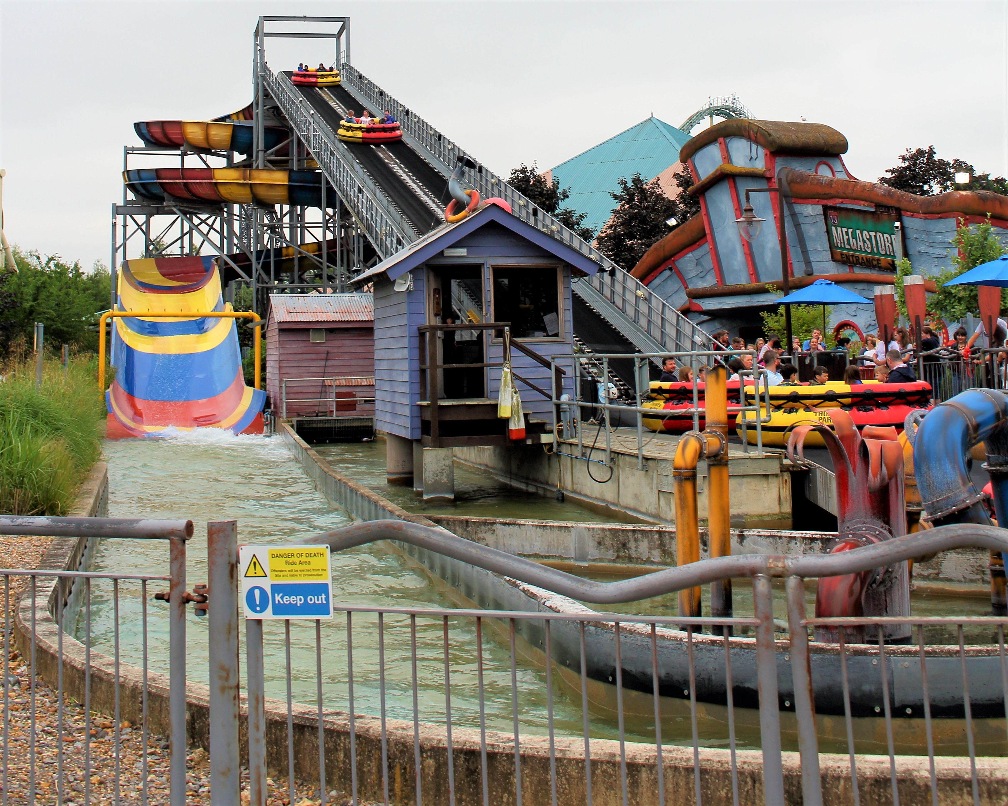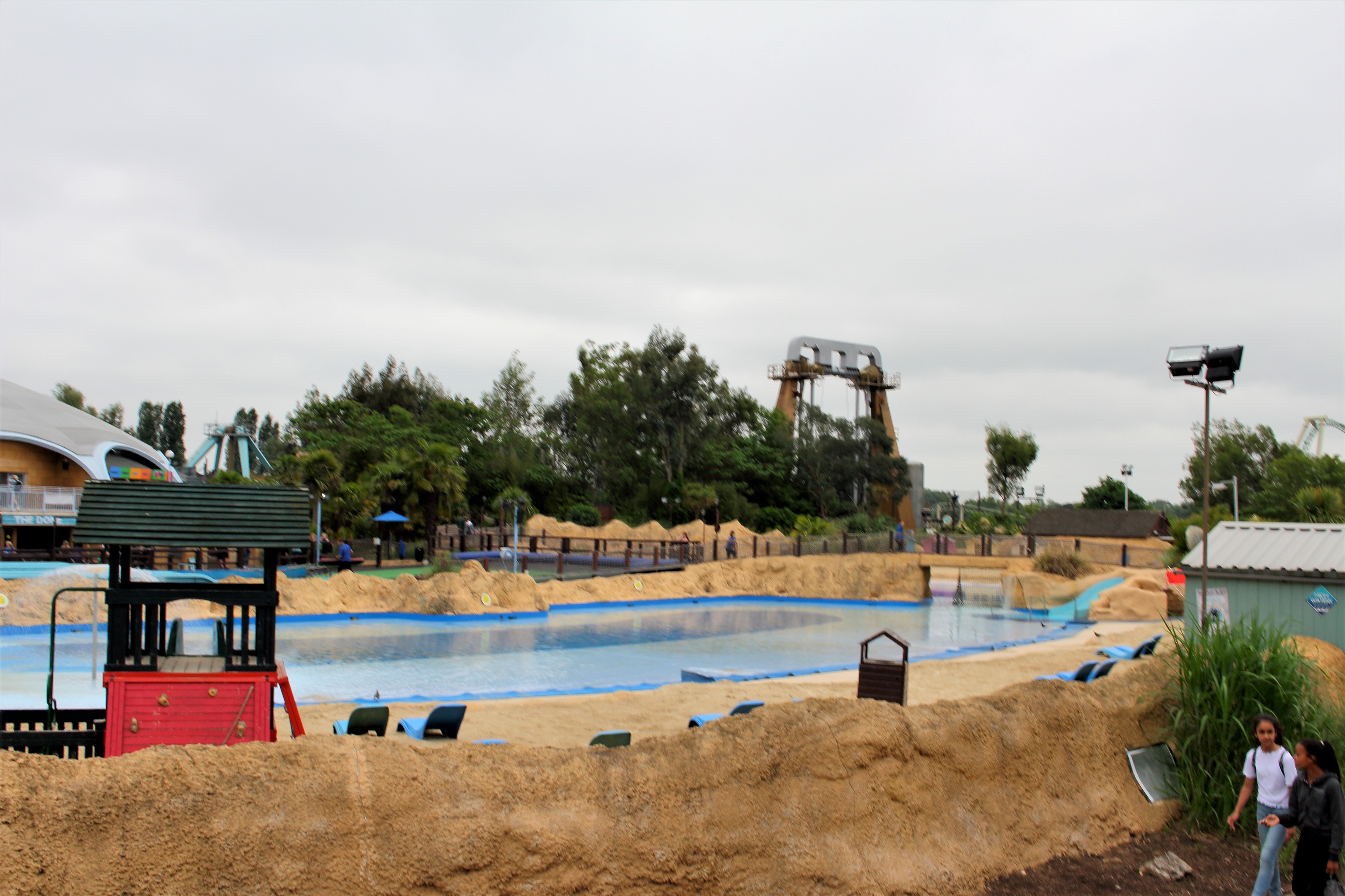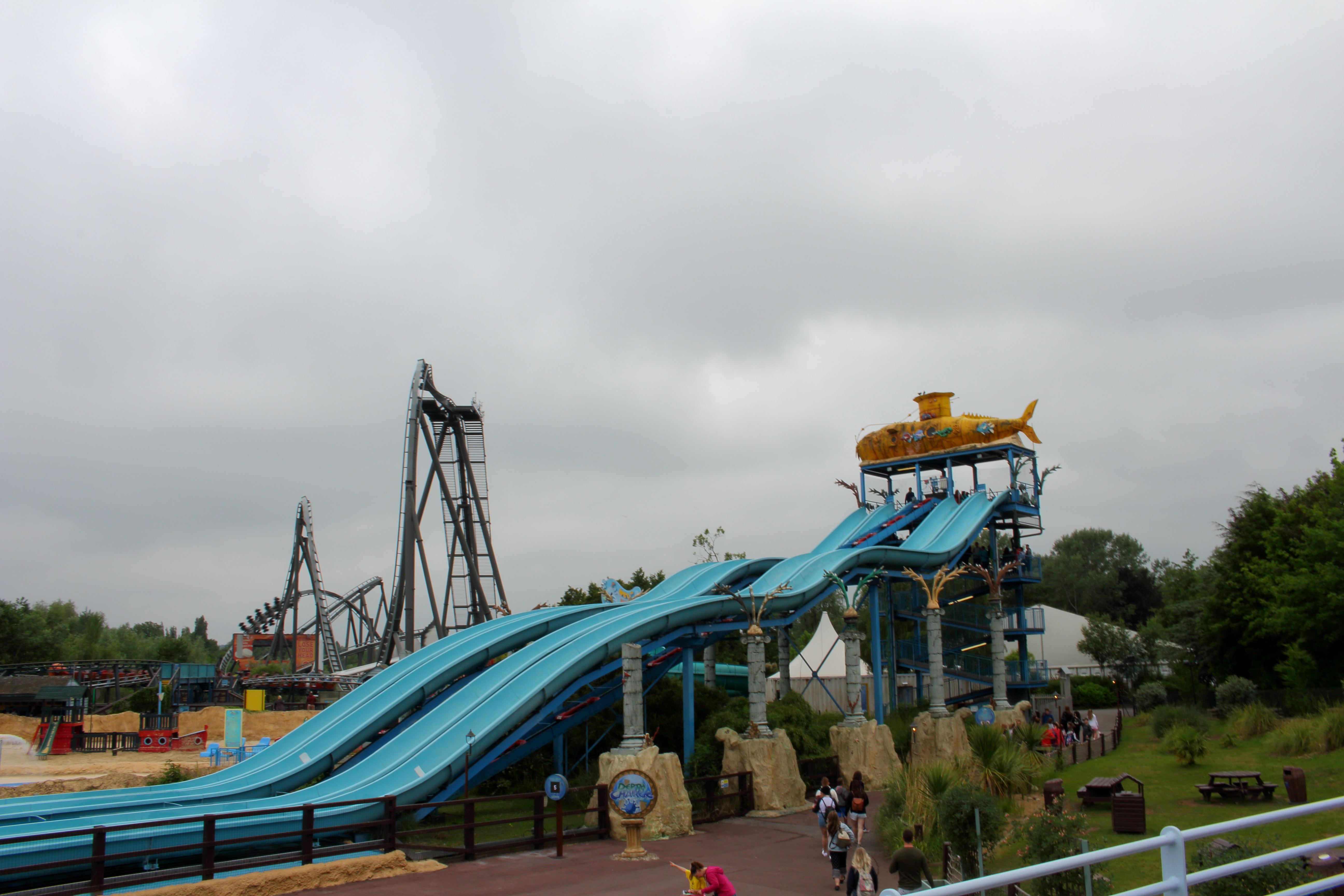 Auf der anderen Seite der Halle angelangt, thronte bei bestem englischem Wetter der Amity Beach mit seiner Bootsrutsche vor uns. Verständlich, dass wir bei den äußeren Bedingungen und der Fülle des Parks auf das Mitnehmen einer Badehose verzichtet haben.