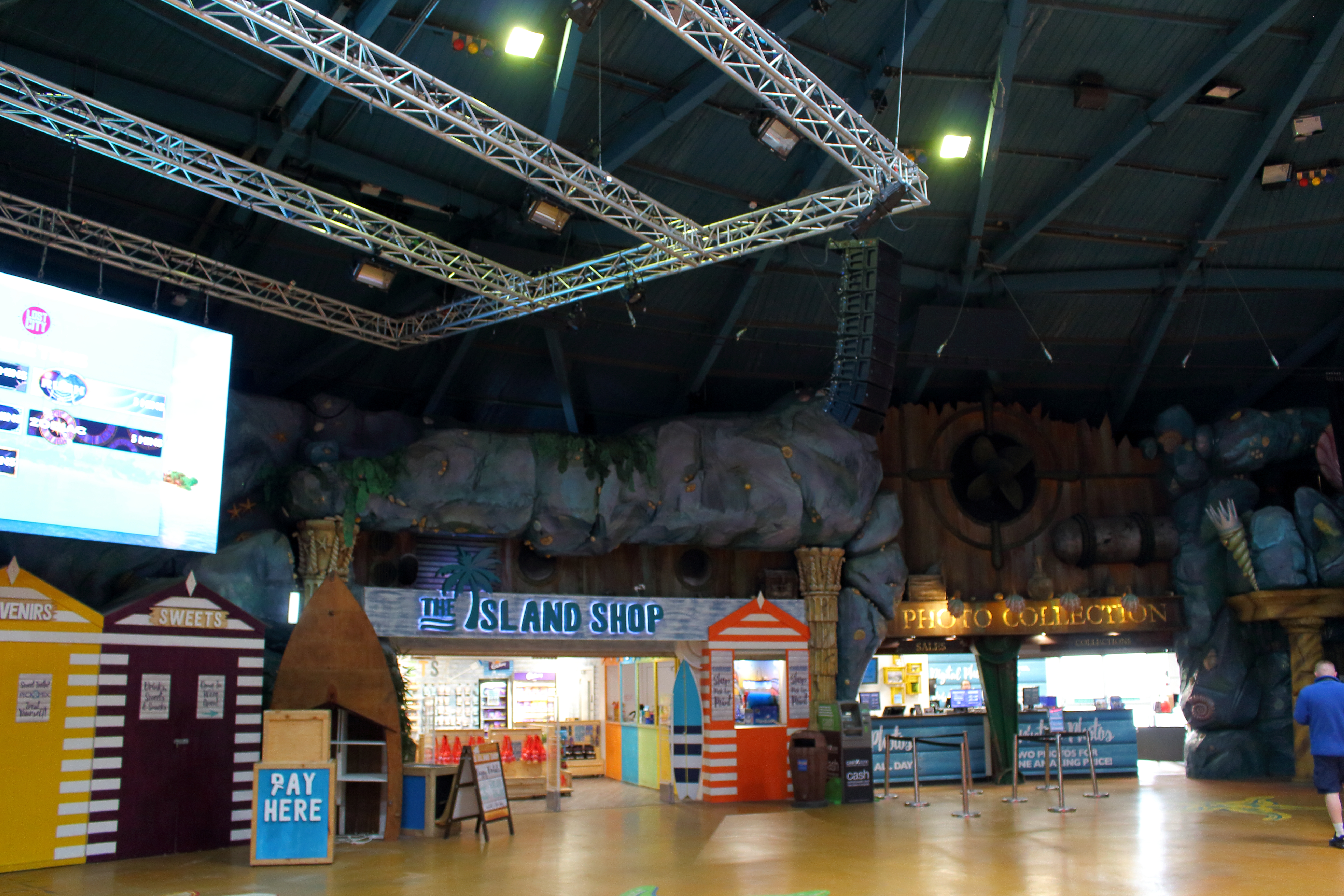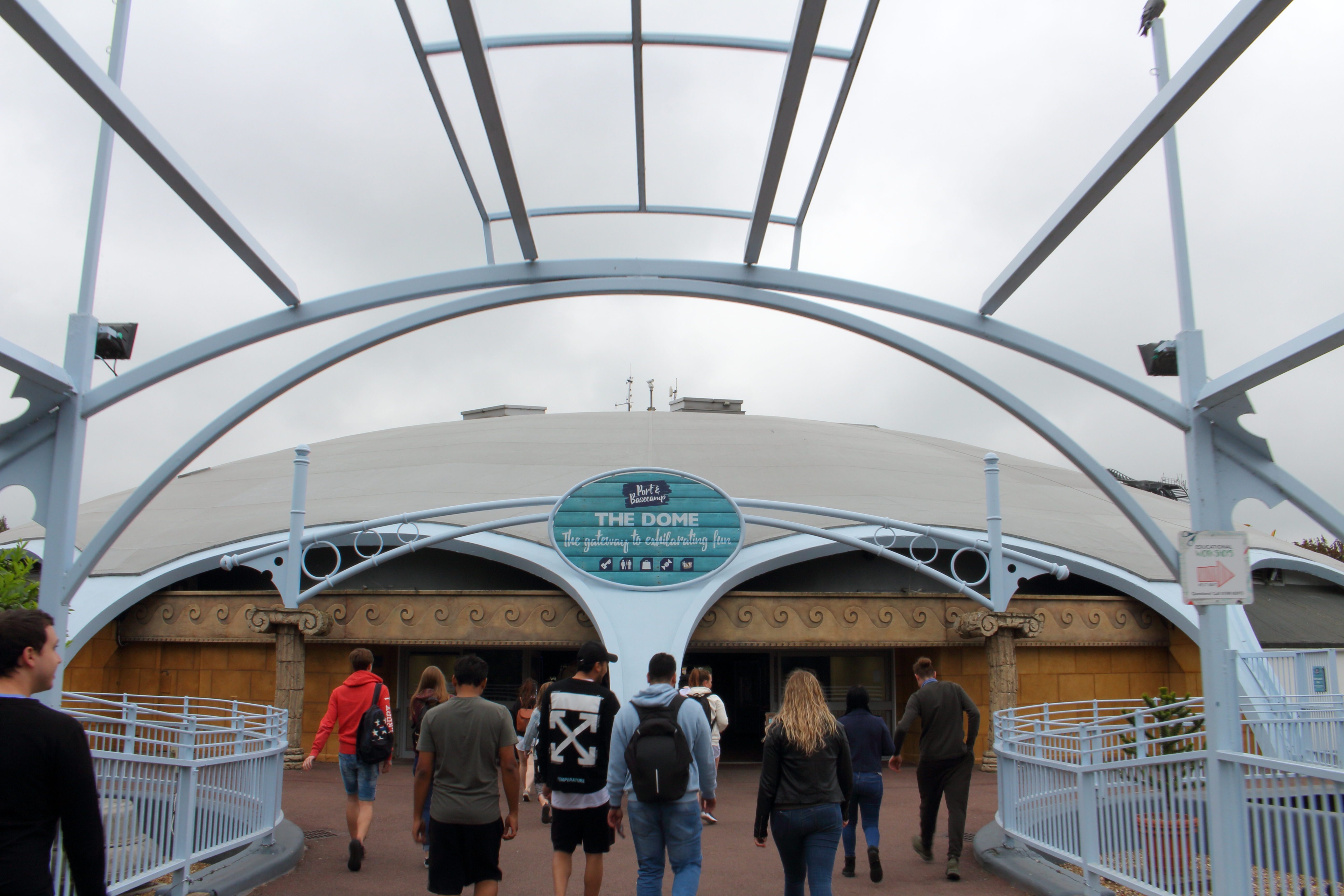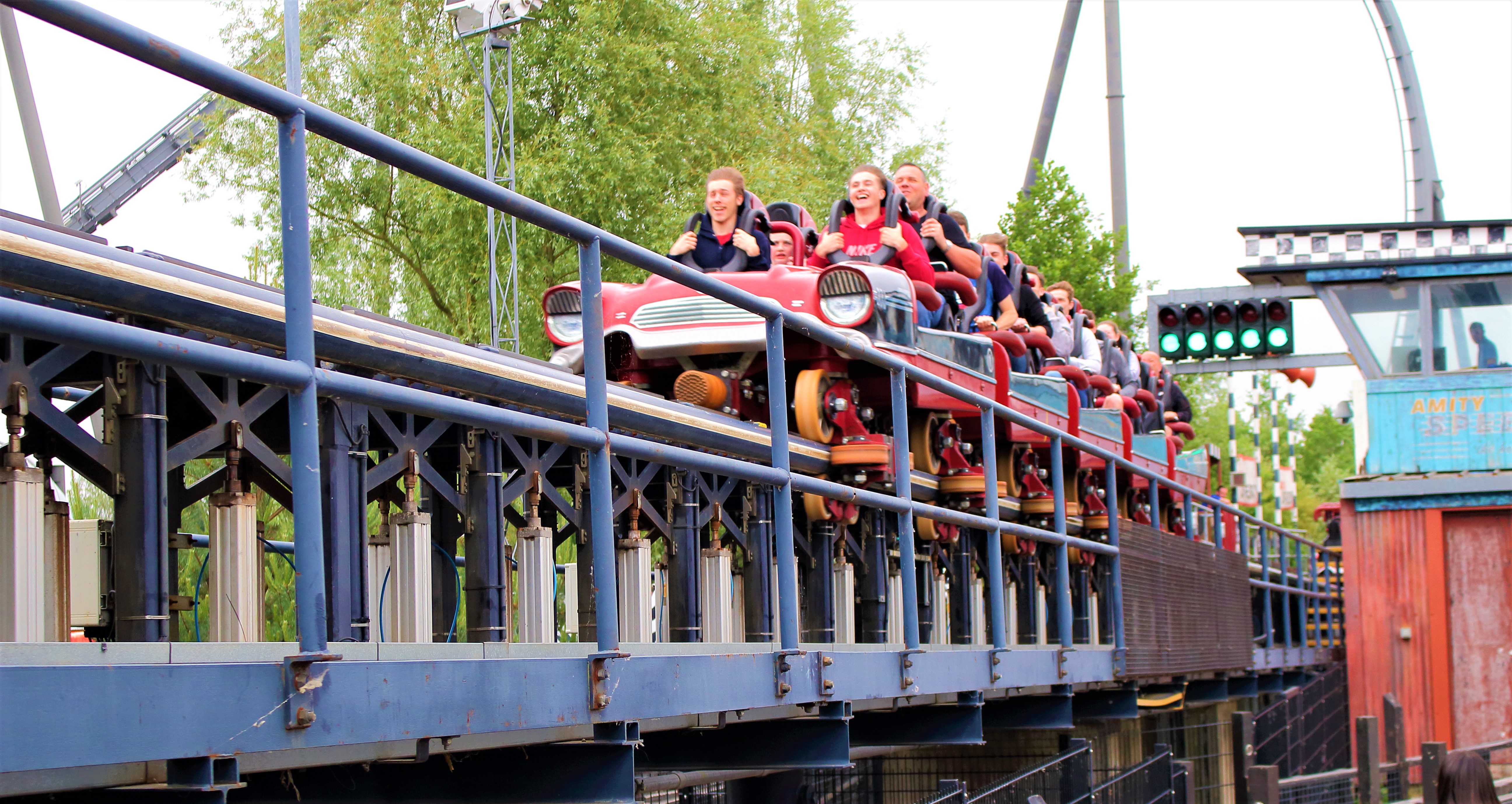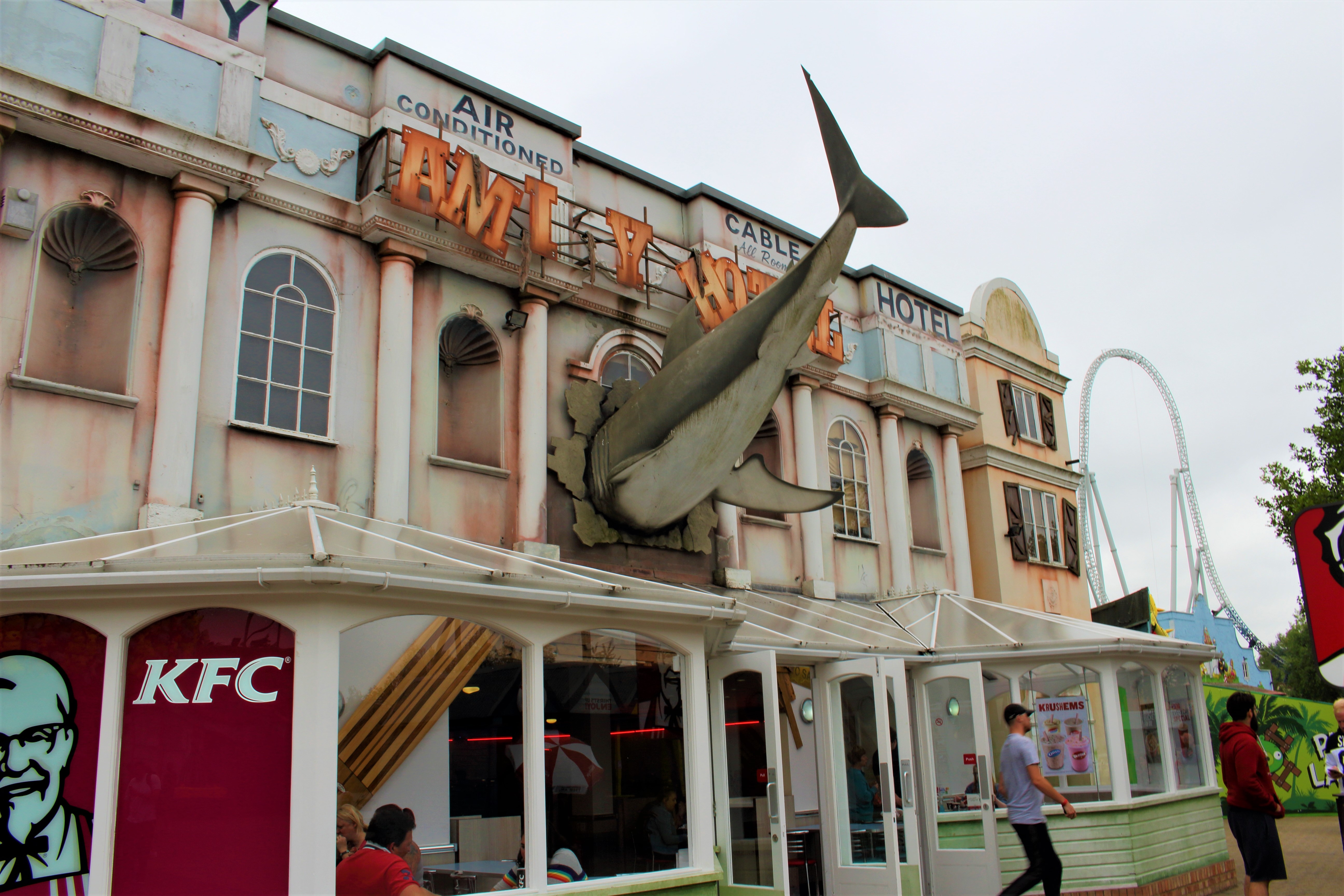 Auf der anderen Seite der Halle angelangt, thronte bei bestem englischem Wetter der Amity Beach mit seiner Bootsrutsche vor uns. Verständlich, dass wir bei den äußeren Bedingungen und der Fülle des Parks auf das Mitnehmen einer Badehose verzichtet haben.
