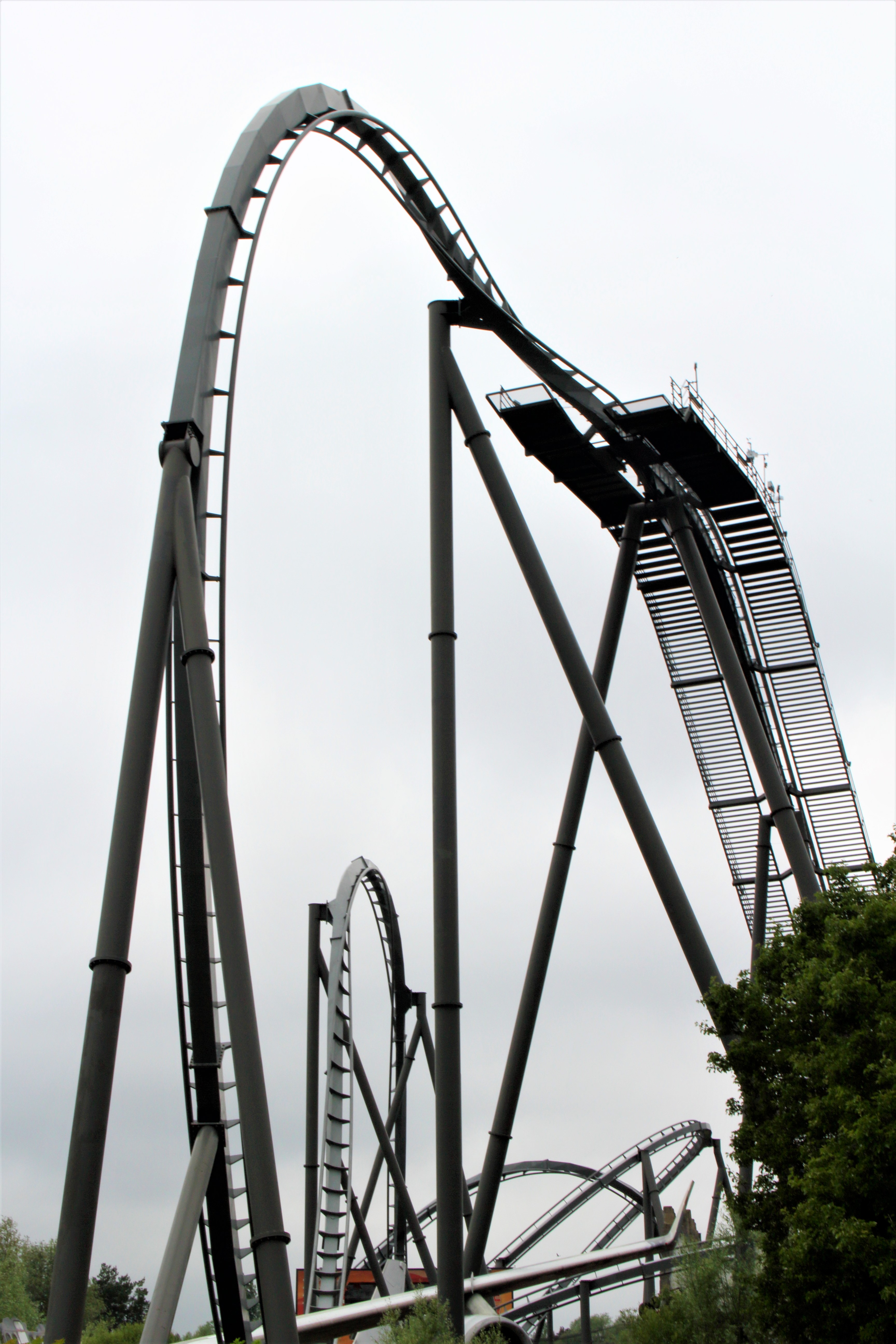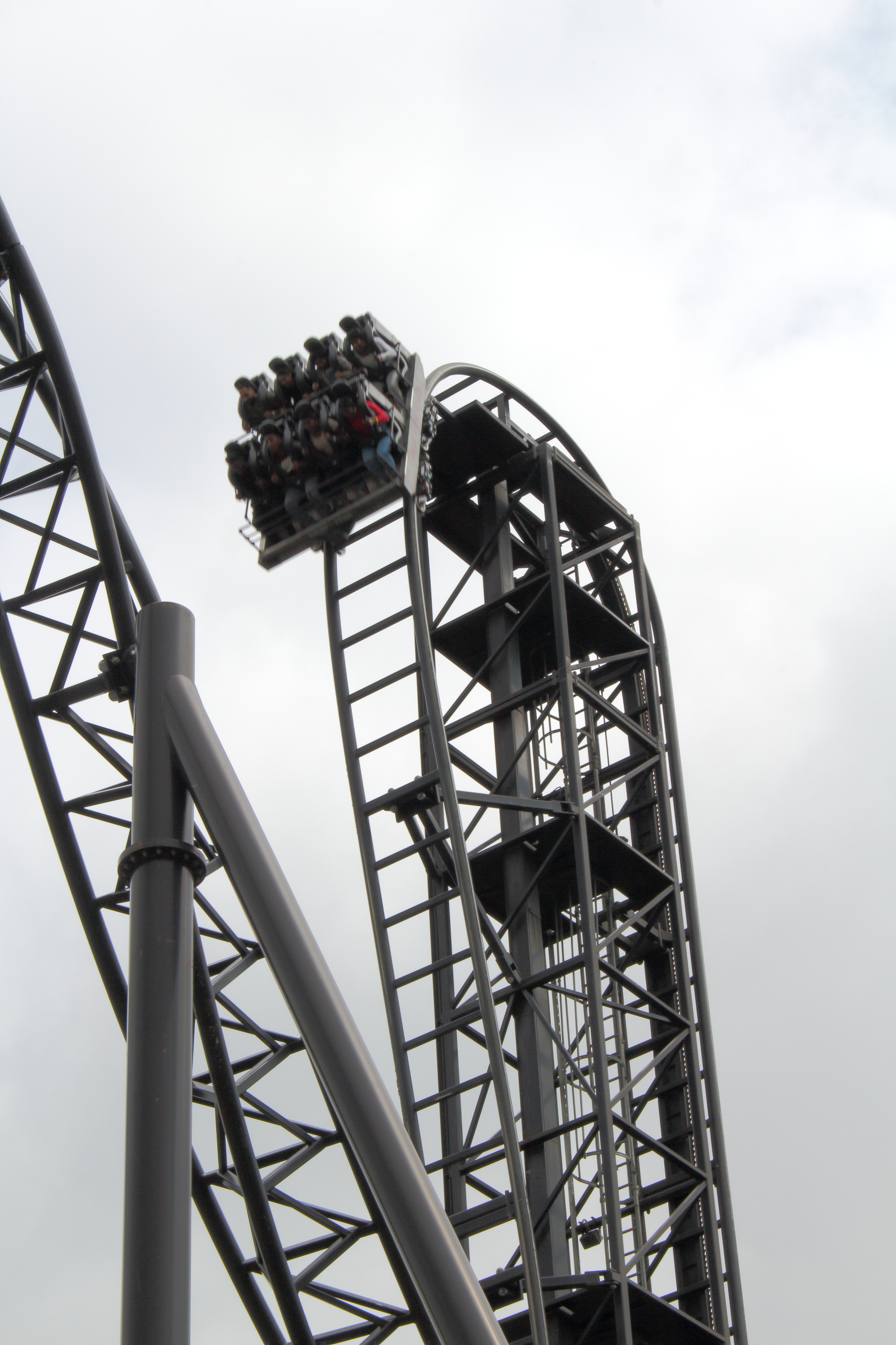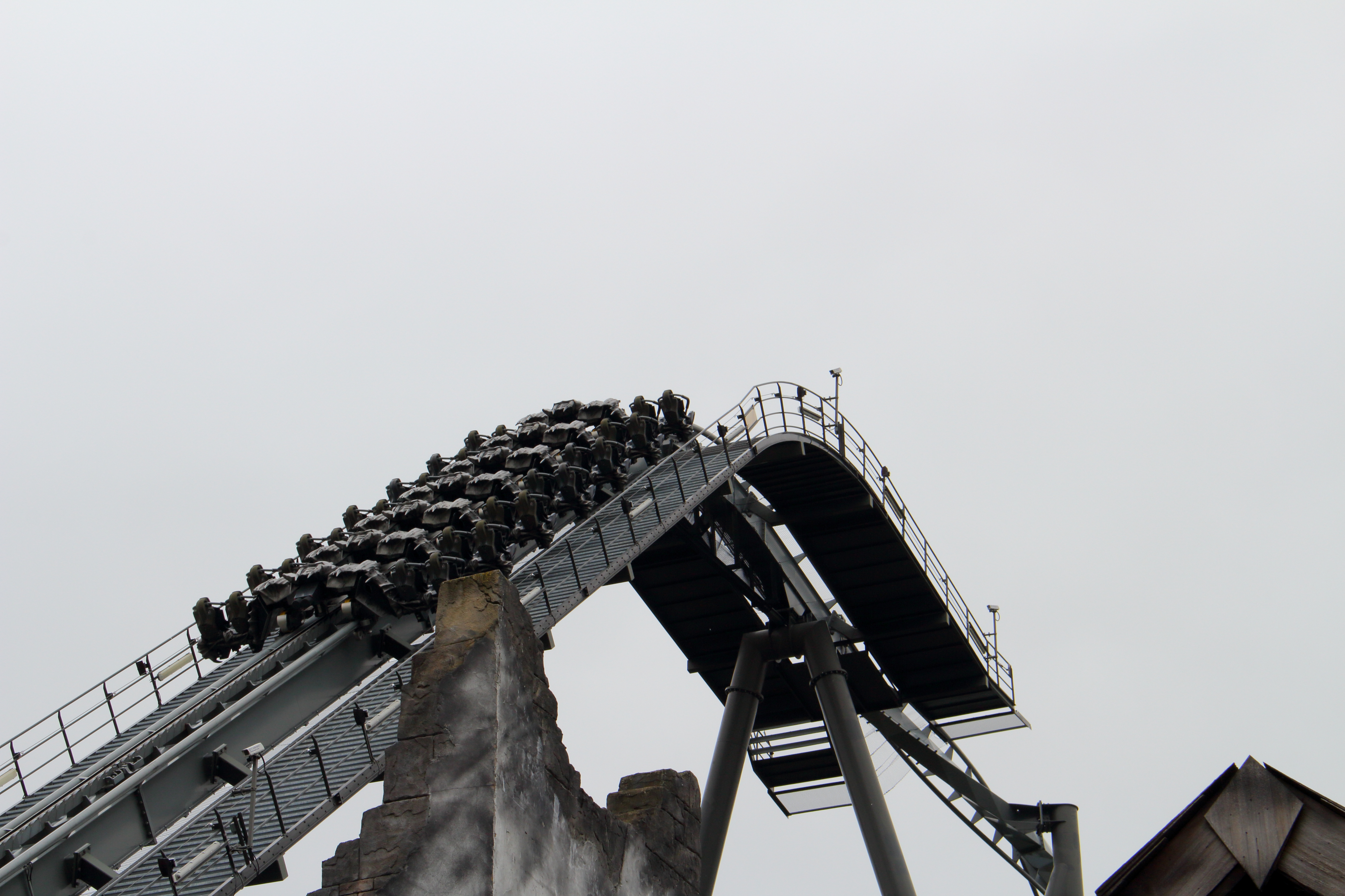 Im Anschluss geht es auf den 30 Meter hohen Lift, worauf eine 100° Abfahrt folgt, die einen wie auch schon die erste Abfahrt nach der Station in die Bügel dübelt.