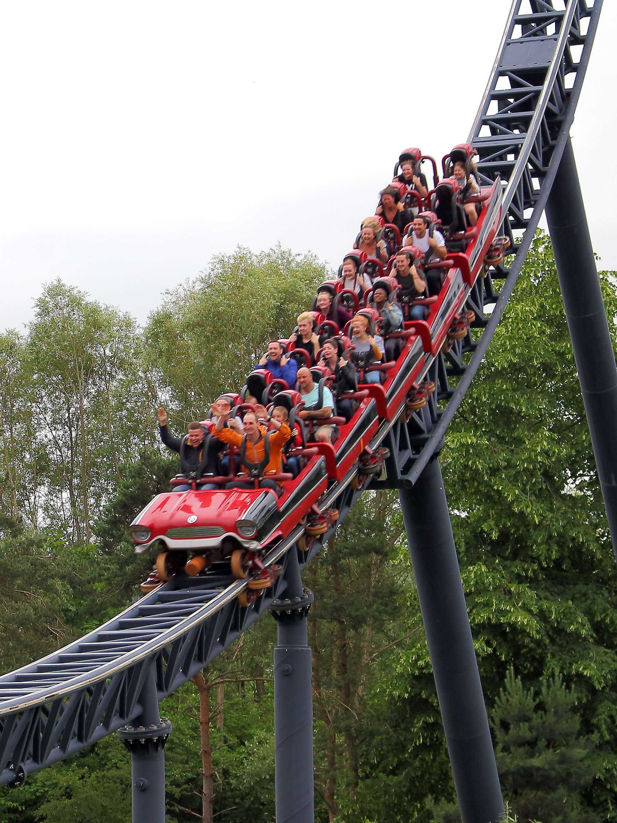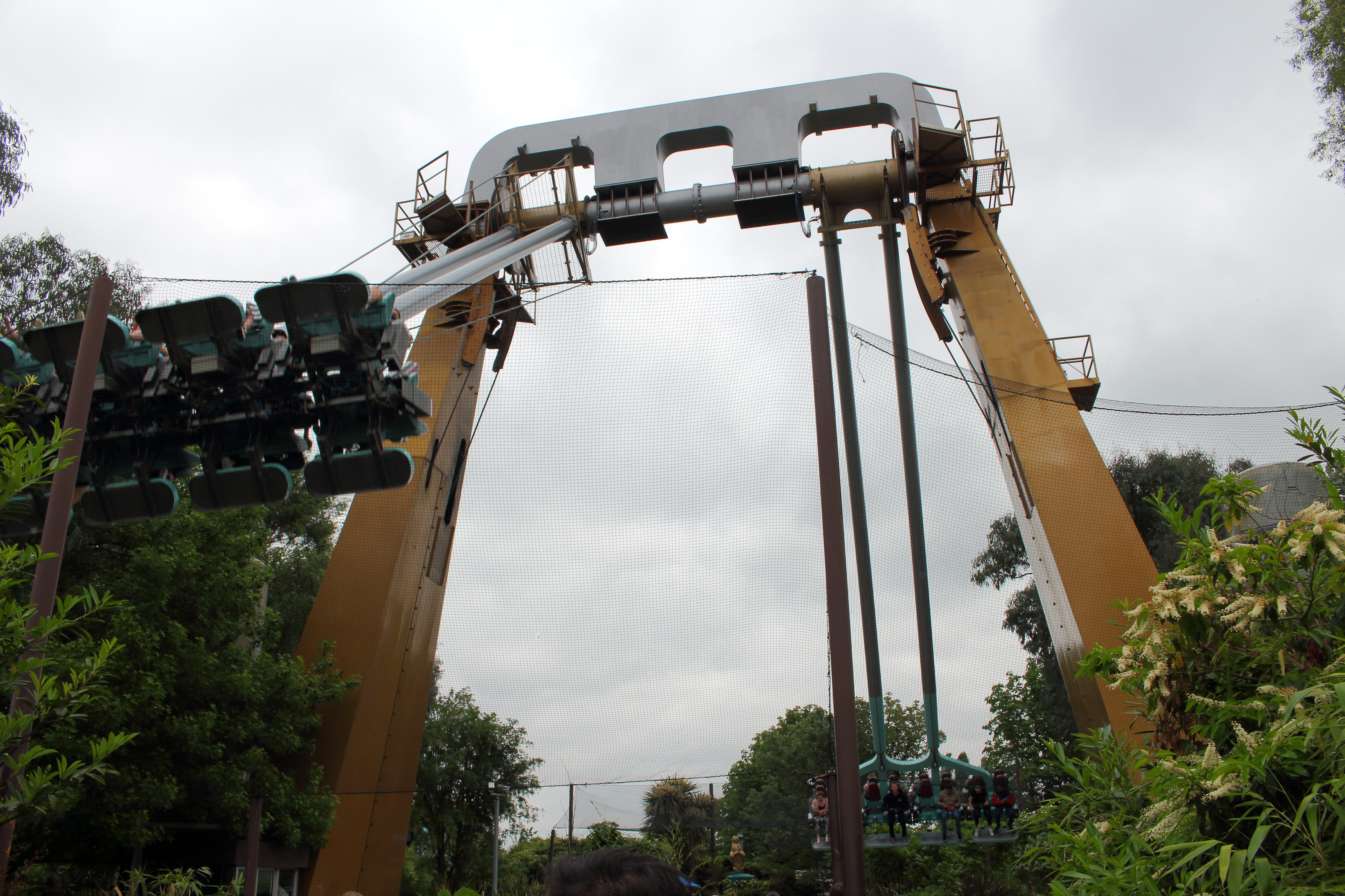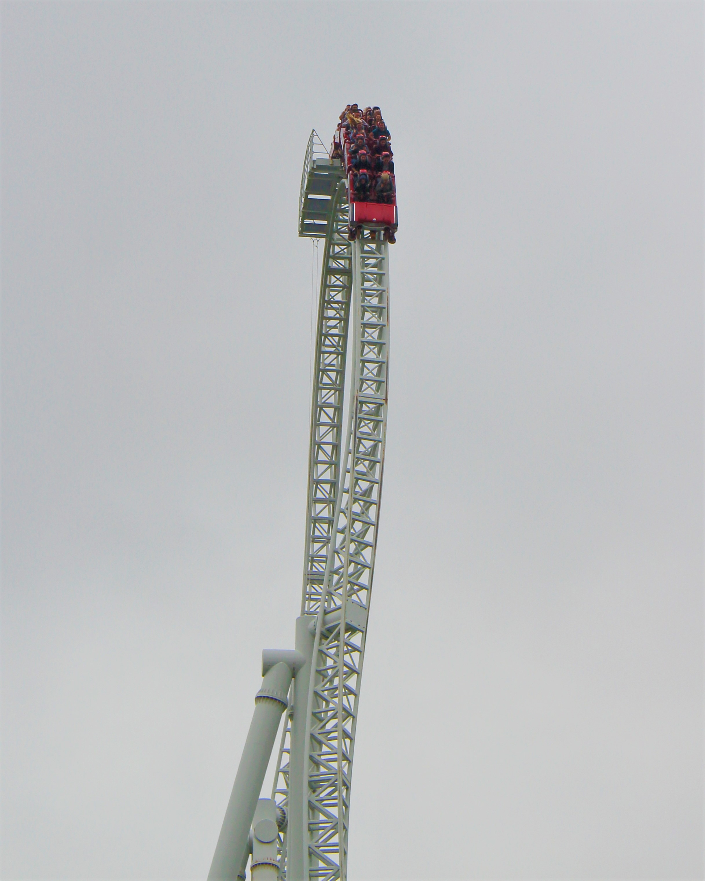 Im Anschluss geht es auf den 30 Meter hohen Lift, worauf eine 100° Abfahrt folgt, die einen wie auch schon die erste Abfahrt nach der Station in die Bügel dübelt.