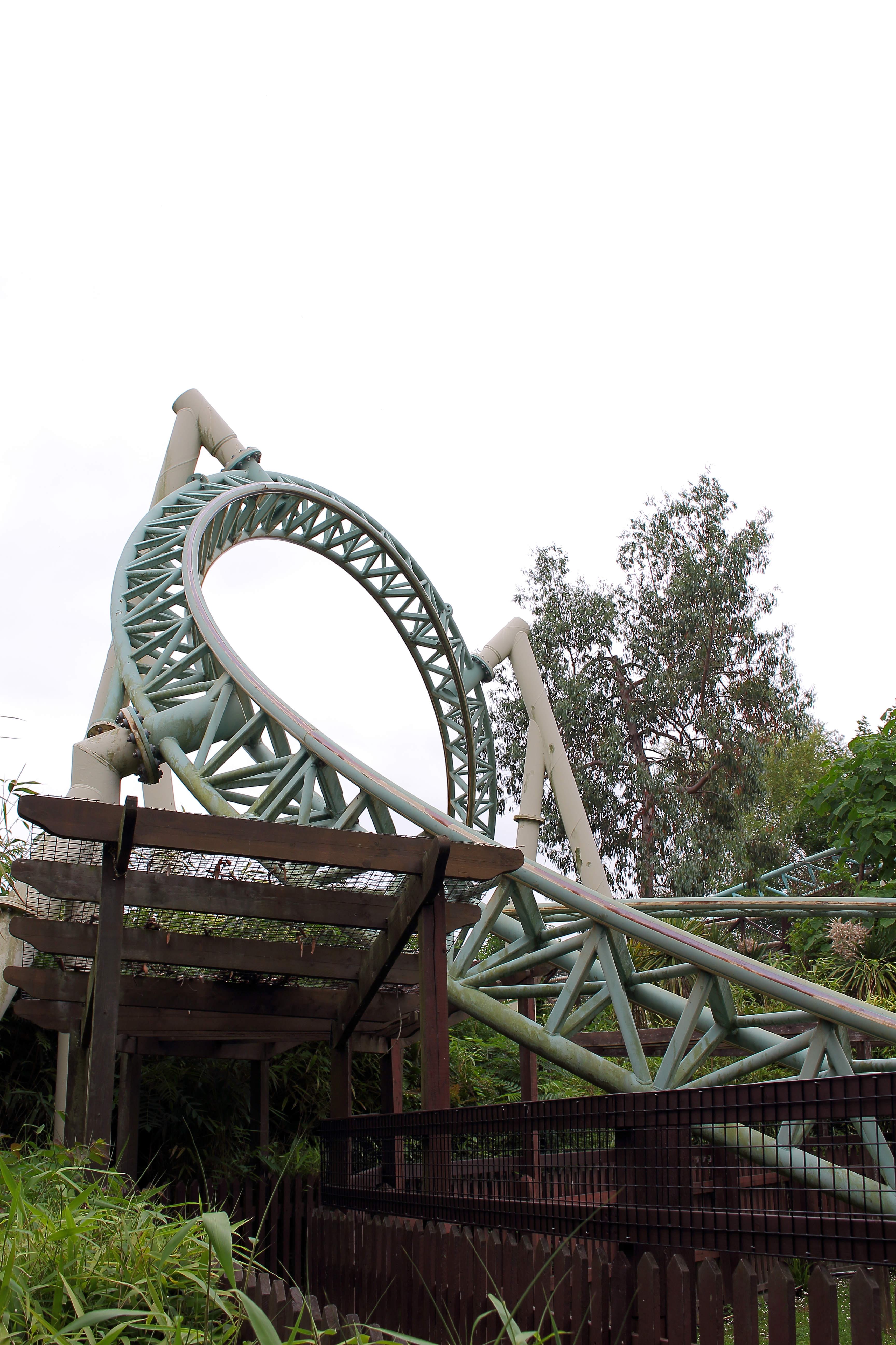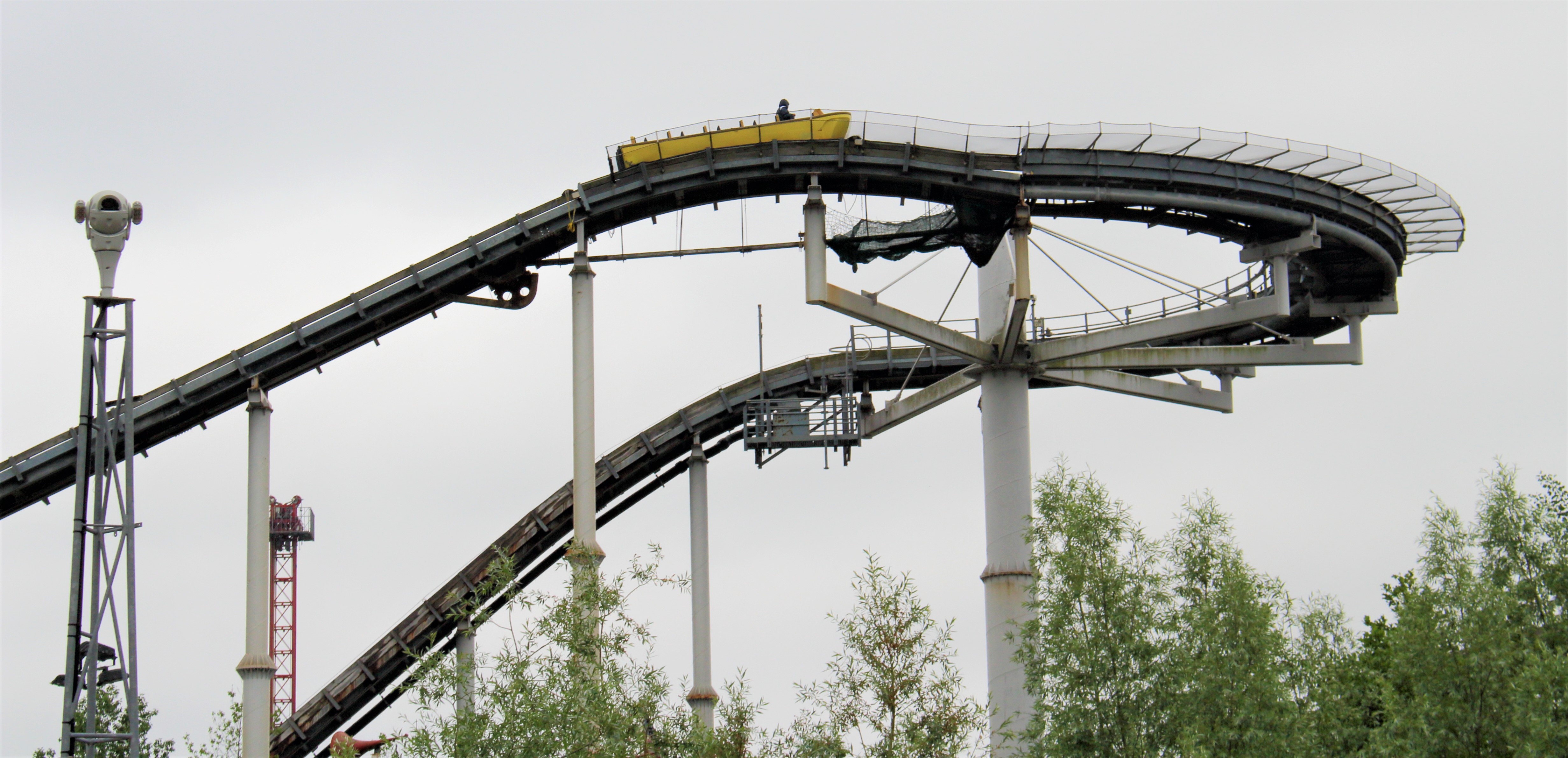 In der stark überneigten Linkskurve gibt es dann einen schönen Ausblick auf die verwaisten Überreste des Log Flumes.