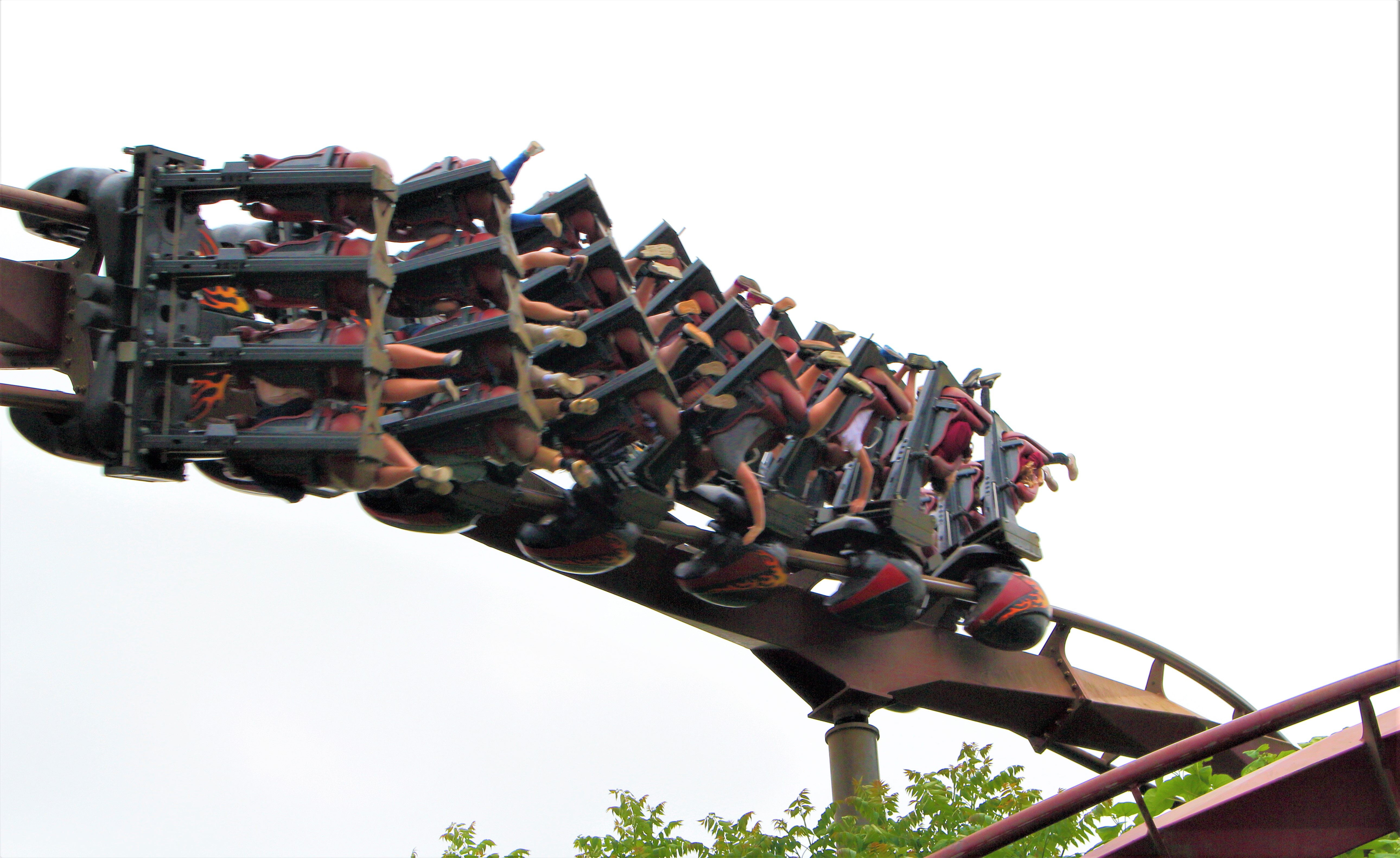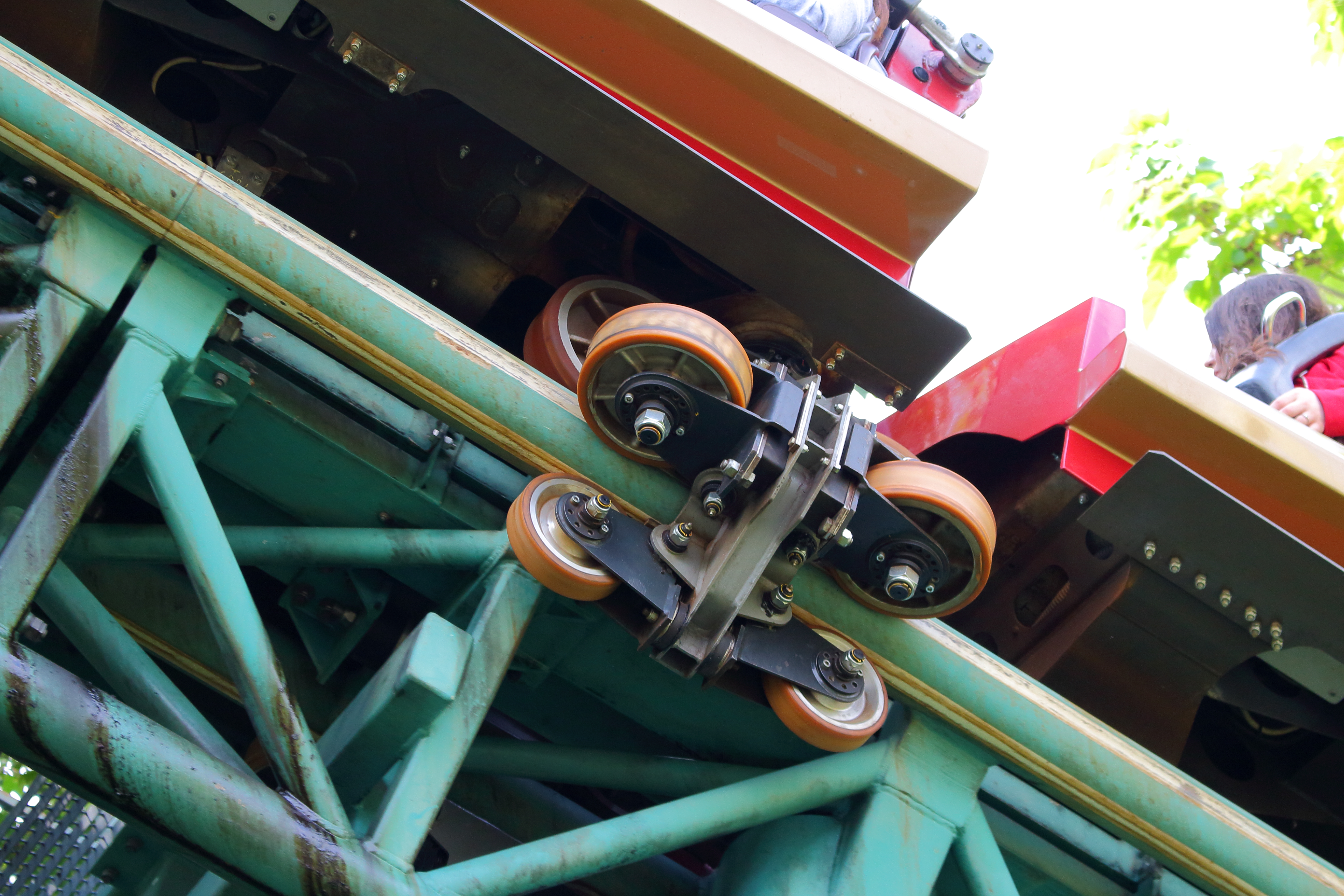 Auch hier ein Grund rechts zu sitzen, da diese 4 Rollen sich im Uhrzeigersinn drehen. Dadurch wird langsam das Gewicht auf die Schultern verteilt und der Sitz unterm Hintern weggezogen, bevor die Hangtime einsetzt. Die letzte Rolle entgegen dem Uhrzeigersinn wird dagegen mit etwas höherem Tempo durchfahren, wodurch für ein Plumpsen in den Bügel keine Zeit bleibt und einen der Sitz mehr durch die 360° Drehung durchknallt.