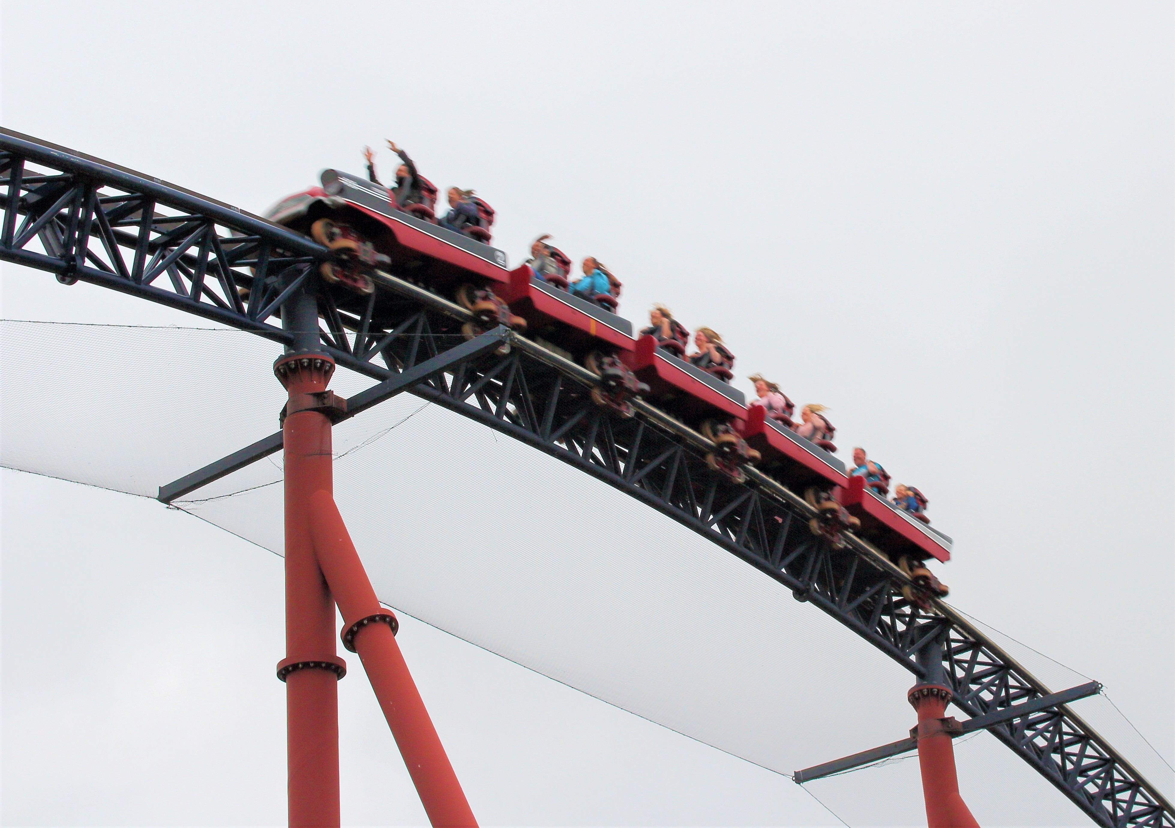 Was eine Bahn. Für das Alter nahezu butterweich und fast durchgehend mit hohem Tempo unterwegs. In der Station musste ich mir erstmal die paar Freudentränen wegwischen, die durch den Fahrtwind aus den Augen liefen. Zum Glück baut das Flamingoland eine Schwesterbahn, wenn auch die Version B mit nur 6 Wagen. Ohne Merlin sollte dort das Dauerfahren deutlich einfacher sein.