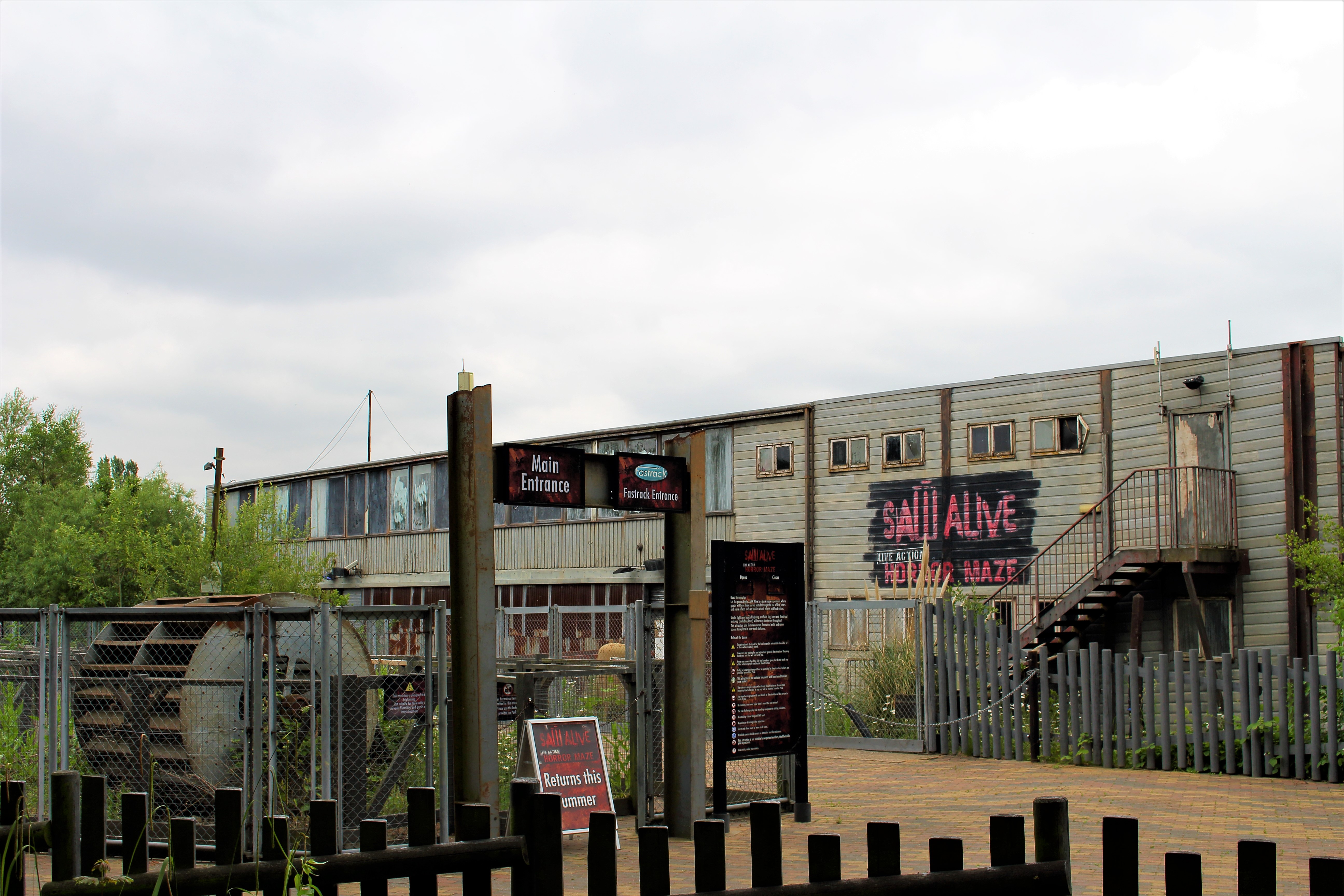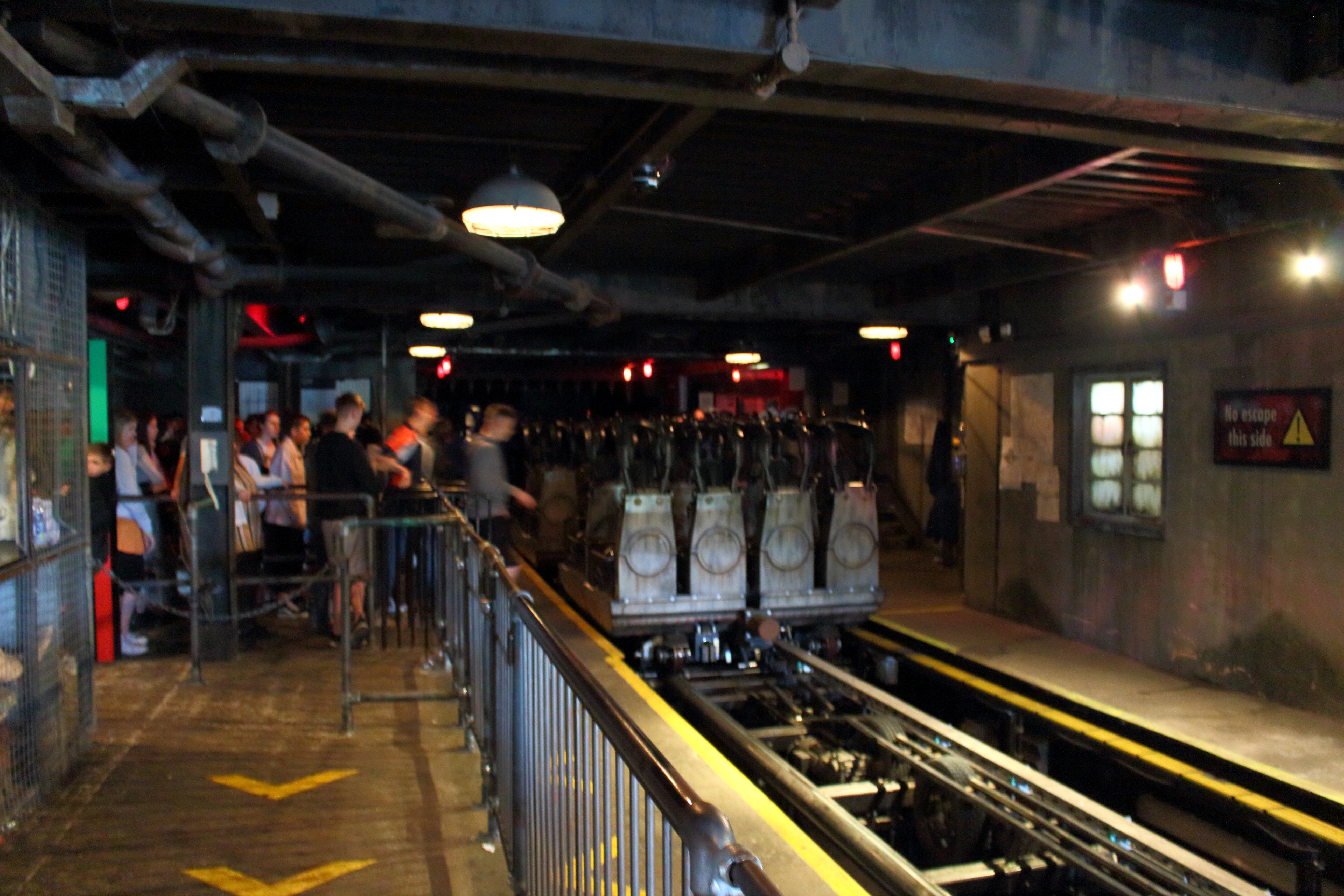 Und tatsächlich kam nach knapp 40 Minuten eine Durchsage, dass der Fahrbetrieb wieder aufgenommen wird und die bekannte SAW Musik setzte ein. Ich versuchte mir von Merlin nicht mehr den Tag vermiesen zu lassen und etwas in Stimmung zu kommen. Durch die hervorragende Informationspolitik haben vor uns schon etliche die Warteschlange verlassen. Dadurch, dass auch die Station komplett geräumt war, konnten wir durch die restliche Warteschlange flott laufen, wodurch mir die verbauten Effekte in dieser entgingen.