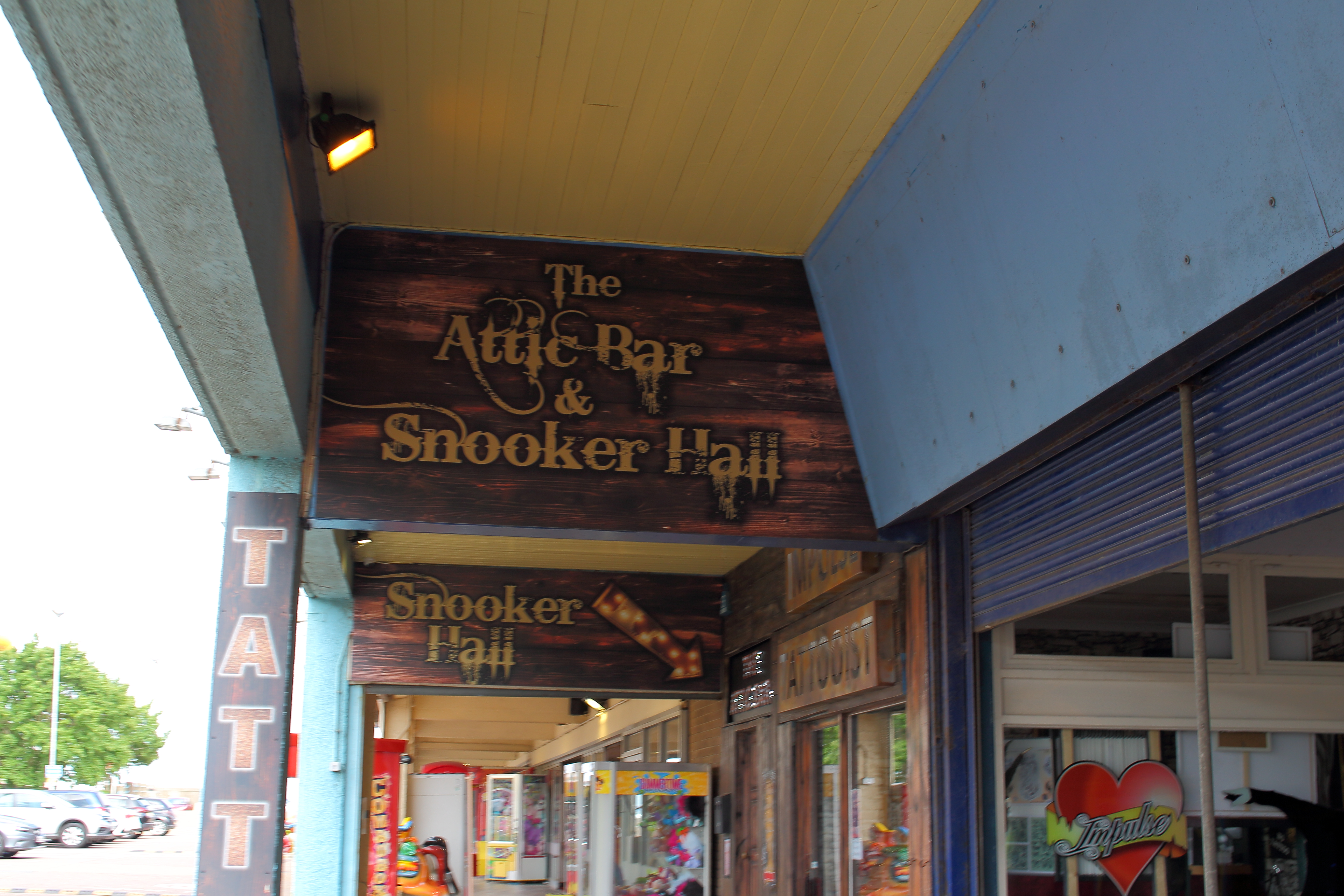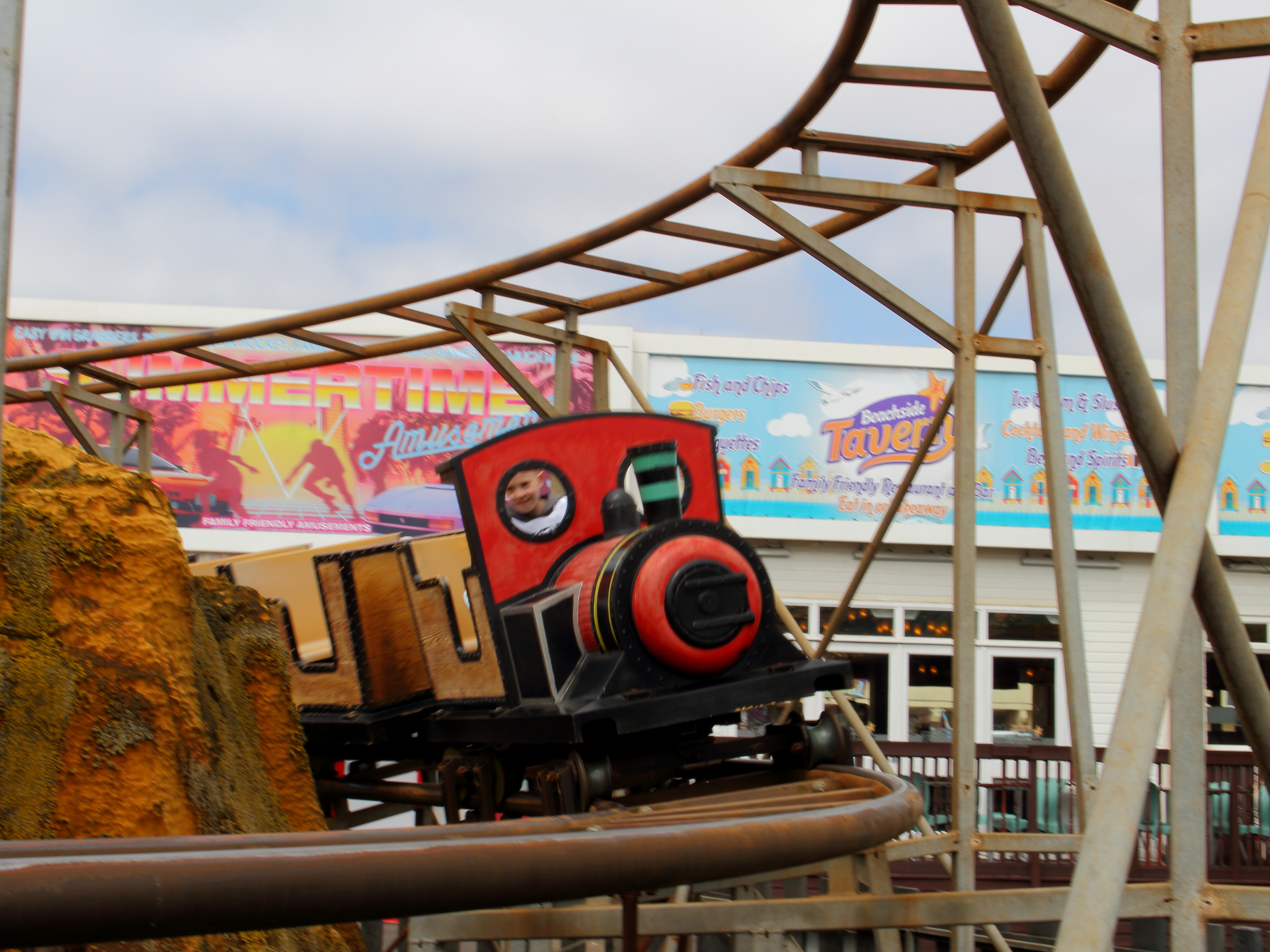 Bei den anderen begann sich nun langsam der Magen bemerkbar zu machen. Direkt hinter dieser Achterbahn findet sich die Beachside Tavern (im letzten Bild neben der Lok auch zu lesen), in die wir uns daher nun begaben. Da mich das Essen nicht so anlachte und ich nach unserem frühzeitigen Abgang aus Ingoldmells lieber noch ein wenig was fahren und dabei eine Fotorunde machen wollte, habe ich das Restaurant wieder verlassen und mich mit meinen Fressalien in der Tasche begnügt. Nach dem, was mir die anderen später berichtet haben, habe ich wohl aber auch nicht so viel verpasst.