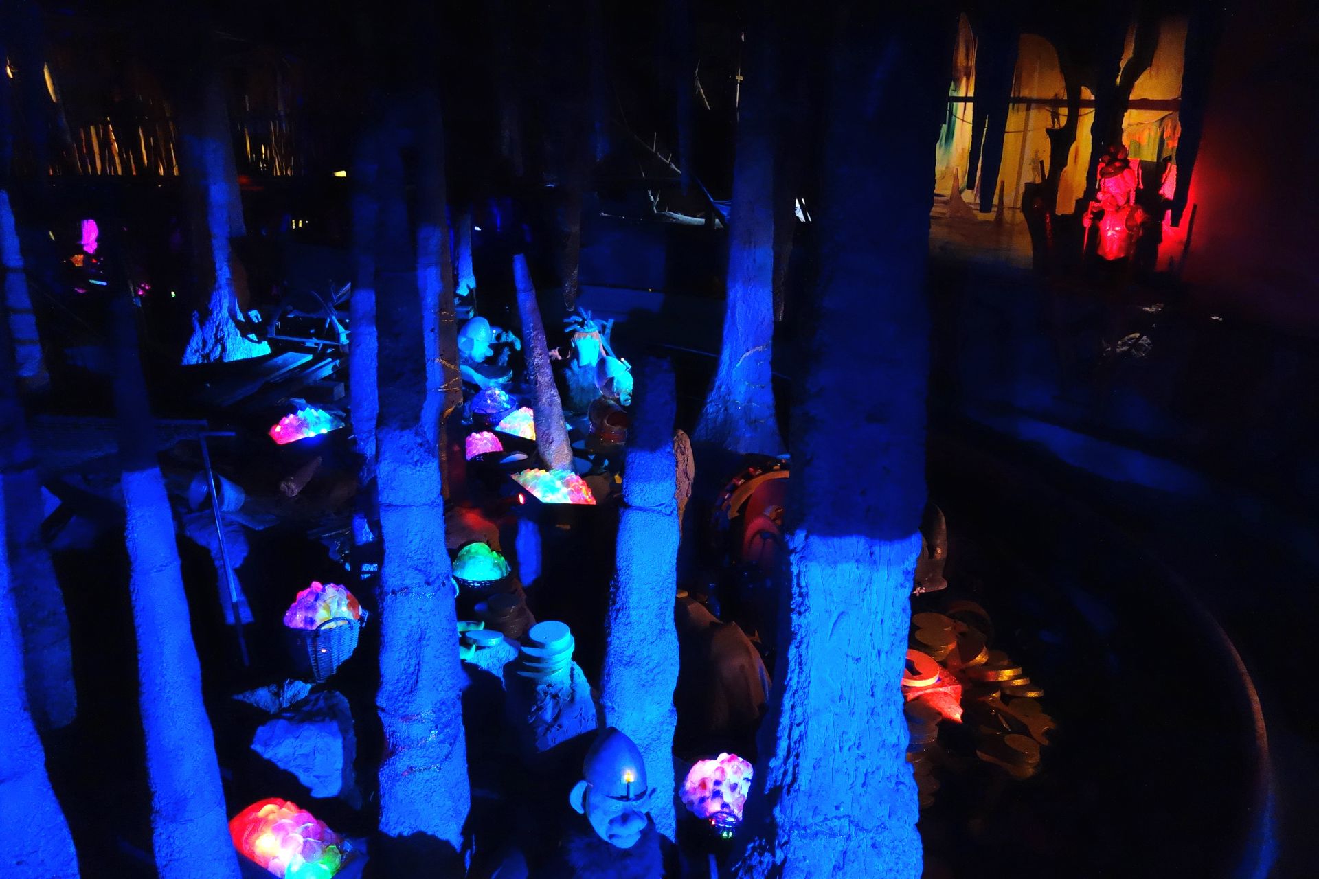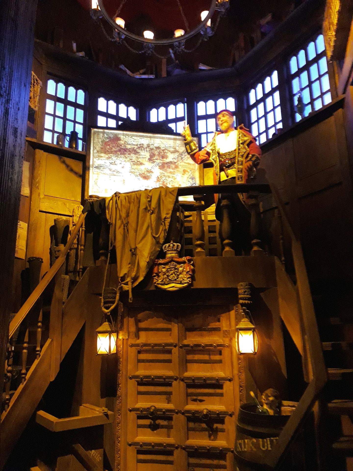 Dieser ist auf der Suche nach dem Feuertiger, einem der Legende nach Unverwundbarkeit verleihenden Dolch. Begleitet wird er dabei von seinem treuen Otter Jopie. Also ein ähnliches Gespann wie Sindbad mit seinem Baby-Tiger in DisneySea, wobei Jopie leider wirklich nur eine Begleitfigur ist und sich storytechnisch eher im Hintergrund aufhält. Und dann wäre da noch van Robbemonds größter Rivale, Diablo Cortez, der natürlich ebenfalls hinter dem Feuertiger her ist. Die Szenen während der Fahrt sind natürlich allesamt neu, einzelne Teile davon kommen einem aber durchaus bekannt vor. So versucht von Robbemond hier zur Abwechslung einem Affen die Schlüssel seiner Zelle zu entlocken. Ansonsten hat man es wie gesagt weitestgehend bei den klassischen Elementen eines Darkrides belassen. Zum Glück, denn die Leinwand zu Beginn der Fahrt direkt nach der Abfahrt konnte mich eher weniger begeistern. Sie ist zwar recht gut integriert, ich verstehe aber nach wie vor nicht, was die beiden sich offenbar duellierenden Schiffe im schnellen Vorbeirauschen zur Story beitragen sollen, wenn quasi direkt davor bereits das vermeintliche Ergebnis dieses Kampfes zu sehen ist. Das vorwiegend am Ende bei der Entdeckung des Feuertigers eingesetzte Videomapping macht sich dagegen deutlich besser. Unverzichtbar war natürlich auch die finale Fahrt um die Bühne des angeschlossenen Restaurants Bamboe Baai. In der neuen Version hat man hier allerdings doppelstöckig gebaut. Die Bühne selbst liegt nun erhöht, sodass sie eher den Gästen im Restaurant vorbehalten ist. Aus dem Boot heraus muss man sich je nach Sitzplatz schon etwas strecken, um wenigstens die Randbereiche einsehen zu können. Dafür hat man unter der Bühne eben noch eine kleine Insel mit Hängematte und Schatztruhe untergebracht. Leider ohne weiteren Bezug zum Rest der Fahrt und auch gänzlich ohne Bewegung - die findet ja eben eine Etage weiter oben statt. Mehr möchte ich nun aber auch nicht zur Fahrt verraten. Ich kann nur sagen, dass der Wiederaufbau der Piraten in Batavia absolut gelungen ist. Auch wenn es offensichtlich ein komplett neuer Ride mit neuer Geschichte und neuer Gestaltung ist, konnte der Flair der alten Piraten durchaus ins neue Jahrtausend überführt werden. Potential für Verbesserungen gibt es natürlich immer, aber im Großen und Ganzen bin ich erstmal froh, dass sich der Europa Park dazu entschieden hat, dem klassischen Darkride treu zu bleiben. Somit sind die Piraten auch in Zukunft wieder ein Pflichtprogramm bei jedem Besuch des Parks. Und sicherlich wird man hier und da in den kommenden Jahren auch noch ein paar Dinge anpassen und verbessern.