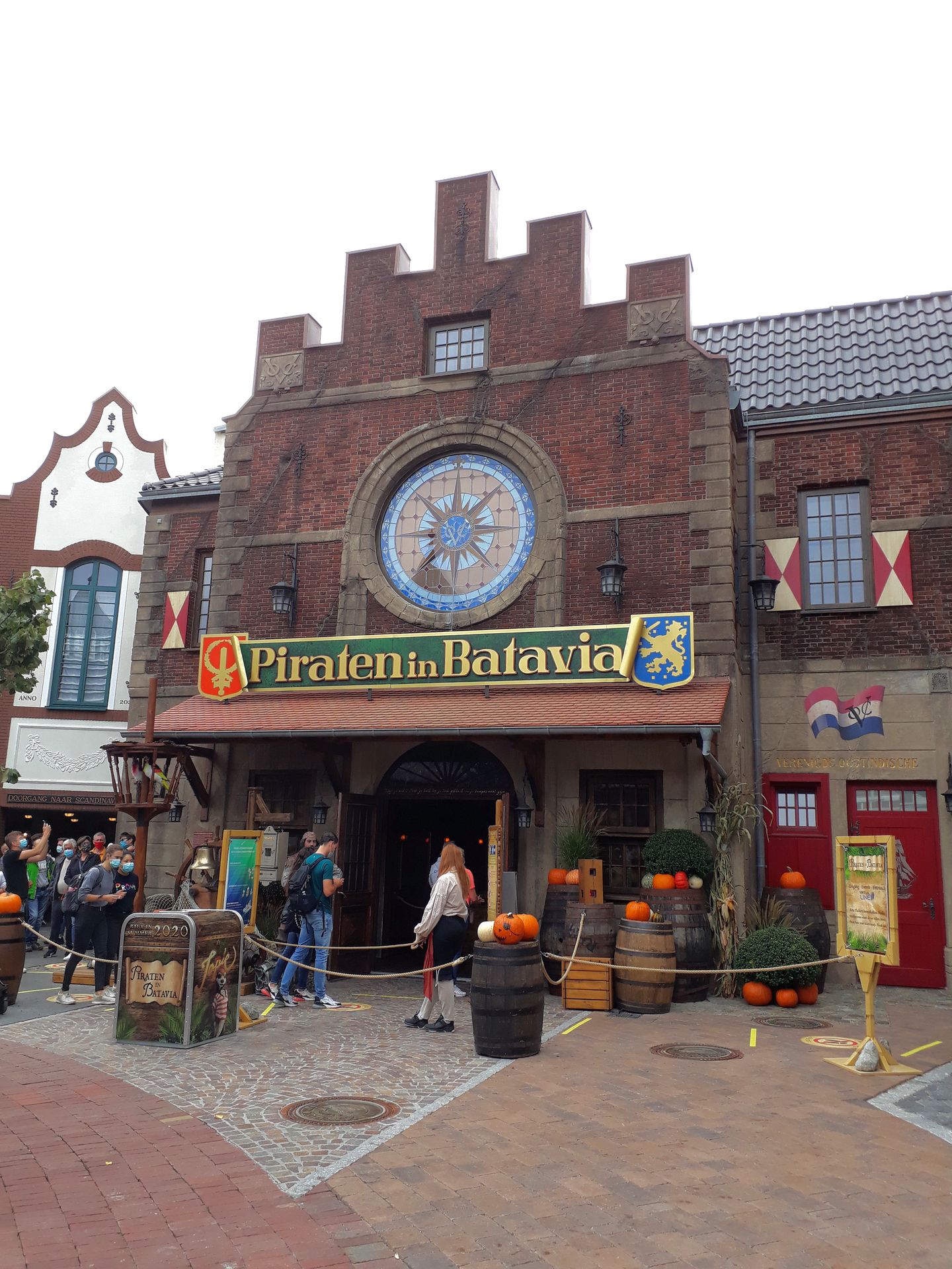 Es freut mich sehr, dass man sich nach dem Großbrand 2018 relativ schnell dazu entschieden hatte, die Piraten in Batavia neu aufzubauen. Dass der Darkride bereits nach gut zwei Jahren schon wieder für die Besucher freigegeben wurde, muss man dem Europa Park hoch anrechnen. Zumal man nicht einfach nur die alten Pläne aus der Schublade gekramt und einen simplen 1:1-Nachbau realisiert hat, sondern die durchaus schon leicht angestaubte Bootsfahrt bei dieser Gelegenheit auch auf den neuesten Stand der Technik gebracht und mit einer komplett neuen Story versehen hat. Und das ohne die Seele der Piraten in Batavia durch den übermäßigen Einsatz neuer Medien zu zerstören. Stattdessen hat man wieder auf über 100 Animatronics gesetzt, welche die Geschichte in klassischer Art und Weise präsentieren. Durchaus ein Wagnis, denn bei meinen Besuchen vor dem Brand habe ich bei den Piraten nie wirkliche Wartezeiten erlebt. Dass wir nun - natürlich vorwiegend aufgrund der Corona-Abstände - das Ende der Warteschlange außerhalb der Halle suchen mussten, spricht dafür, dass sich der Wiederaufbau gelohnt hat. Gleich neben dem Eingang führt eine Passage zwischen eben jenem und den Junior Club Studios hindurch zum Eingang des Skandinavischen Dorfs. Von dort führten die Markierungen des erweiterten Wartebereichs zurück zum Fliegenden Holländer, dann runter zum See und schließlich zum Luxemburger Platz. An zwei Stellen wurden dabei Laufwege der übrigen Besucher gekreuzt, sodass Mitarbeiter die Warteschlange dort stoßweise durchlassen mussten. Wir trafen das Ende der Schlange schließlich vor der Spielhalle Speel Deel. Bis zurück zum Eingang brauchten wir aber nur wenige Minuten, die Schlange bewegte sich stetig voran.