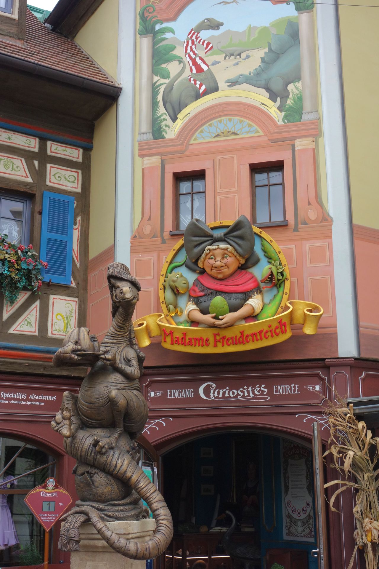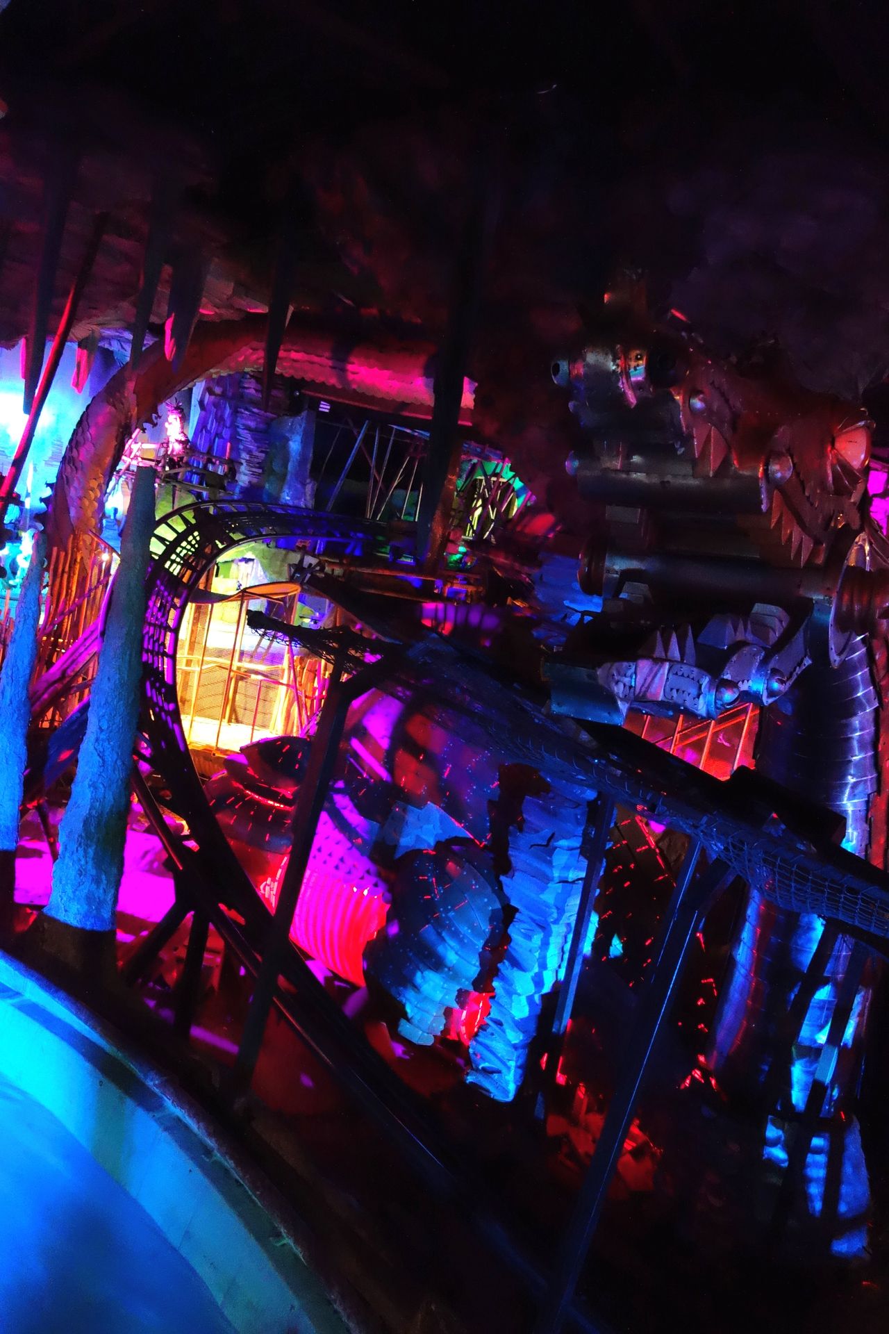 Wobei ich hier tatsächlich eher weniger von Umgestaltung sprechen würde. Im Grunde wurde die ursprüngliche Thematisierung beibehalten und lediglich mit dem neuen Thema ergänzt. Ein Hut, ein Schal, oder auch mal ein Strickpullöverchen für die Dinos, eine Wäscheleine quer durch die Halle, der T-Rex versucht sich als Imker, und ein paar Raptoren toben sich neuerdings in der Küche der Madame Freudenreich aus. Den Abschluss bildet eine kleine Geburtstagsparty mit kuchenfressenden Sauriern und endlich auch der Namensgeberin. Das ist ja soweit alles ganz putzig gemacht, aber wirklich passend finde ich es nicht. Die Dinos hatten ja noch nie etwas mit Frankreich zu tun, da wäre es doch sinniger gewesen, sie komplett rauszuschmeißen und dem Darkride ein gänzlich neues Thema zu verpassen. Wäre natürlich etwas aufwändiger gewesen, aber das hätte ja auch nicht zwingend zusammen mit der Umgestaltung der Eurosat angegangen werden müssen - auch wenn es sich natürlich anbot.