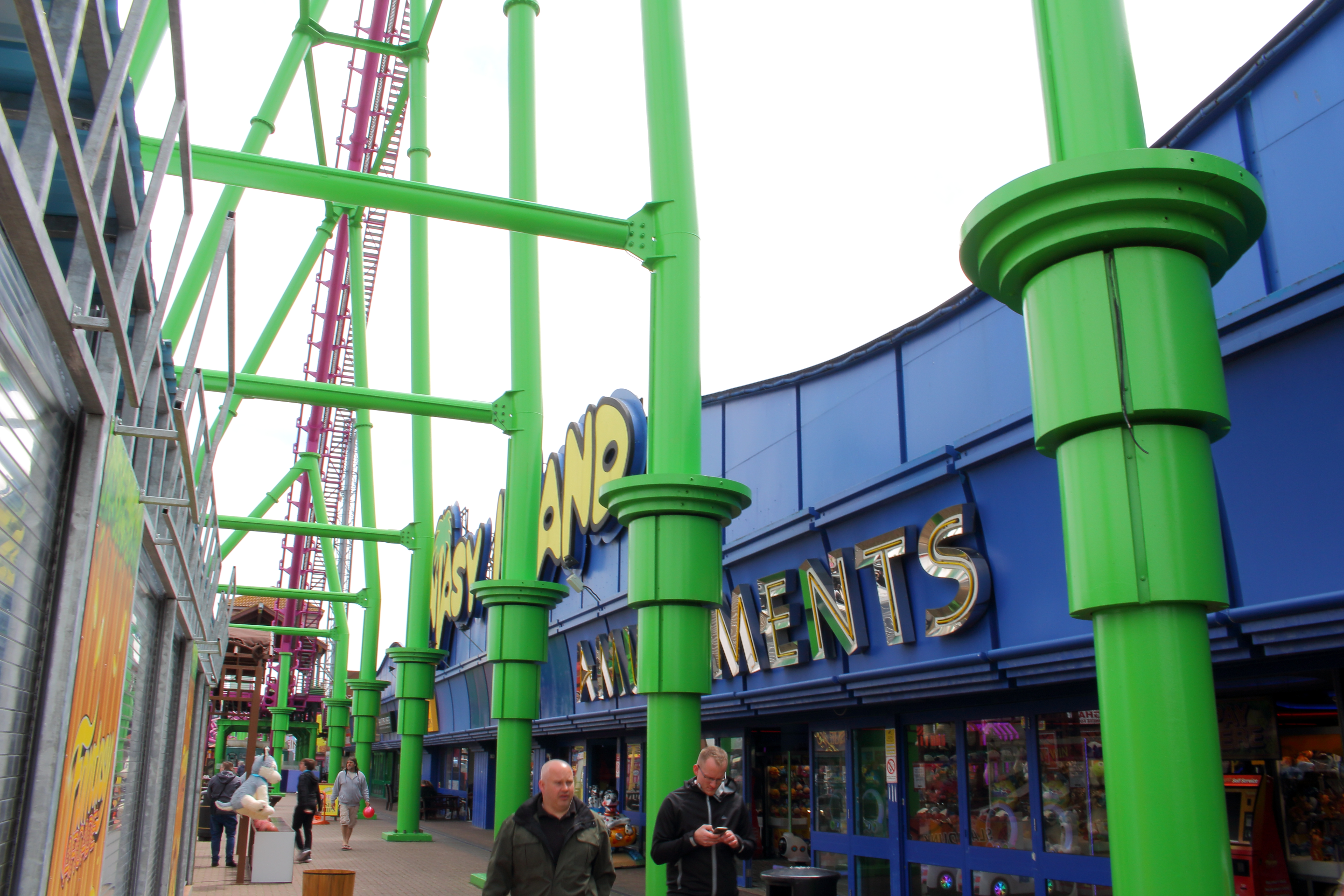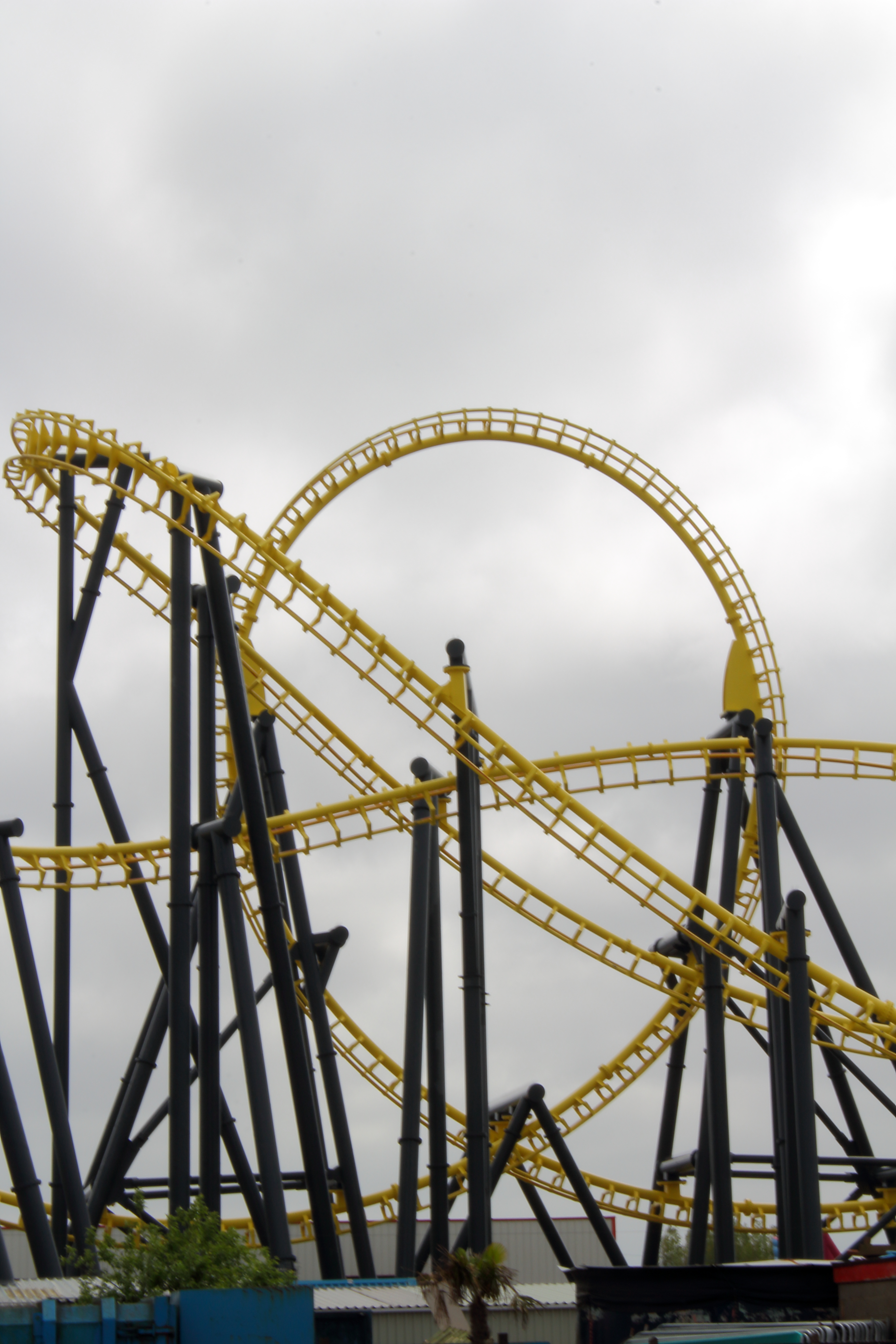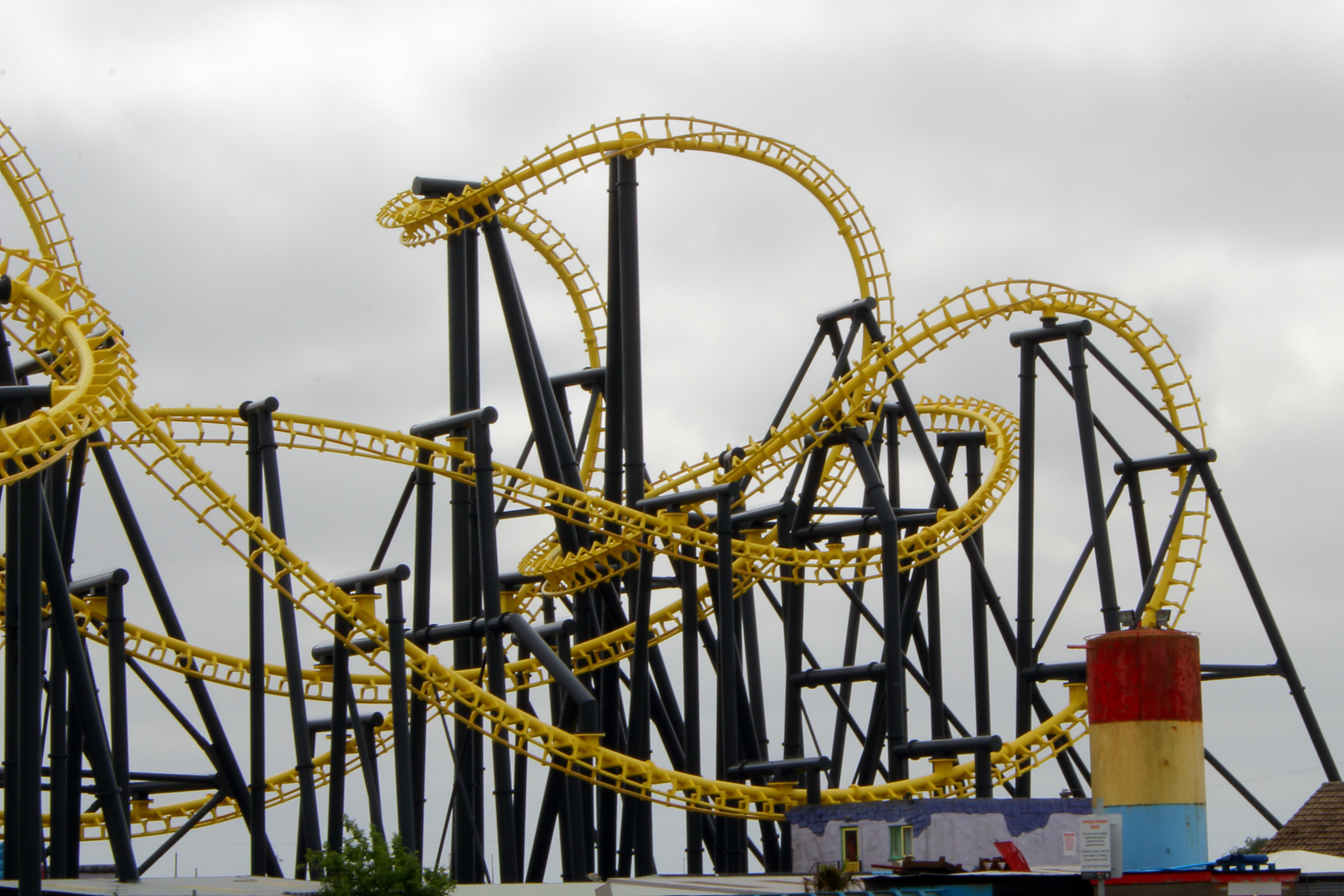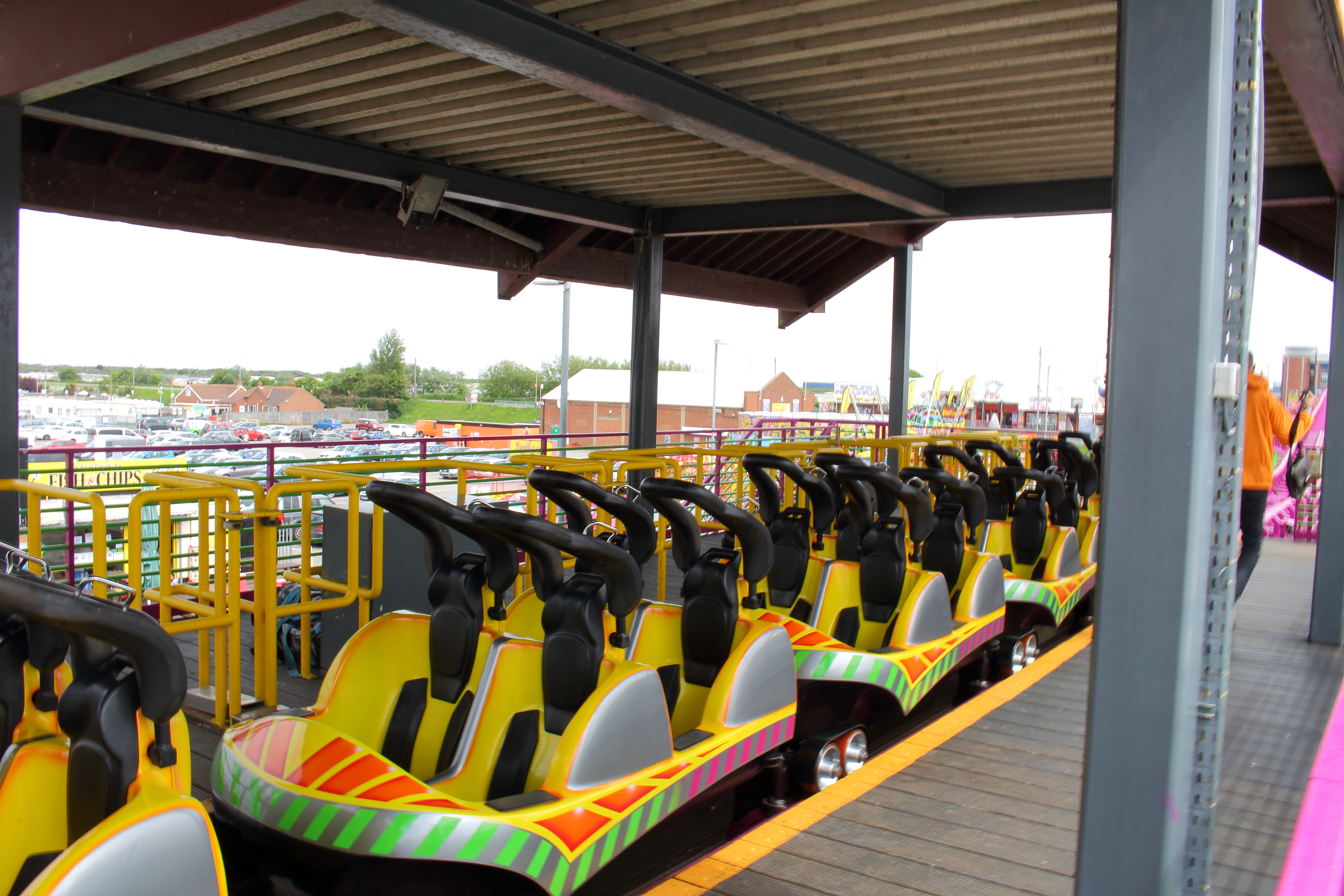 An der Küste entlang und mit ganz viel gelb lackierten Stahl vor den Augen fuhren wir unsere beiden Autos entspannt in Richtung Norden nach Ingoldmells. Das dortige Fantasy Island würde nämlich früher öffnen, als der Pleasure Beach in Skegness. Über eine kleine Zufahrt im äußersten Süden des Parks erreichten wir um 10:40 Uhr den großen Parkplatz. Aus dem Auto ausgestiegen, mit Küstenluft in der Nase, erhoben sich vor mir zwei riesige niederländische Stahlbauten in die Höhe.