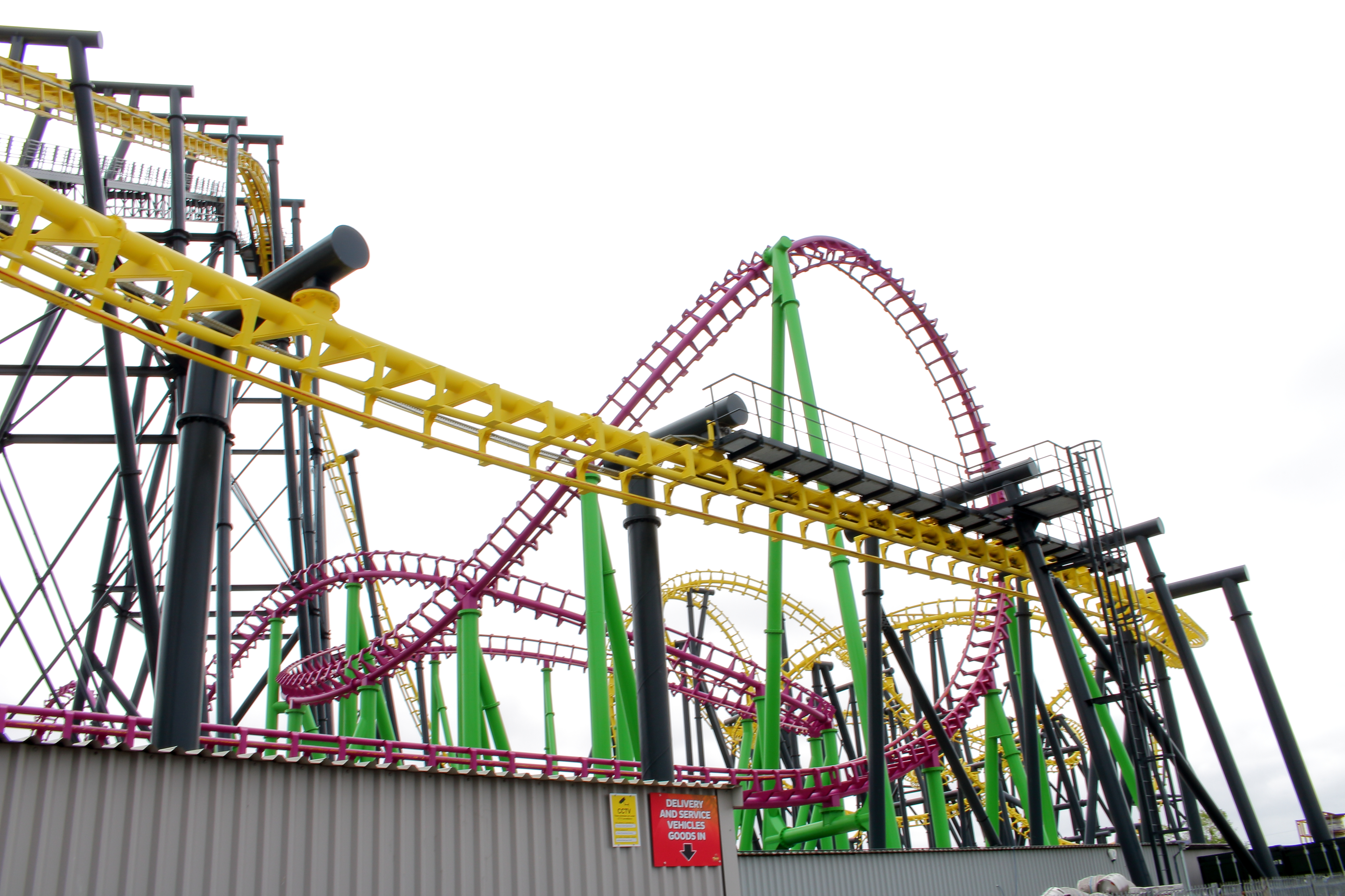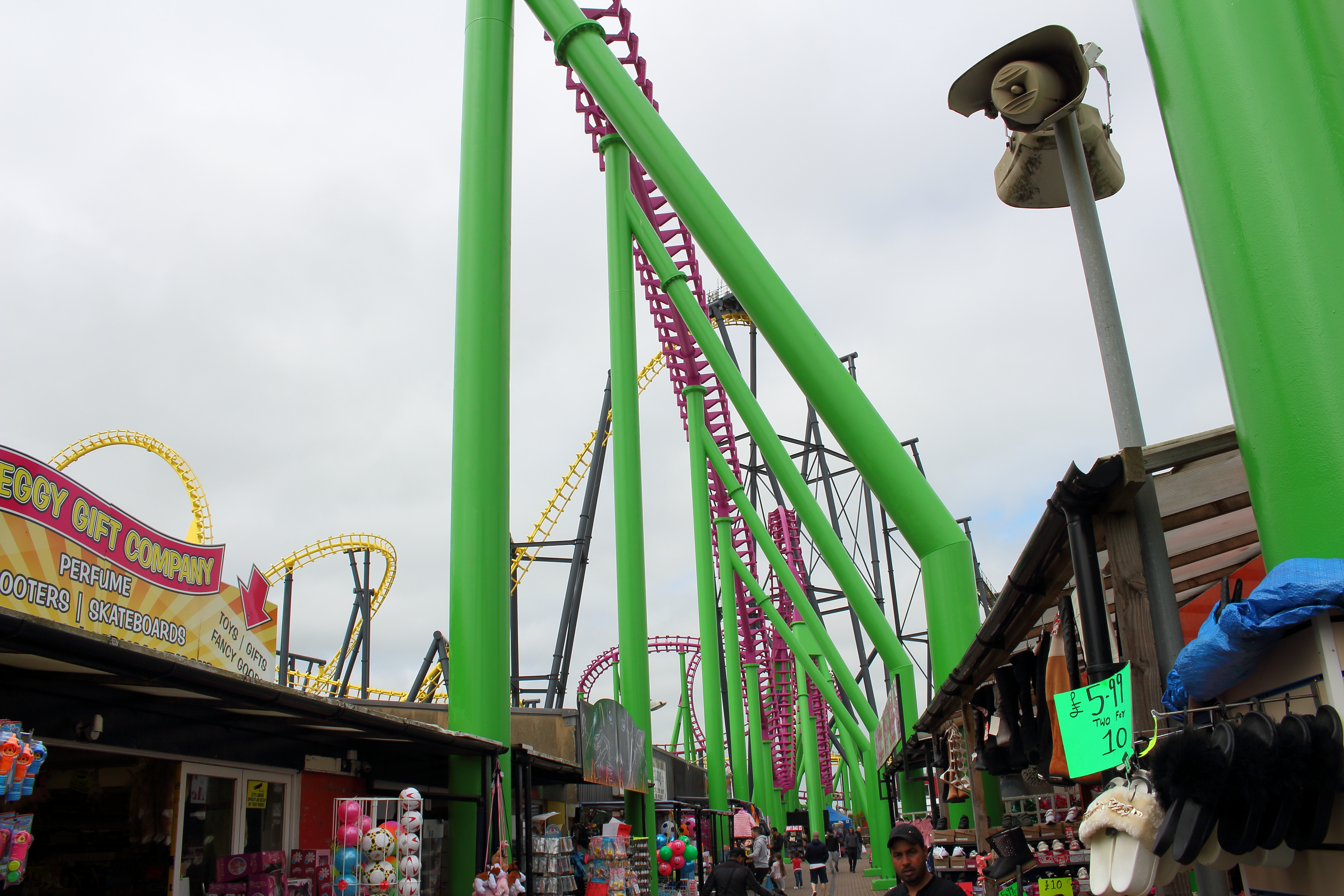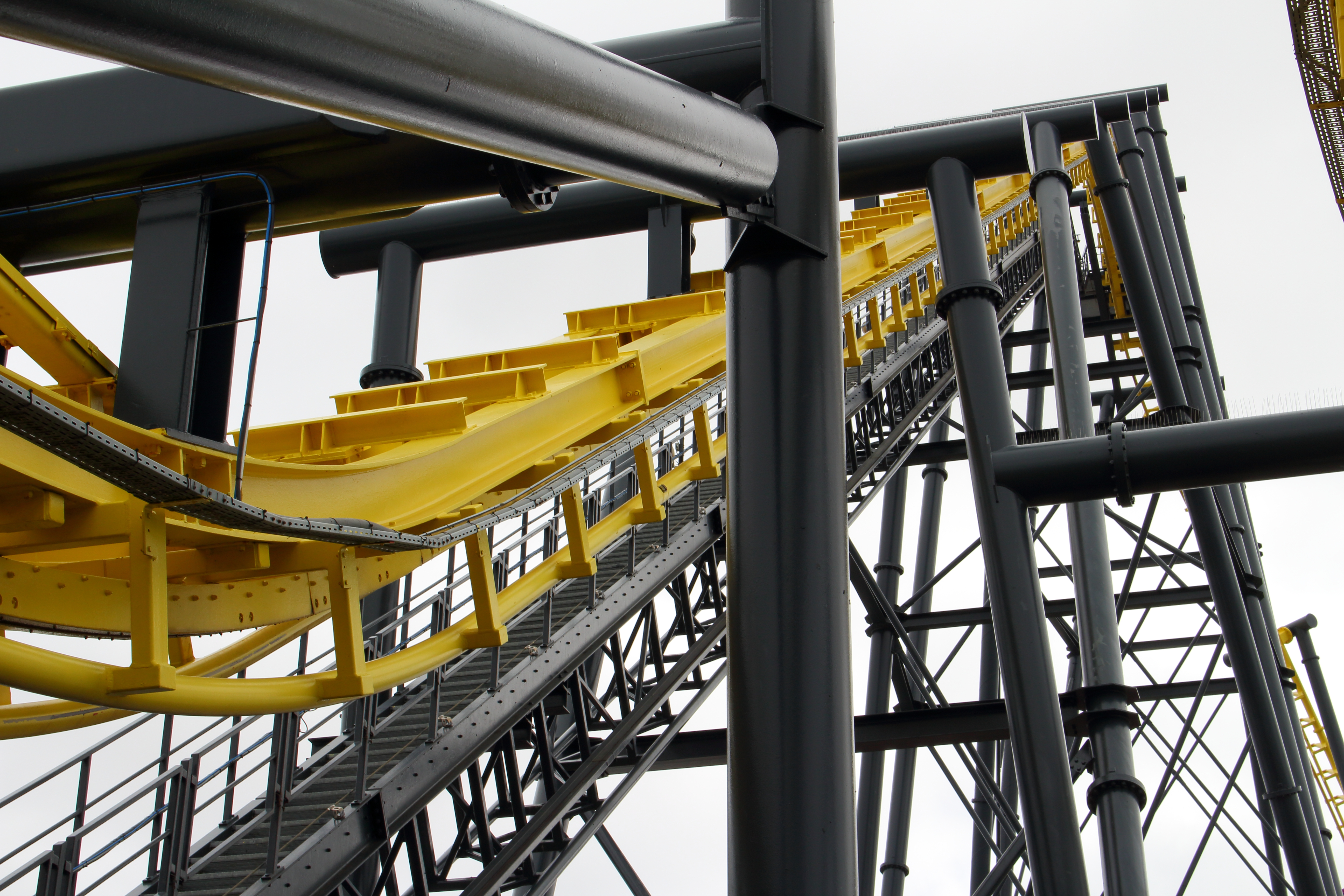 An der Küste entlang und mit ganz viel gelb lackierten Stahl vor den Augen fuhren wir unsere beiden Autos entspannt in Richtung Norden nach Ingoldmells. Das dortige Fantasy Island würde nämlich früher öffnen, als der Pleasure Beach in Skegness. Über eine kleine Zufahrt im äußersten Süden des Parks erreichten wir um 10:40 Uhr den großen Parkplatz. Aus dem Auto ausgestiegen, mit Küstenluft in der Nase, erhoben sich vor mir zwei riesige niederländische Stahlbauten in die Höhe.