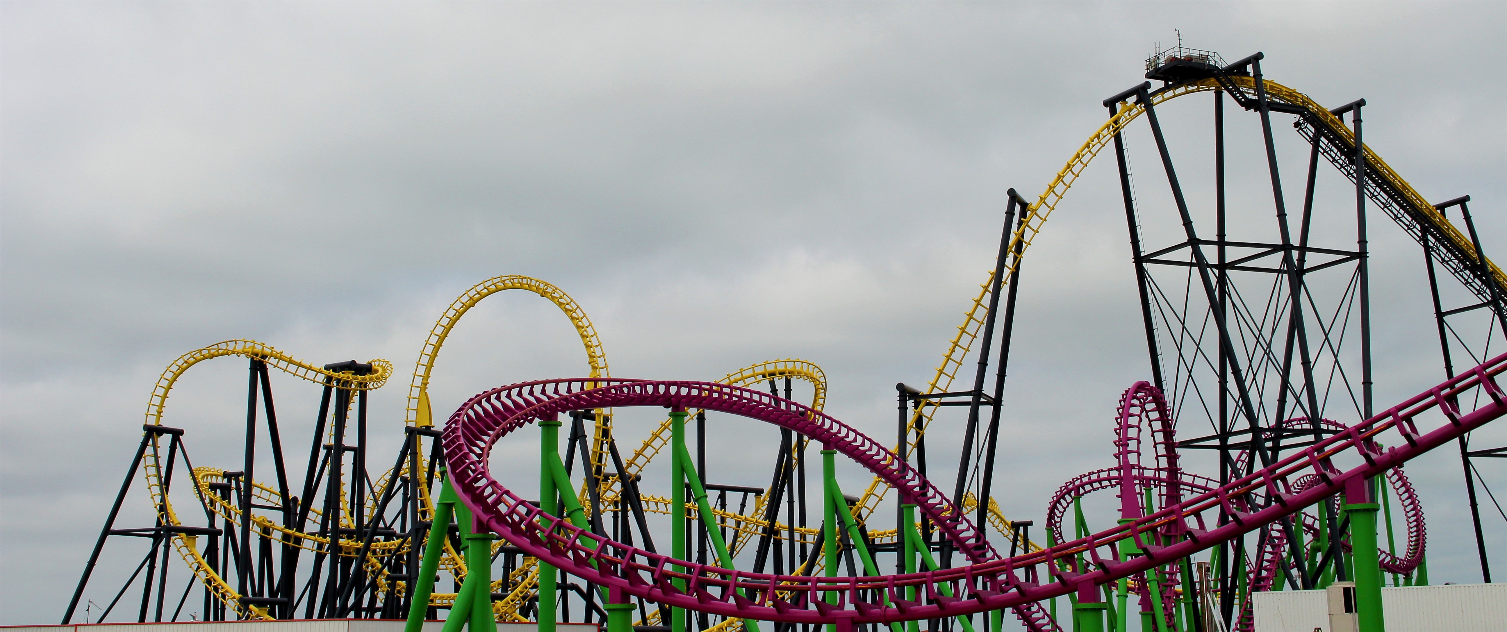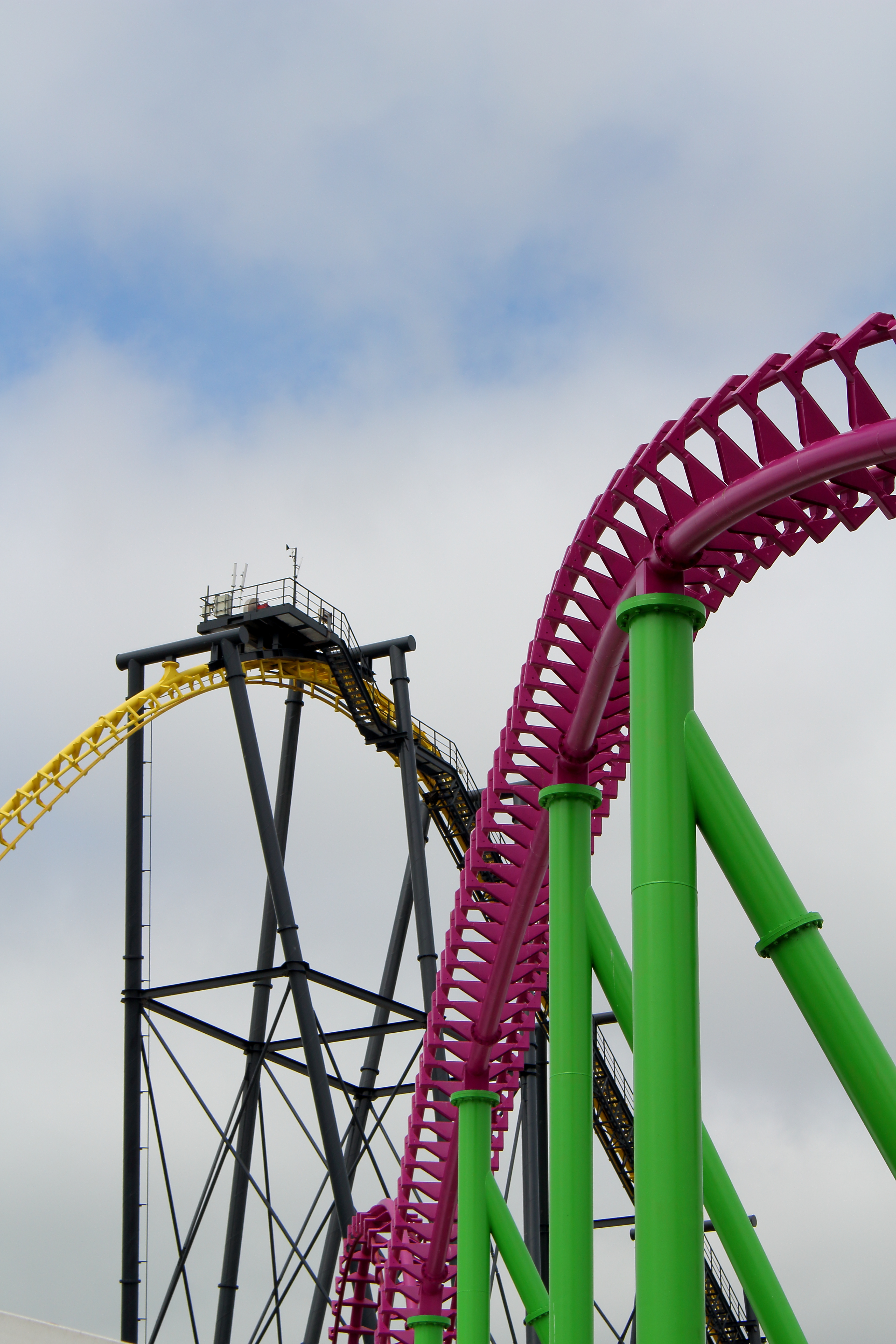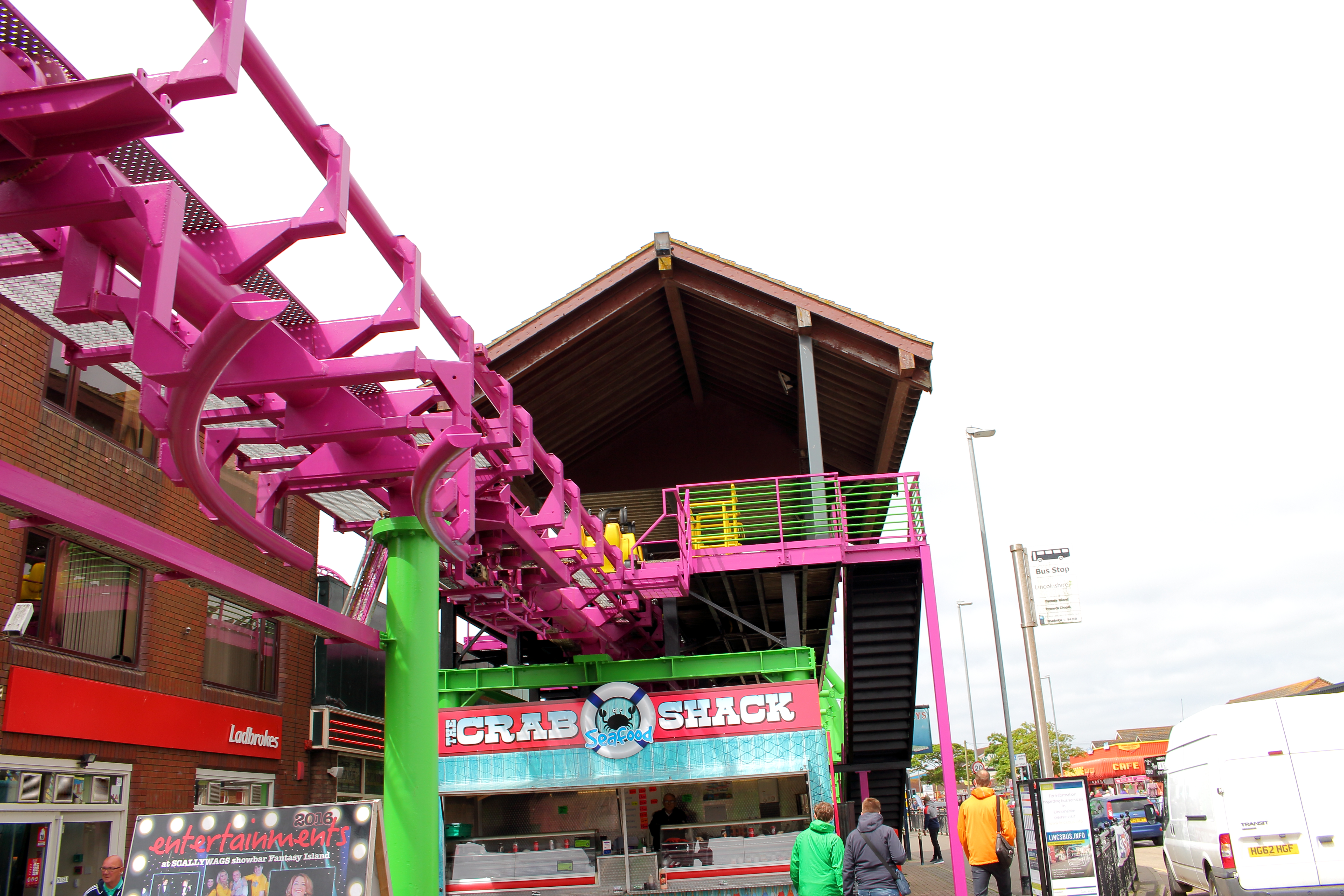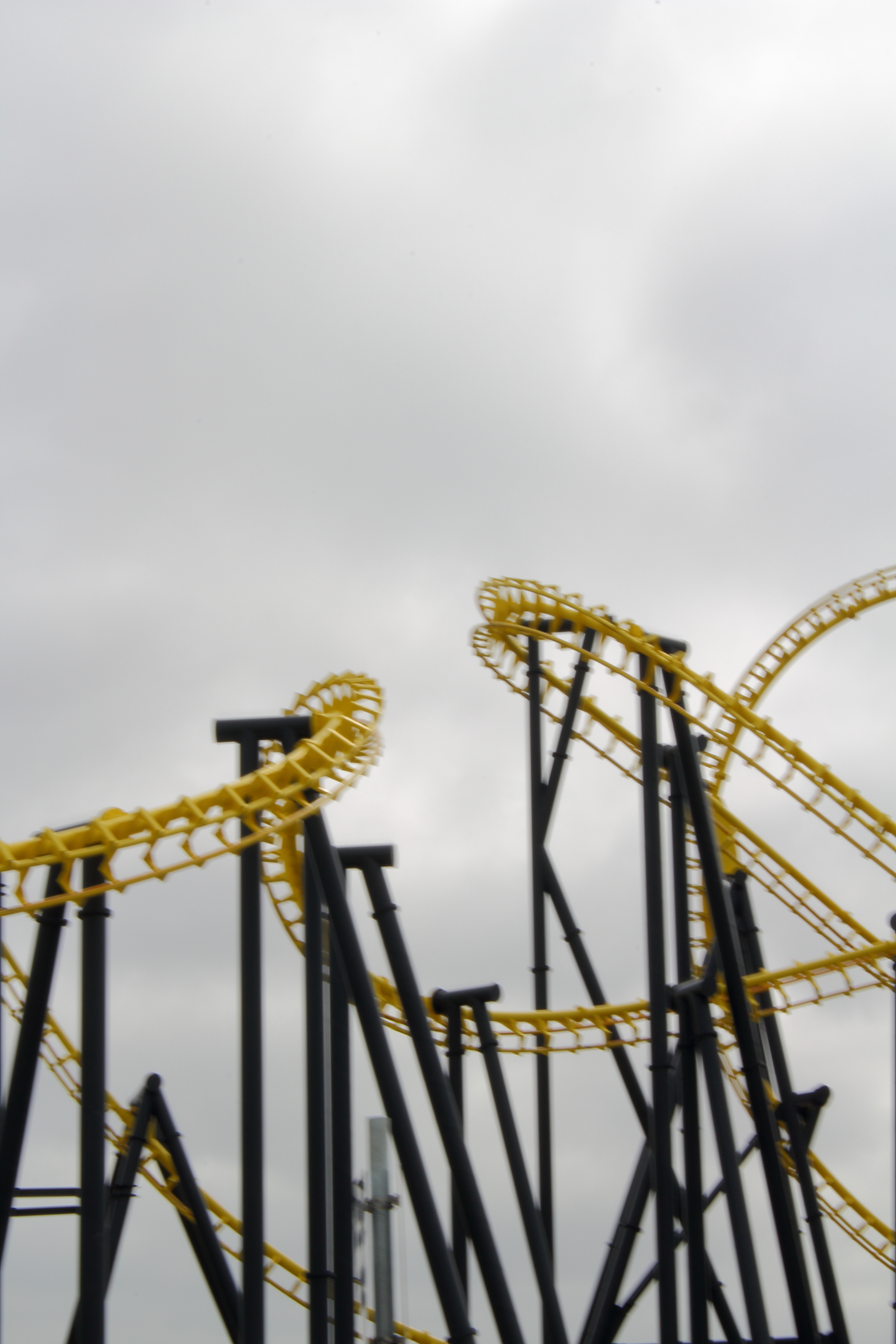 An der Küste entlang und mit ganz viel gelb lackierten Stahl vor den Augen fuhren wir unsere beiden Autos entspannt in Richtung Norden nach Ingoldmells. Das dortige Fantasy Island würde nämlich früher öffnen, als der Pleasure Beach in Skegness. Über eine kleine Zufahrt im äußersten Süden des Parks erreichten wir um 10:40 Uhr den großen Parkplatz. Aus dem Auto ausgestiegen, mit Küstenluft in der Nase, erhoben sich vor mir zwei riesige niederländische Stahlbauten in die Höhe.