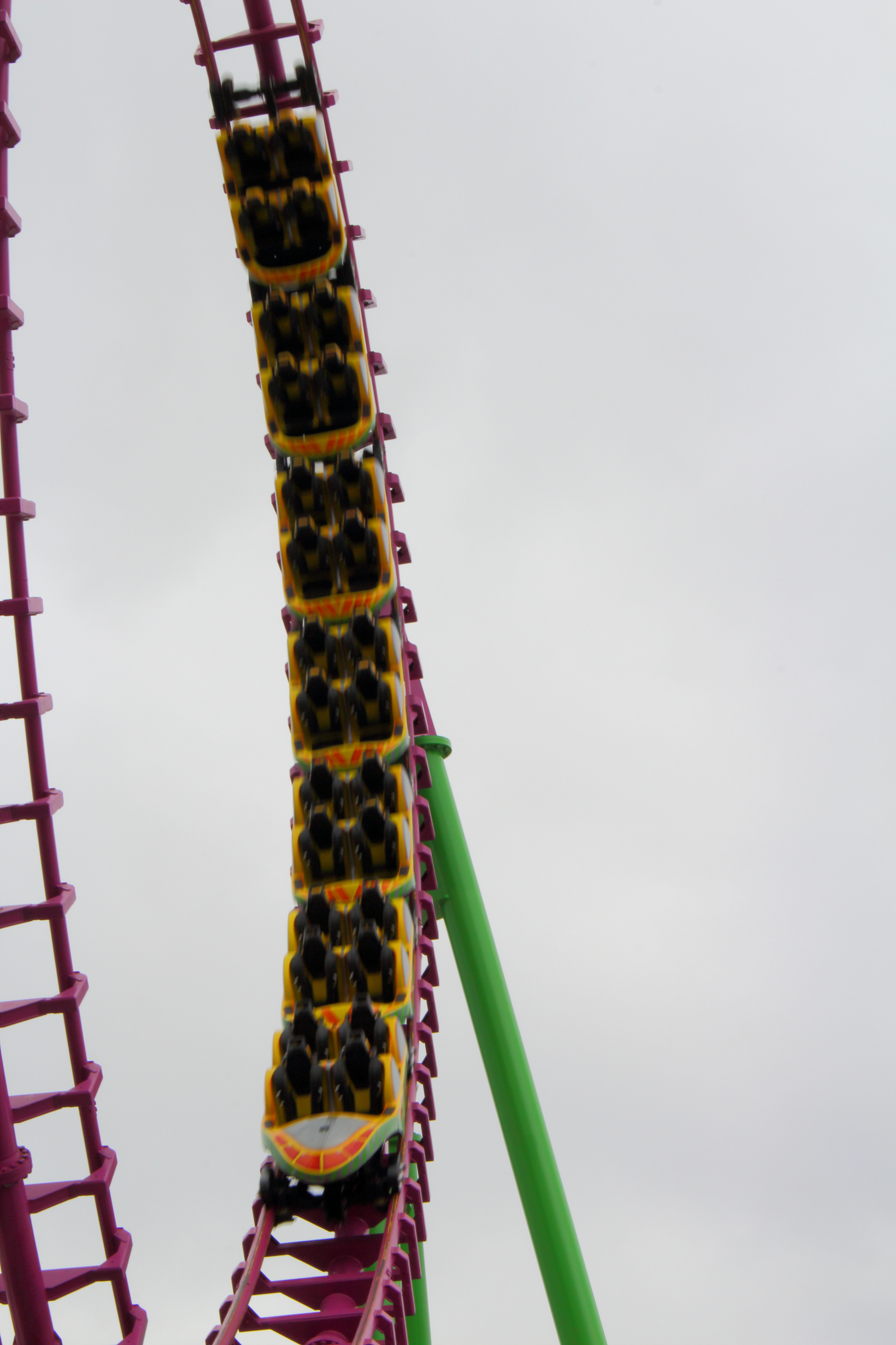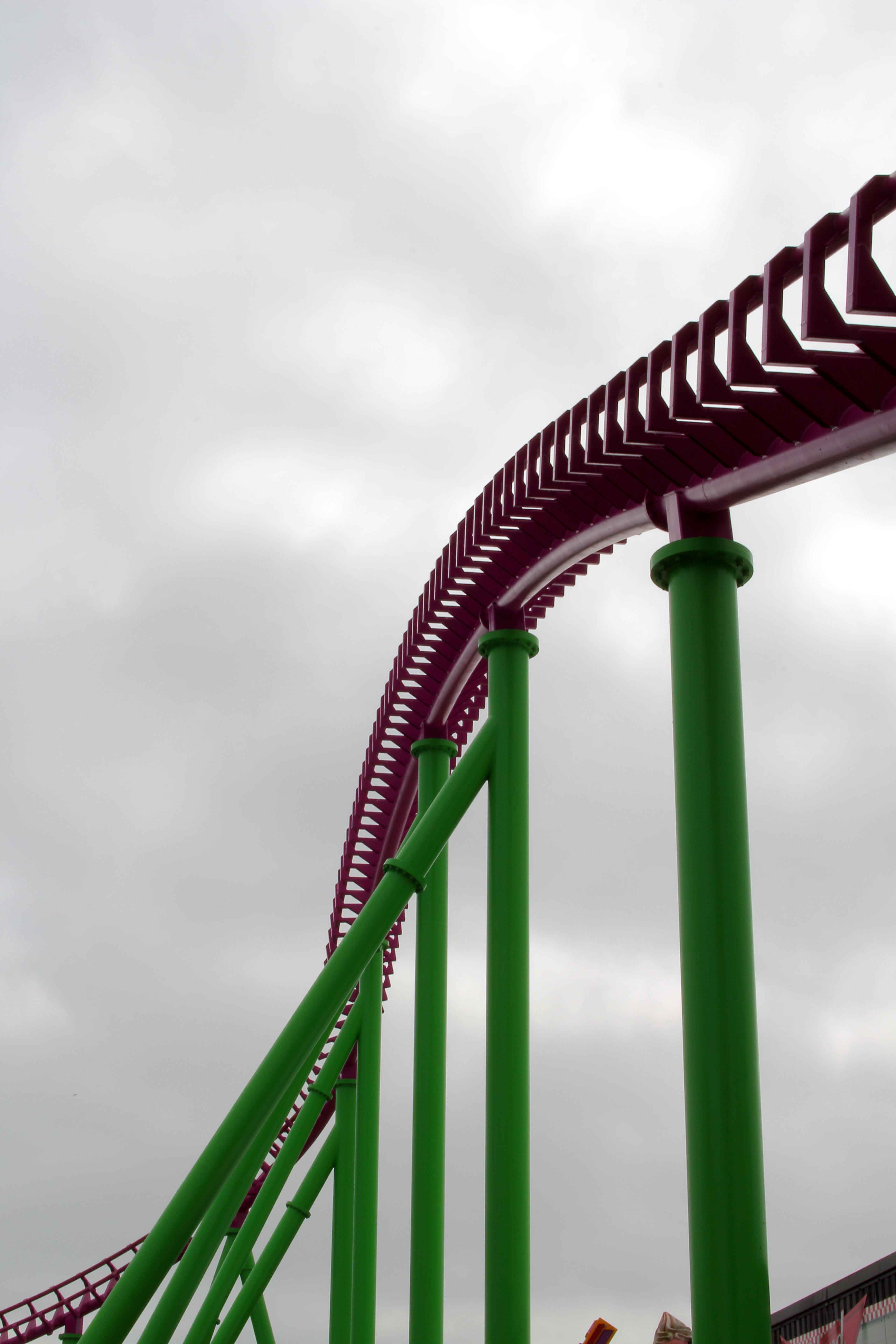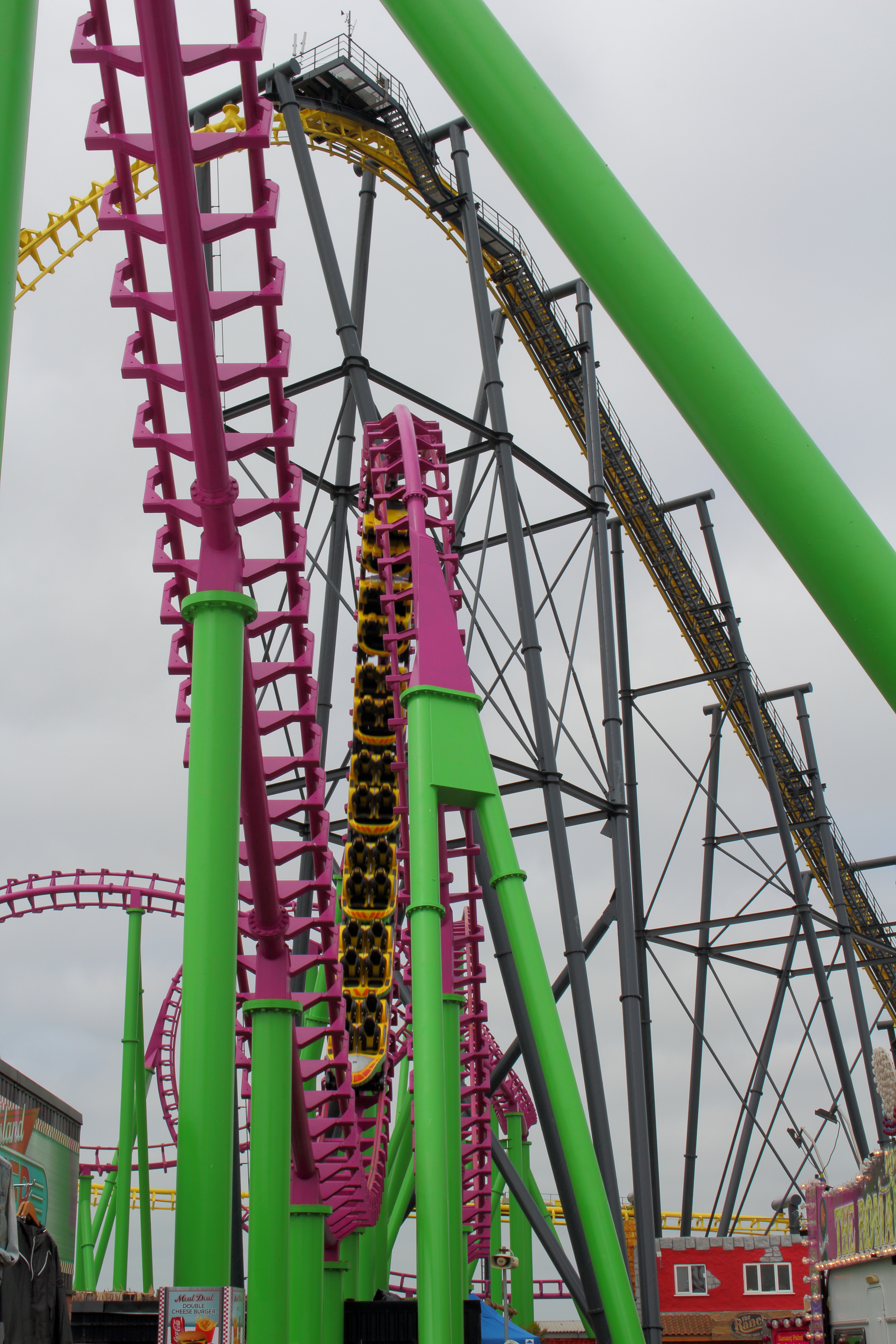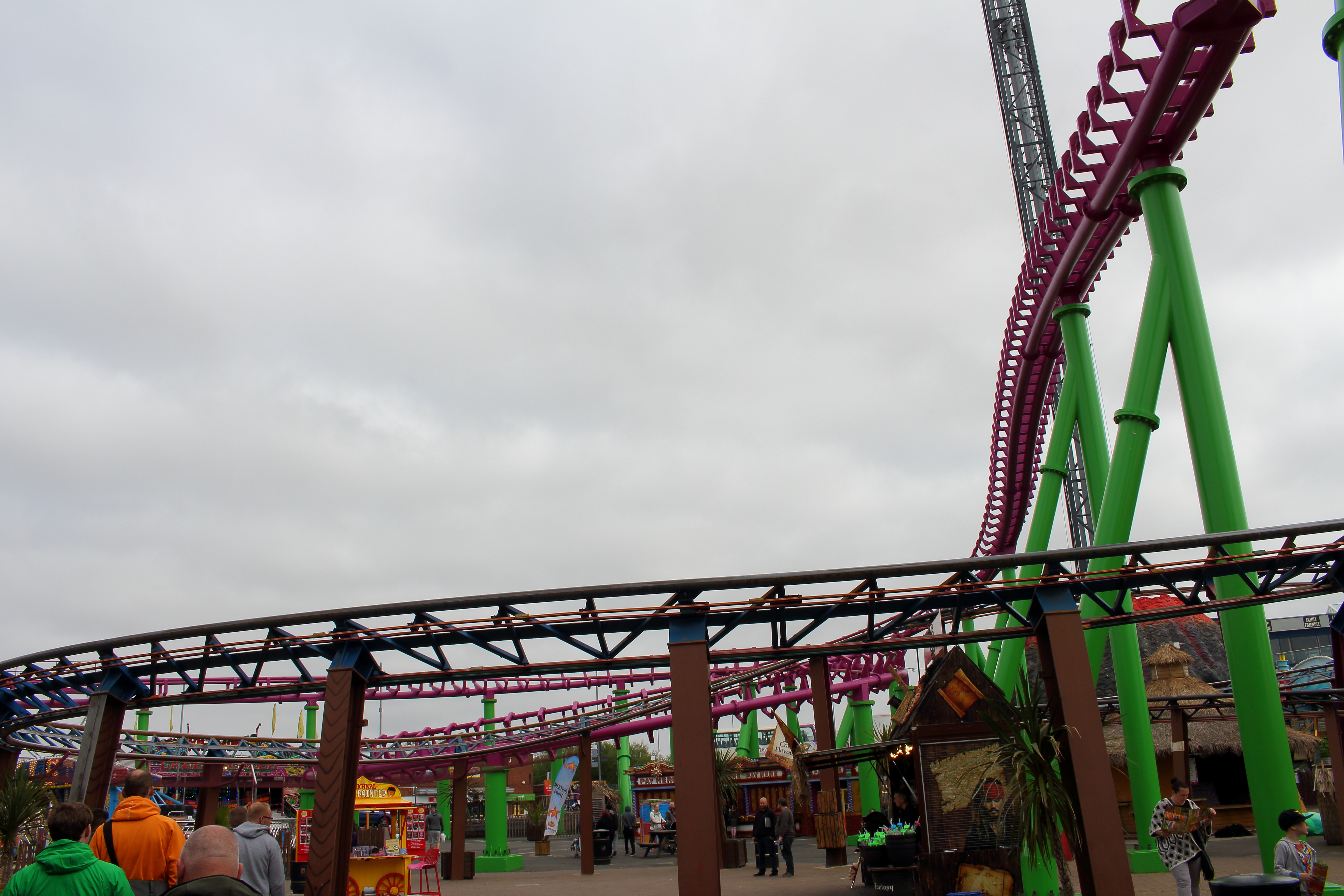 So ging es erstmal gegen den Uhrzeigersinn um die große Pyramide herum, die auf dem obigen Bild hinter dem Lifthill zu sehen ist. Unter dem ersten Looping der großen Violetten beginnt dann Europas größter 7-Tage-Markt.