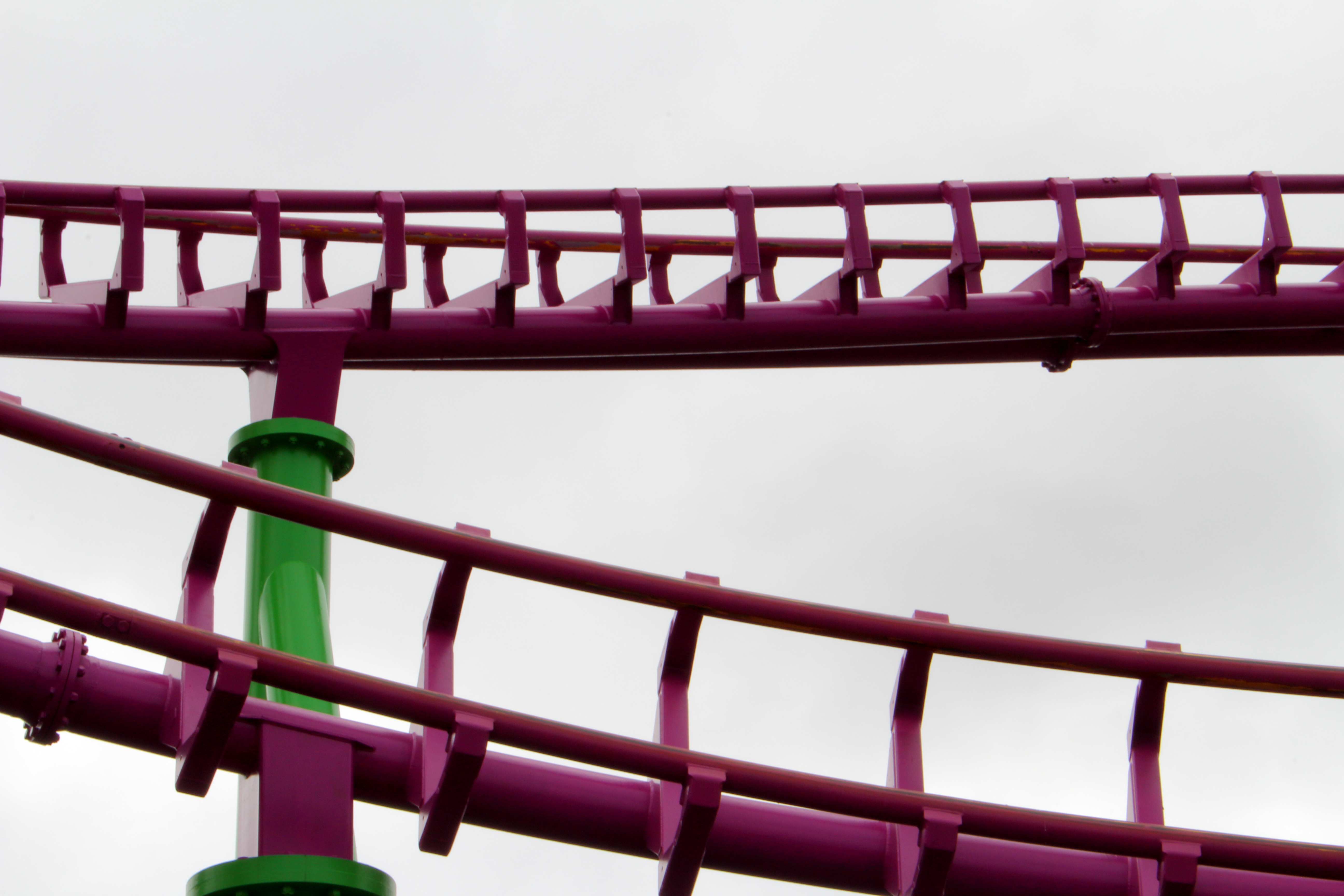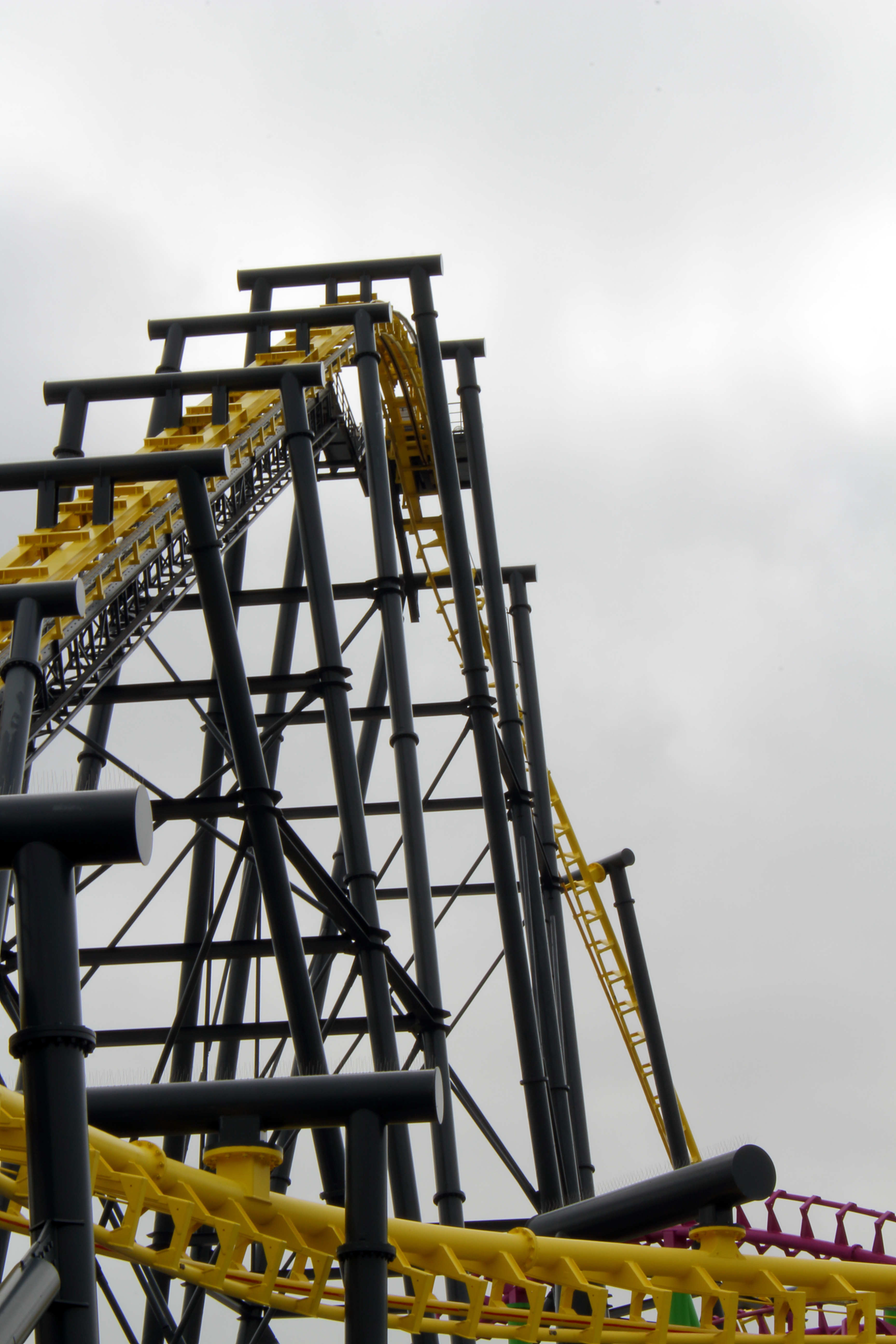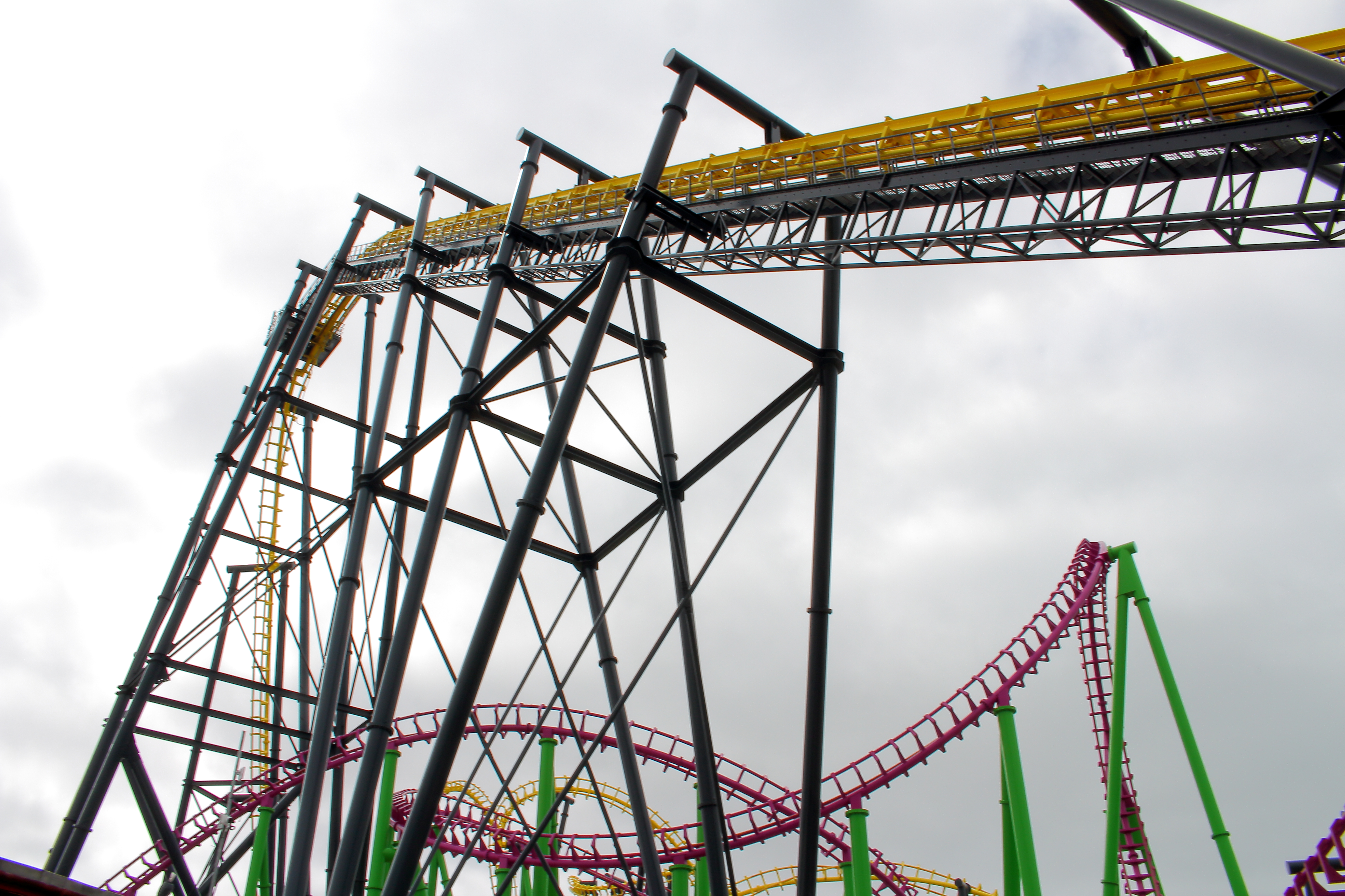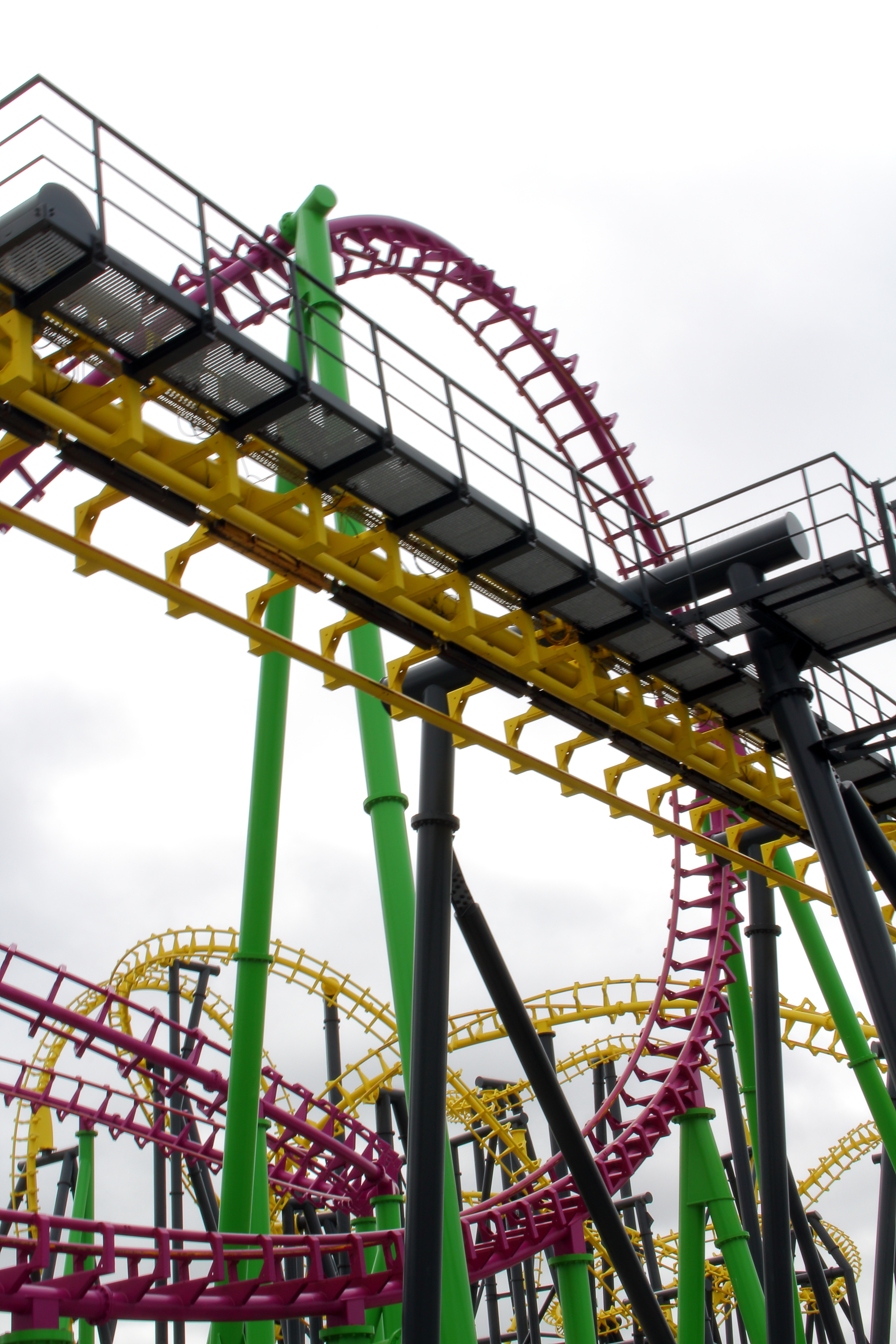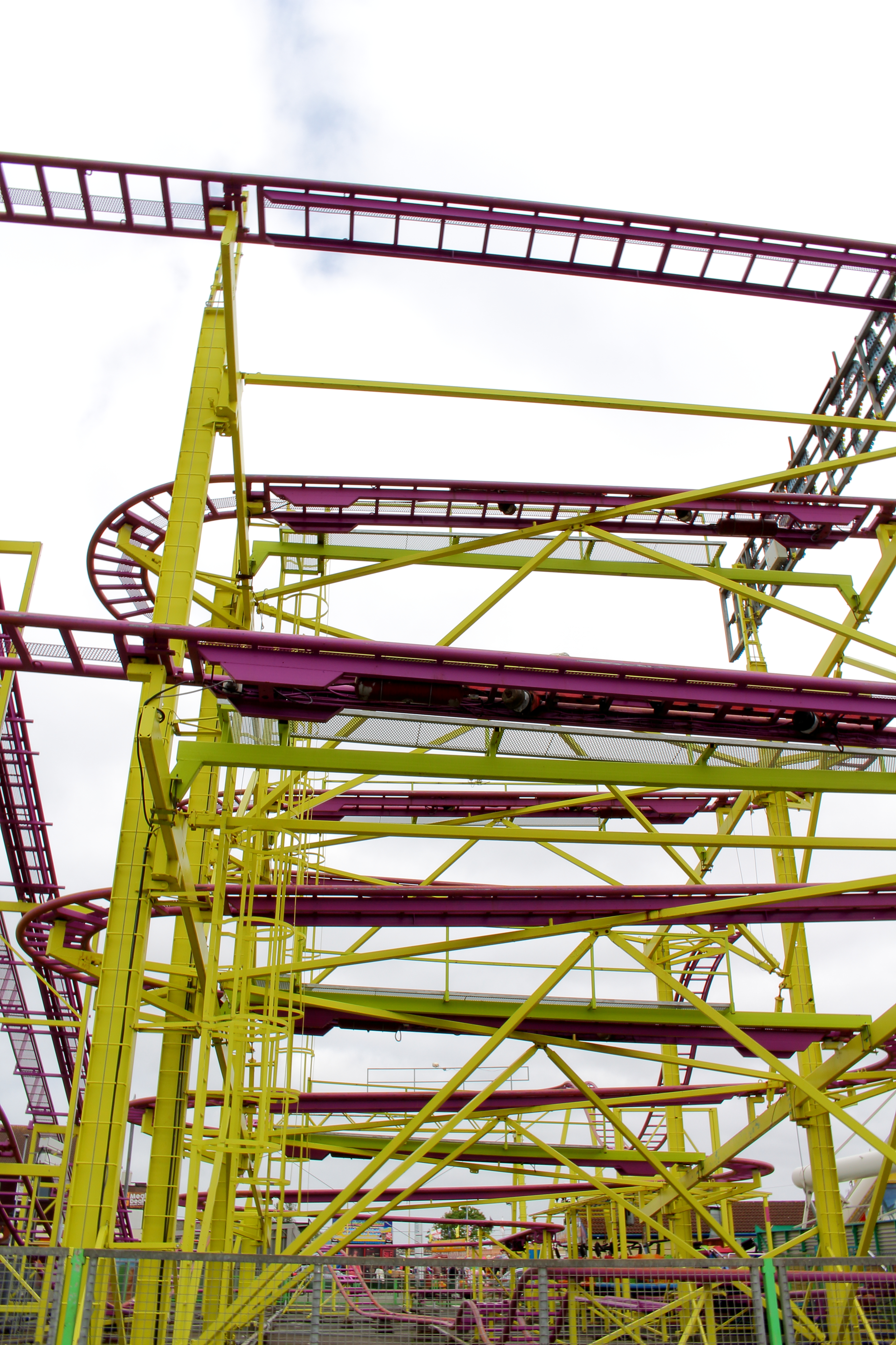 So ging es erstmal gegen den Uhrzeigersinn um die große Pyramide herum, die auf dem obigen Bild hinter dem Lifthill zu sehen ist. Unter dem ersten Looping der großen Violetten beginnt dann Europas größter 7-Tage-Markt.