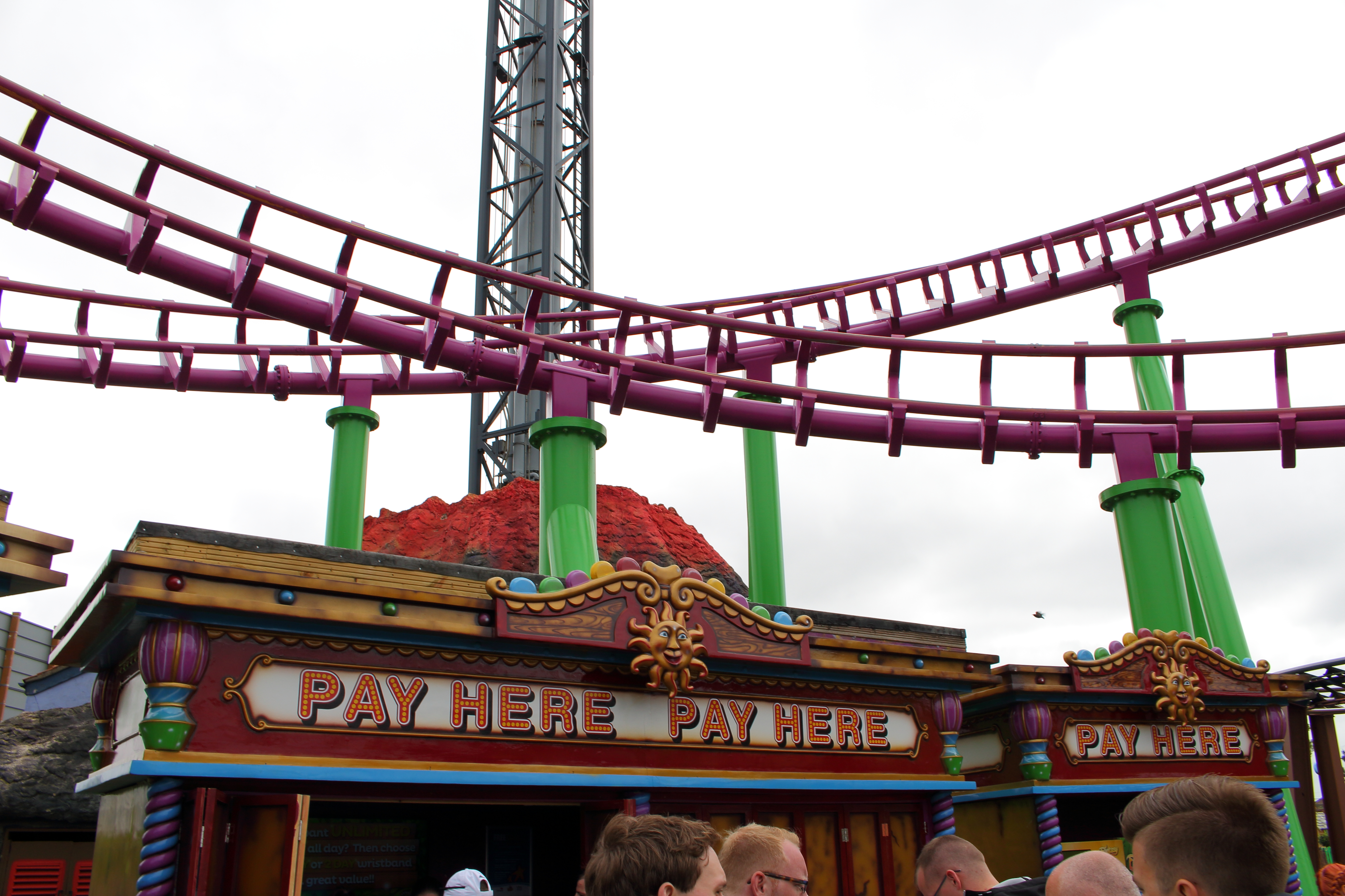 Einmal den Park durchquert ist vor dem S&S-Turm der benötigte Ticketschalter erreicht.