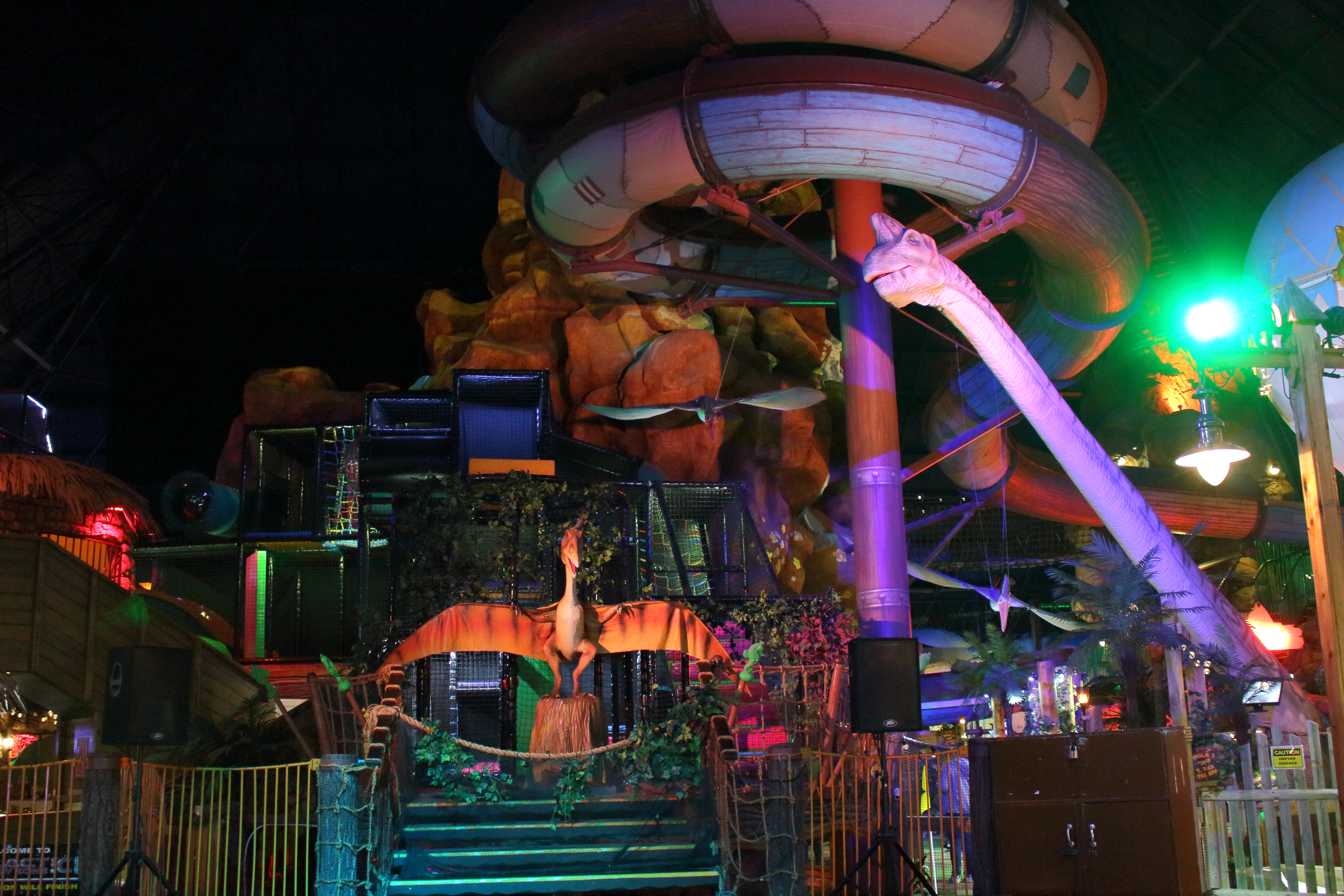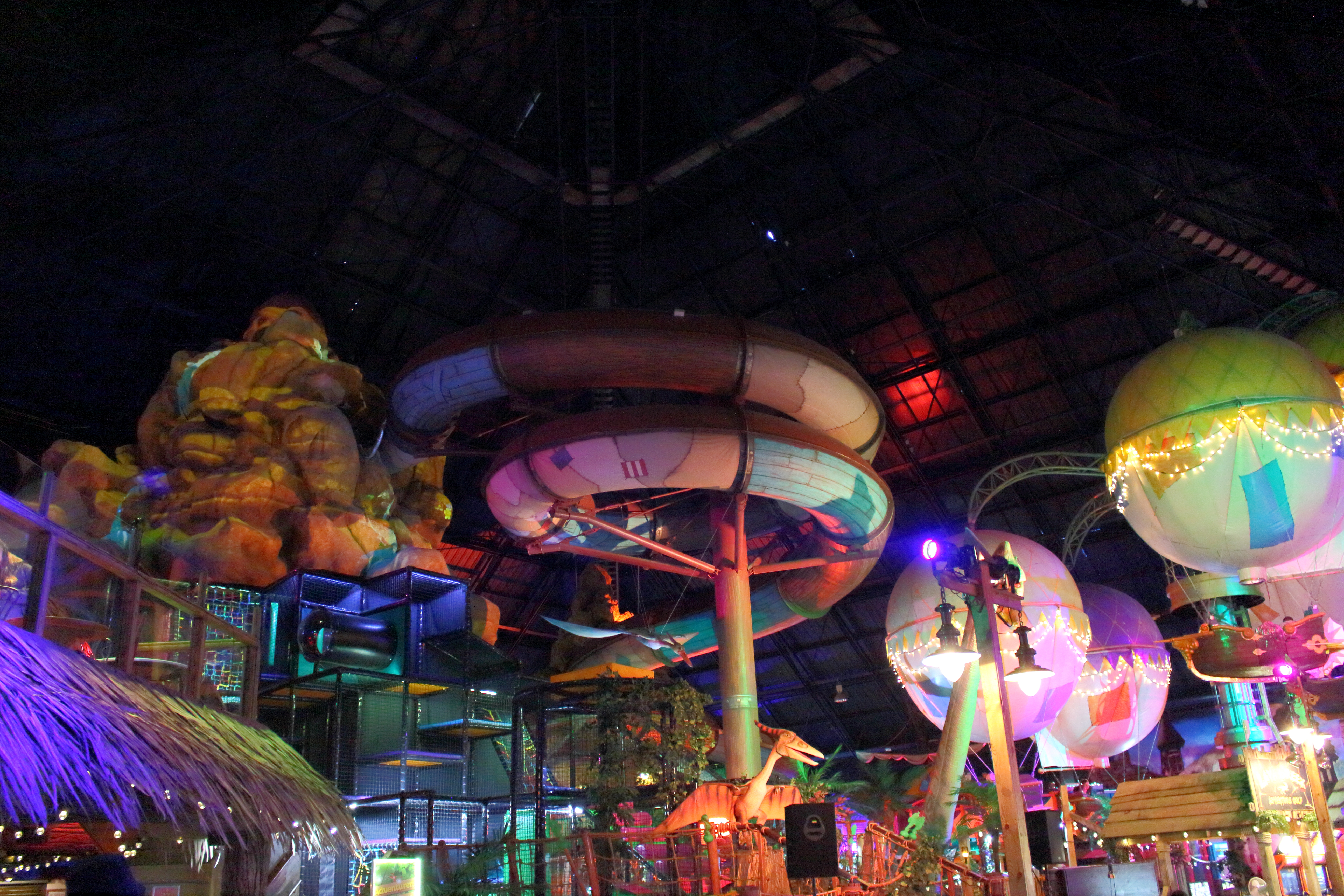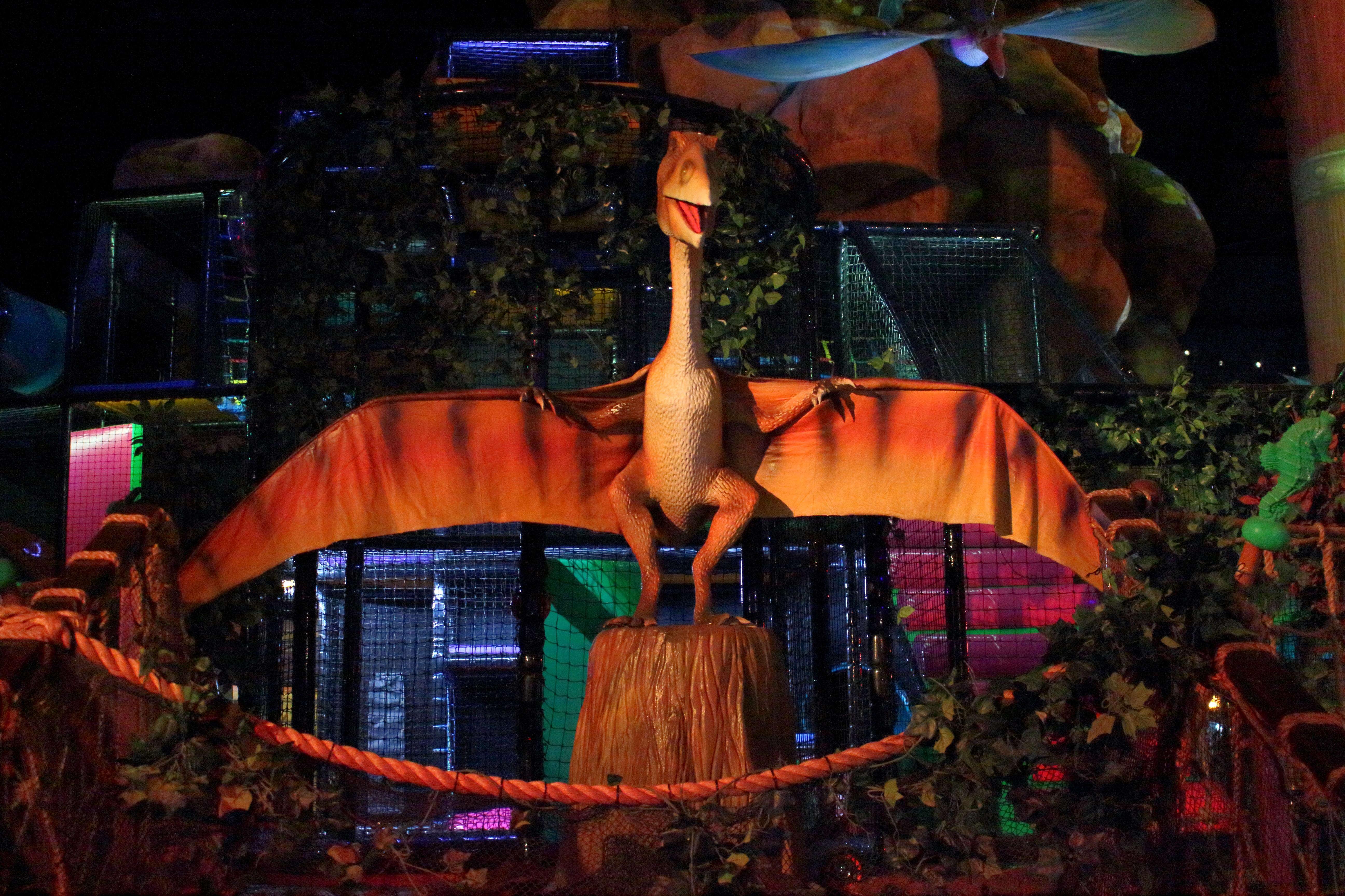 Um den Berg herum gibt es einige Attraktionen zu entdecken. So ist hier hinter dem Dino eine Kletter- und Soft-Play-Area zu sehen.