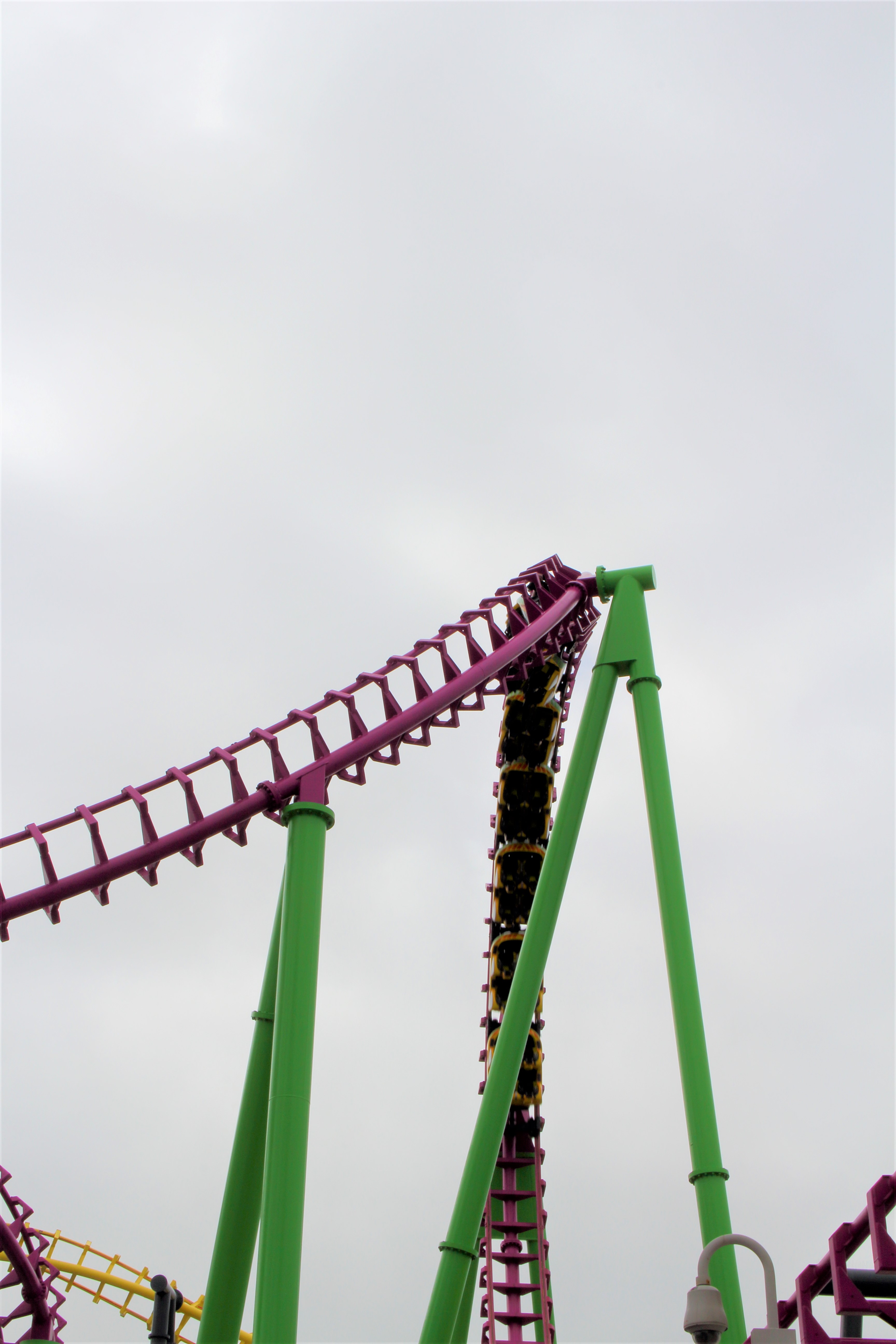 Nach dem Geschwindigkeitsrausch schießt der Fahrgast in der 1. Reihe mit bester Aussicht gen Himmel und wird hoch oben in eine „Nah-An-Hangtime-dran-Phase“ entlassen. Und genau für solche Momente bin ich froh über diese Schulterbügel, die ein Schweben des gesamten Körpers ermöglichen, während Beckenbügel die Oberschenkel an den Sitz tackern. Vorne führt das dazu, dass man mit Blick gen Boden leicht in den Bügel fällt, bevor der Zug wieder Fahrt aufnimmt und die nächste positive G-Keule einsetzt. Hinten dagegen wird diese Fast-Schwerelosigkeit wunderbar auf dem Kopf zurückgelegt, bevor der Radius wieder weiter wird und die Geschwindigkeit zunimmt, wodurch noch auf dem Kopf stehend das Hinterteil wieder die Masse des Fahrgastes und dessen zunehmendes Gewicht aushalten darf. Das Spiel mit der G-Kraft, nicht nur im negativen Bereich sehr beliebt bei mir.