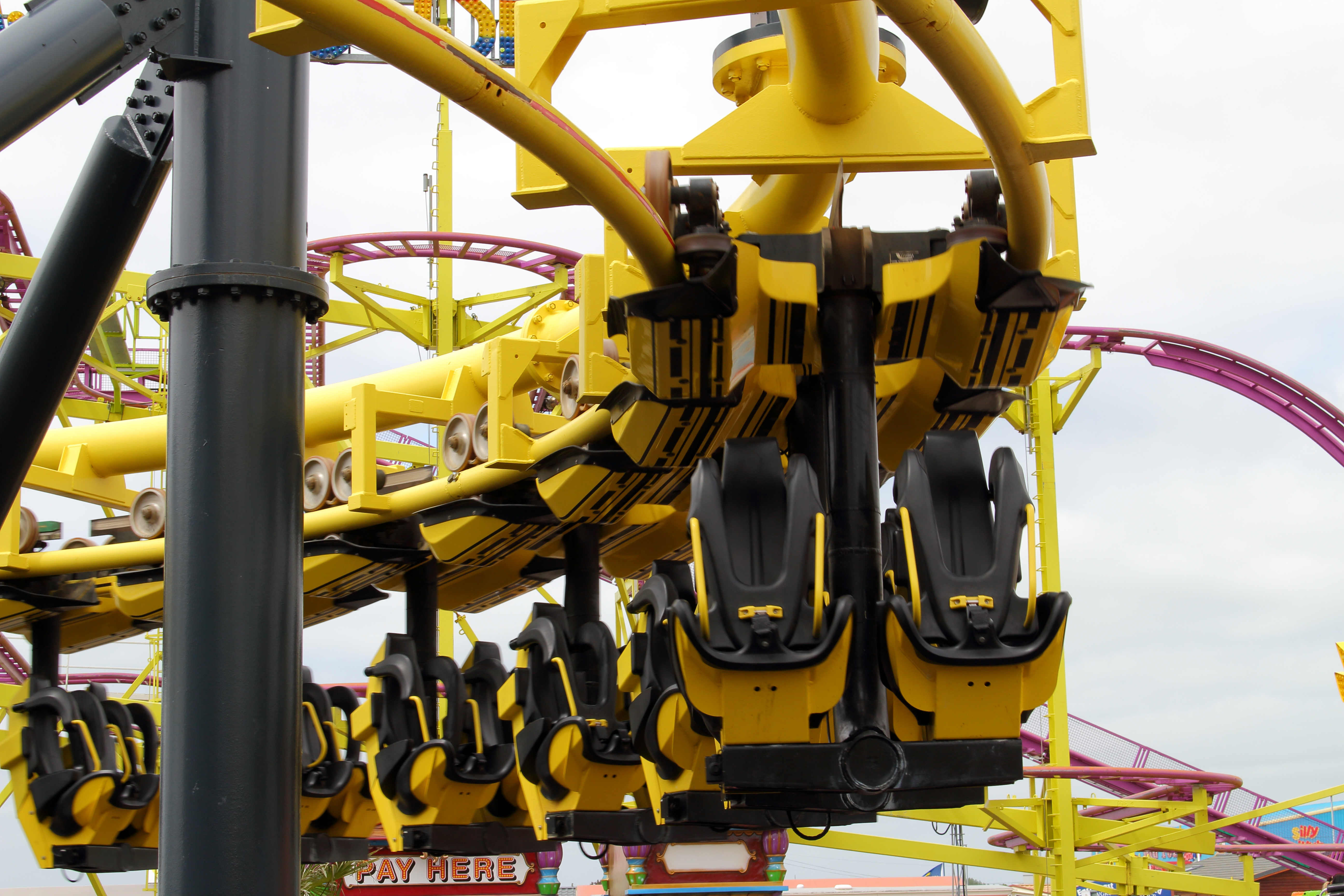 Im letzten Bild ist der abschließende Korkenzieher zu sehen, der mit der genau passenden Geschwindigkeit befahren wird, damit der Zug in der letzten Reihe ab dem Überkopf-Moment wieder Geschwindigkeit aufnimmt und links sitzend der Körper vom Bügel immer schneller drehend zurück in waagerechte Kopf-über-Hals-Position gebracht wird. Gerne mal den Arm links rausstrecken. Macht Spaß!