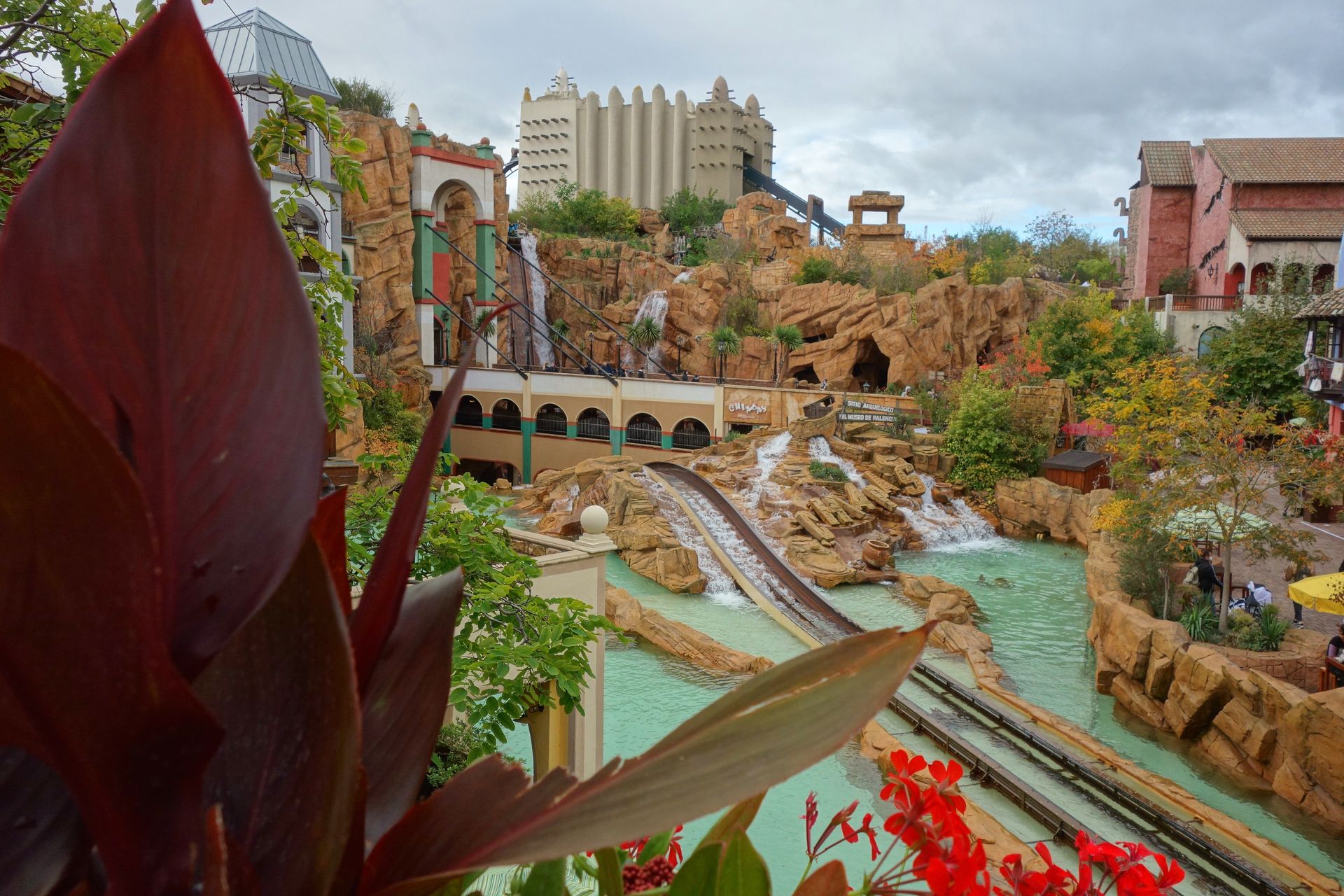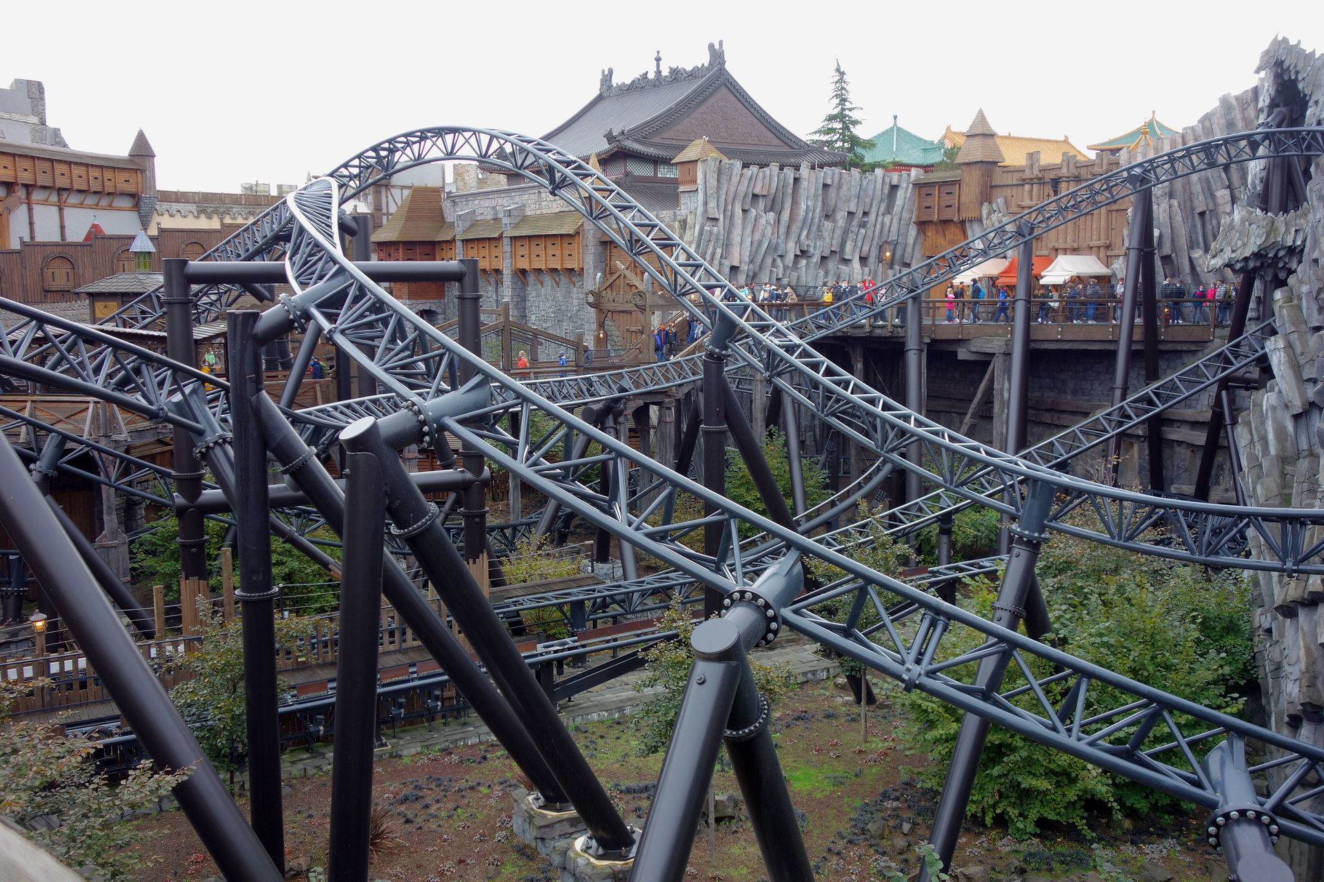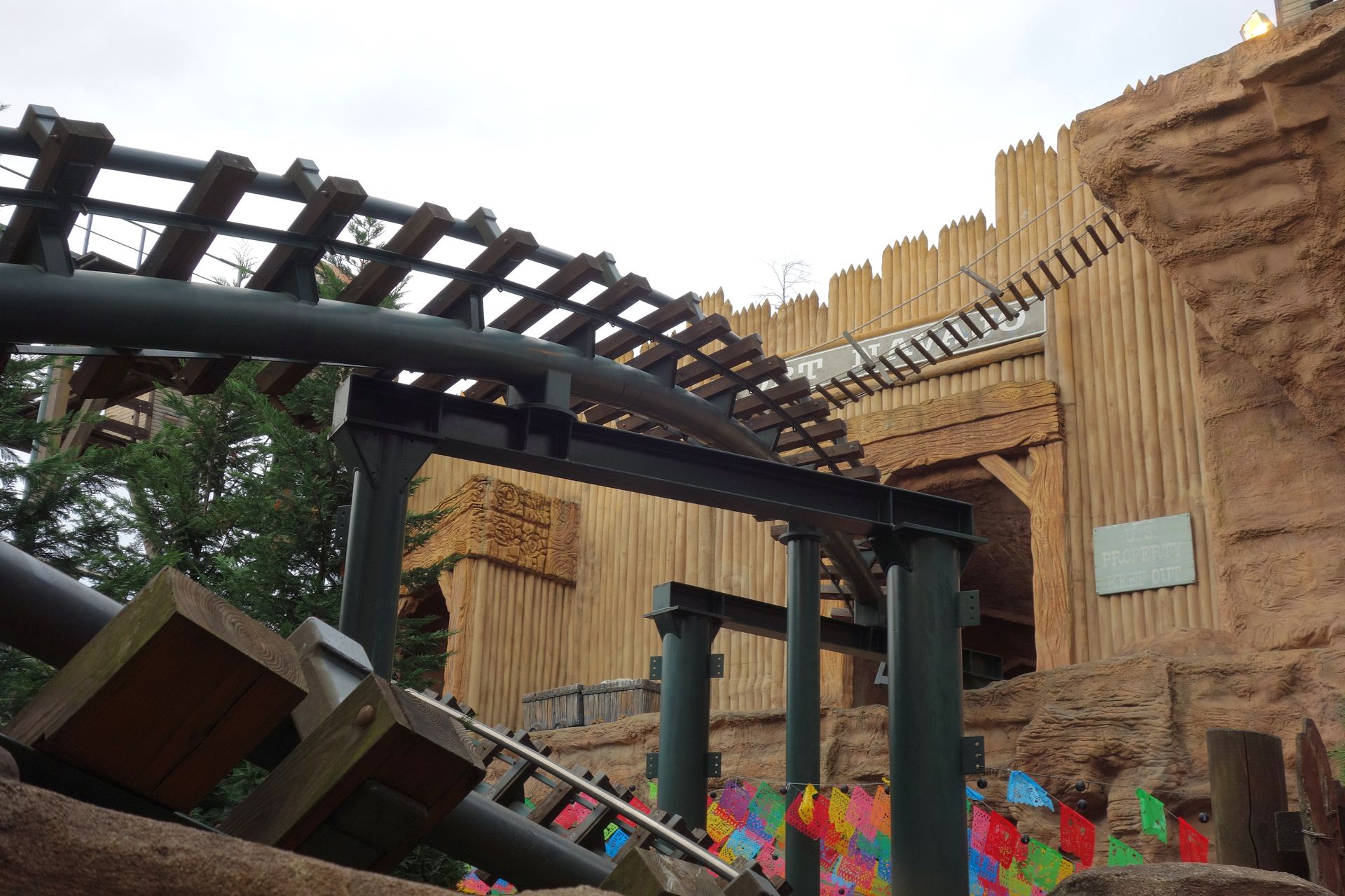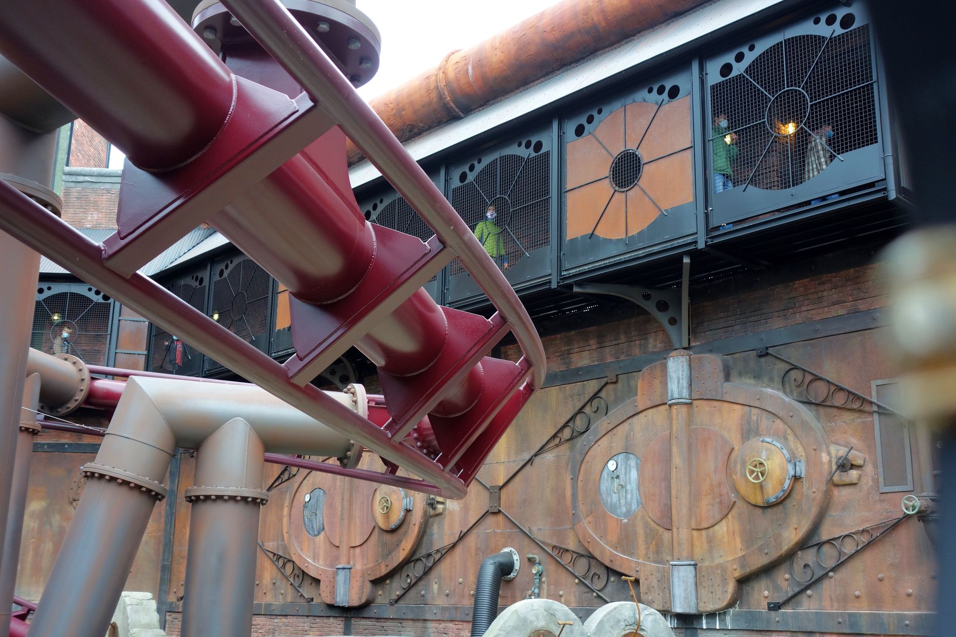 Der Wartebereich führt in erhöhter Position quasi an den Außenwänden des Themenbereichs entlang - allerdings nicht einfach gerade.
