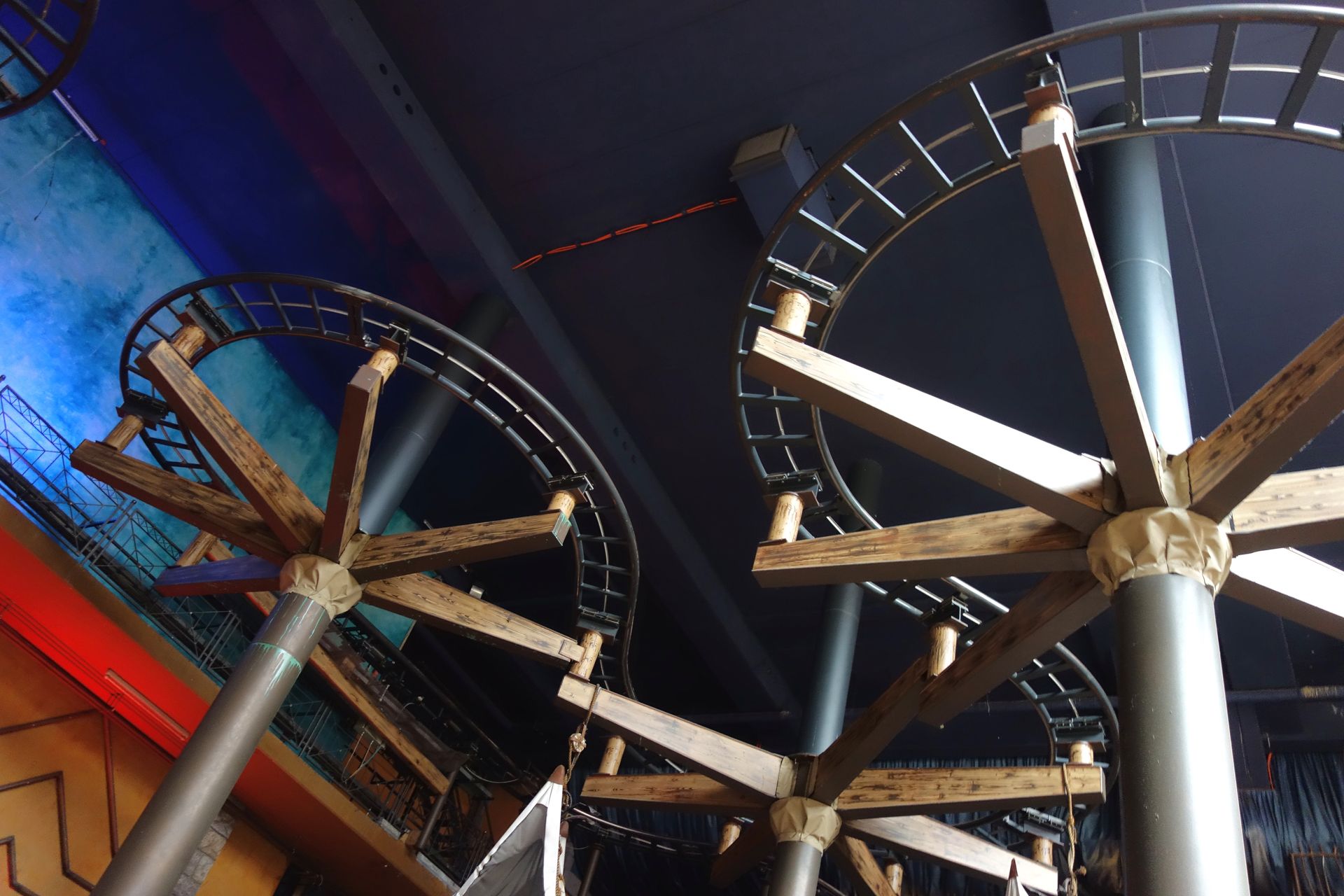 An dieser Stelle teilt sich die Warteschlange auch auf. Einmal für die erste Reihe und einmal für die übrigen Reihen. Zumindest soll sie das später einmal, wegen Corona wurde auch die erste Reihe aus der normalen Warteschlange heraus zugewiesen. Am Ende der Treppe landet man in einem großen, runden Raum voller Geländer. Erst auf den zweiten Blick wird klar, dass damit nicht weniger als vier separate Wartebereiche abgegrenzt werden. Die beiden weiteren kommen durch Türen von außen herein und beginnen mit den Treppen, die gleich auf dem ersten Bild des Bereichs zu sehen waren. Das eine ist der Schnellzugang für Gäste des Hotels Charles Lindbergh bzw. den Quick Pass (dass dort das Tor sogar offen war, ist mir jetzt erst auf den Fotos aufgefallen), das andere soll dann wohl für Single Rider sein, eine Beschilderung hatte ich dort noch nicht gesehen.