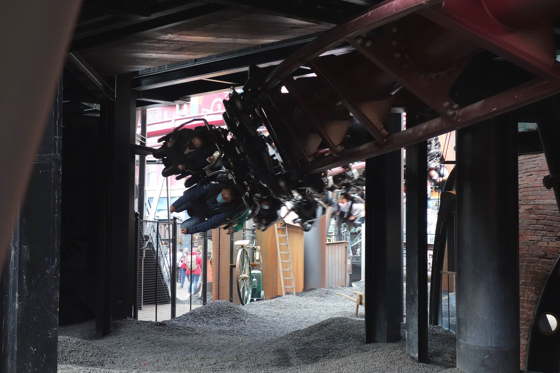 Wenn der Zug dann einfährt, setzt man sich ganz einfach rein, zieht den Bügel zu, die Mitarbeiter kontrollieren eben fix und schon geht die Fahrt los. Zunächst durch einen kleinen Darkride-Part ohne wirkliche Tiefe. Die Wand ist fast direkt vor einem, und doch gibt es überraschenderweise mehr als genug zu sehen. Nichts allzu spannendes und auch nichts, was unbedingt notwendig wäre, aber eben auch nichts, was bei Wiederholungsfahrten irgendwann nervig würde. Einfach nur eine kleine Überbrückung der Fahrt zum Launch. Und nach einem kleinen Lift folgt auch schon das (technische) Highlight der Bahn. Während die Schiene in einer Kurve von der seitlichen in die hängende Position verdreht wird, werden gleichzeitig auch die Sitze am Zug rotiert, sodass man von der seitlichen Sitzposition in die gewohnte Flugposition unterhalb der Schiene gelangt. Das Ganze passiert derart sanft und harmonisch, dass man einfach nur den Hut vor