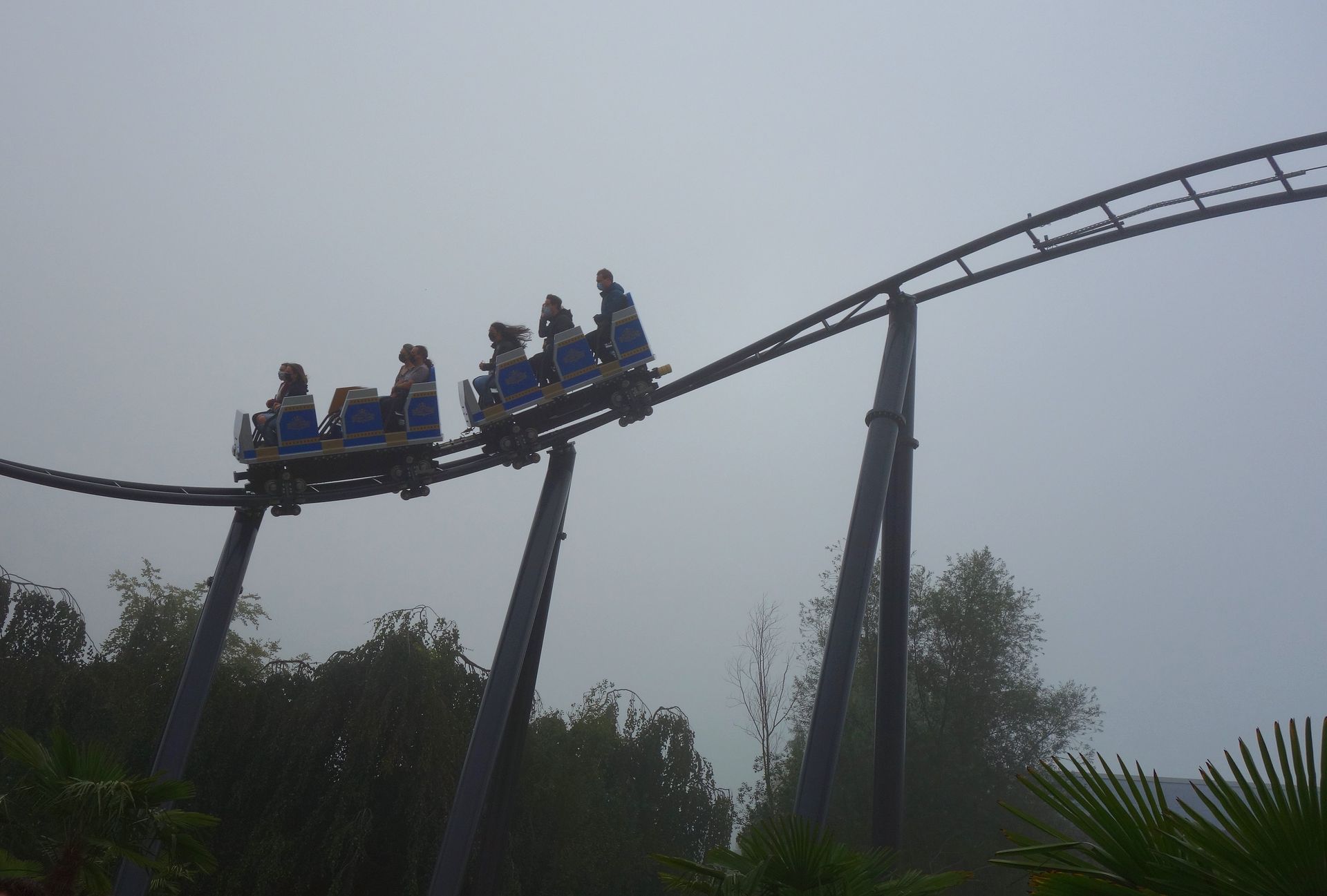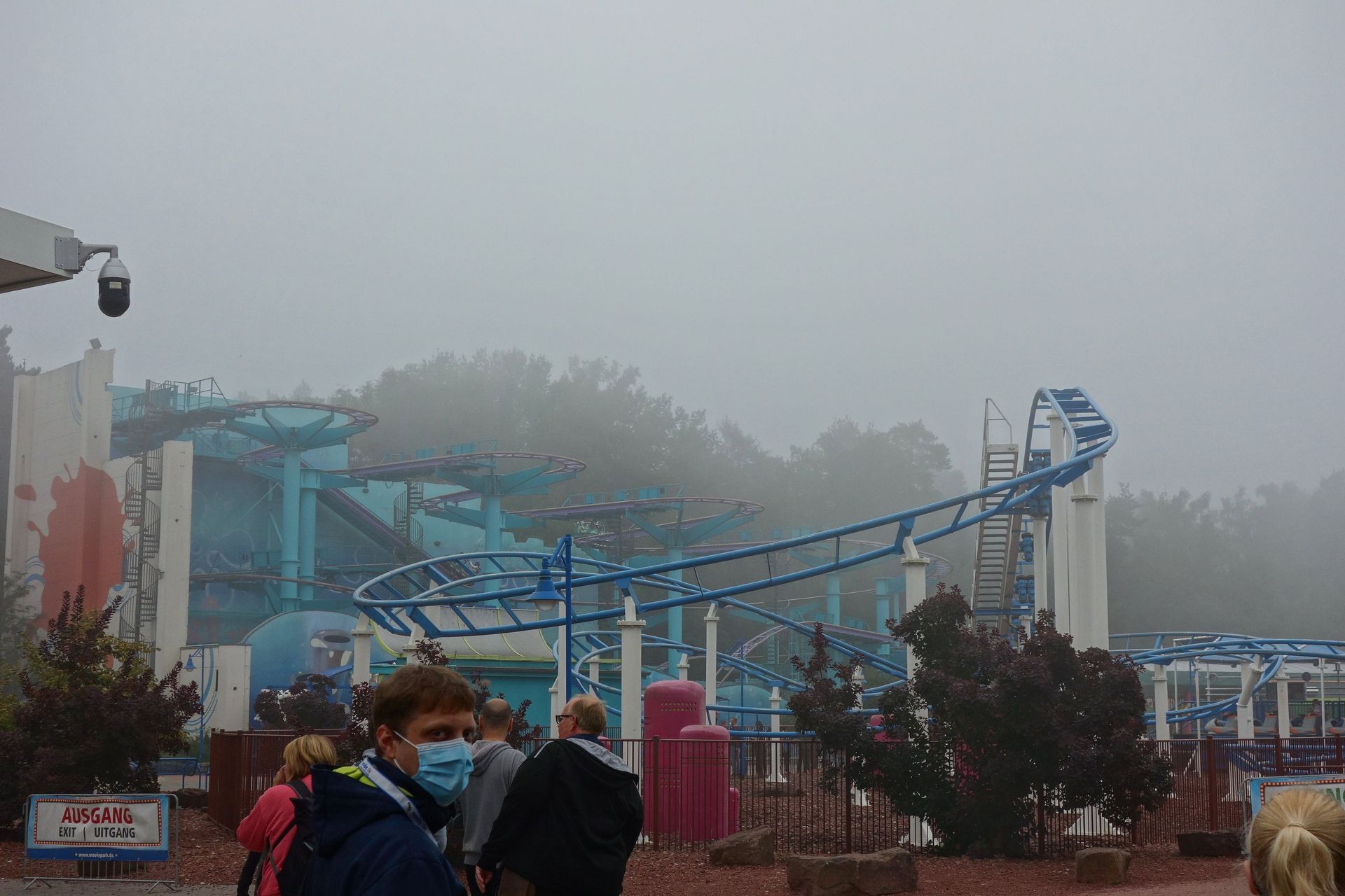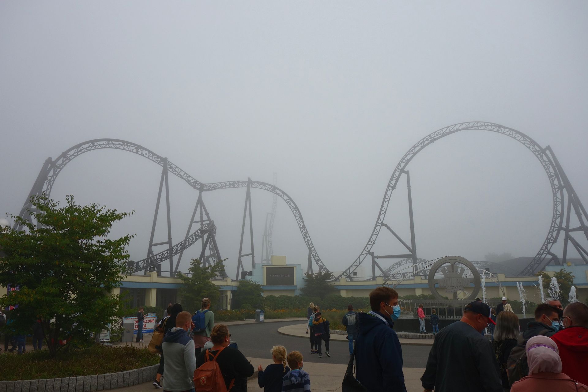 Und so machte ich mich am 18. September 2021, auf den Tag genau 10 Jahre nach meinem letzten Besuch, wieder auf den Weg gen Norden. Aufgrund der zerstörten Eifelstrecke diesmal allerdings nicht per Bahn, sondern mit dem Auto. Damit hatte ich dann auch die Möglichkeit, PowerNagel samt Frau Karlita in Brühl aufzugabeln und mitzubringen. Der Verkehr am frühen Morgen war überschaubar, sodass wir tatsächlich schon gegen 9 Uhr am Haupteingang des Parks vorbeifuhren. Man lotste uns auf den hintersten Parkplatz beim MP XPress, bzw. Lucky Luke. Von der Achterbahn war allerdings nicht sonderlich viel zu sehen, nur ganz schwach waren die Schienen in der dichten Nebelsuppe zu erahnen.
