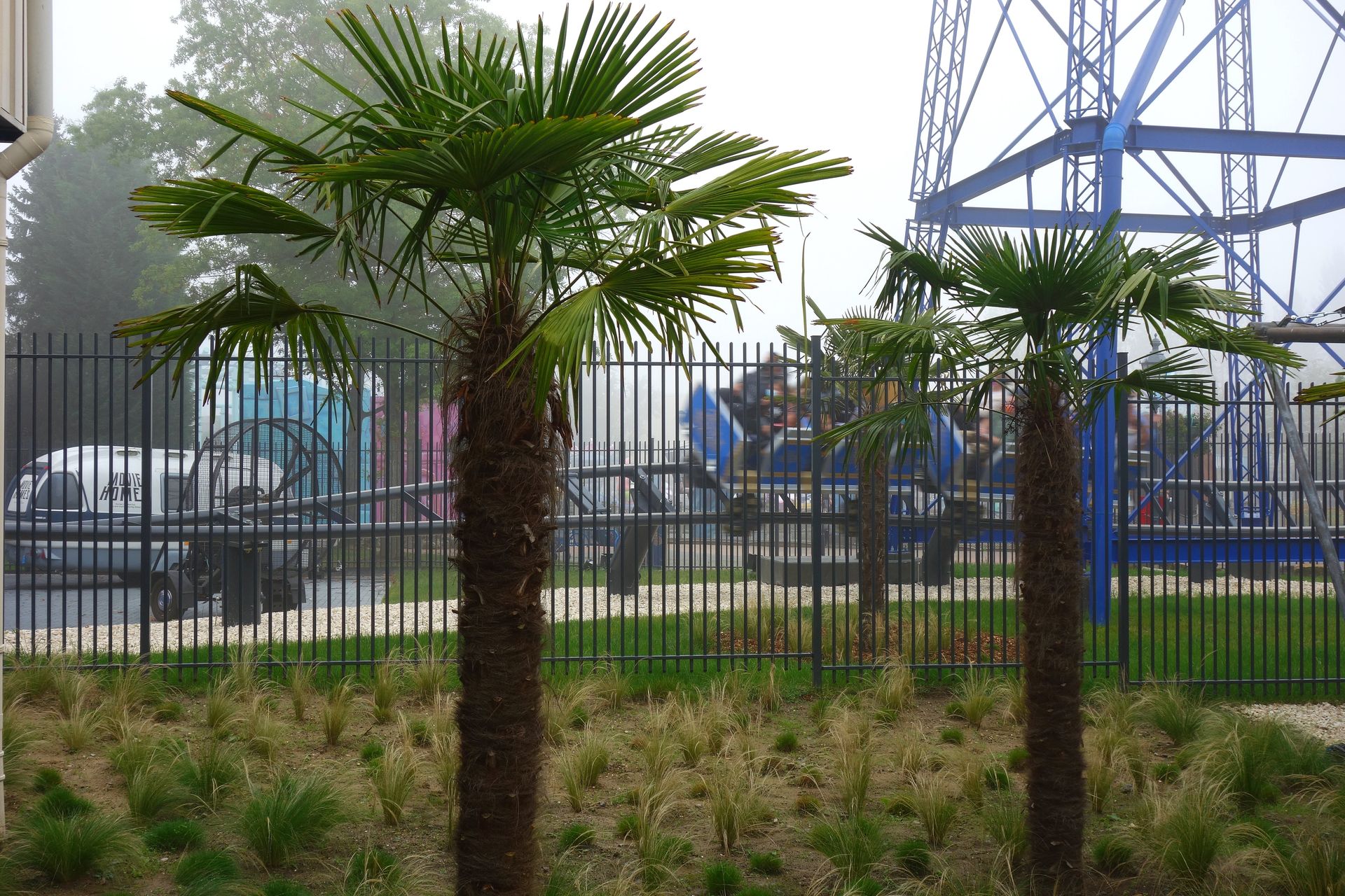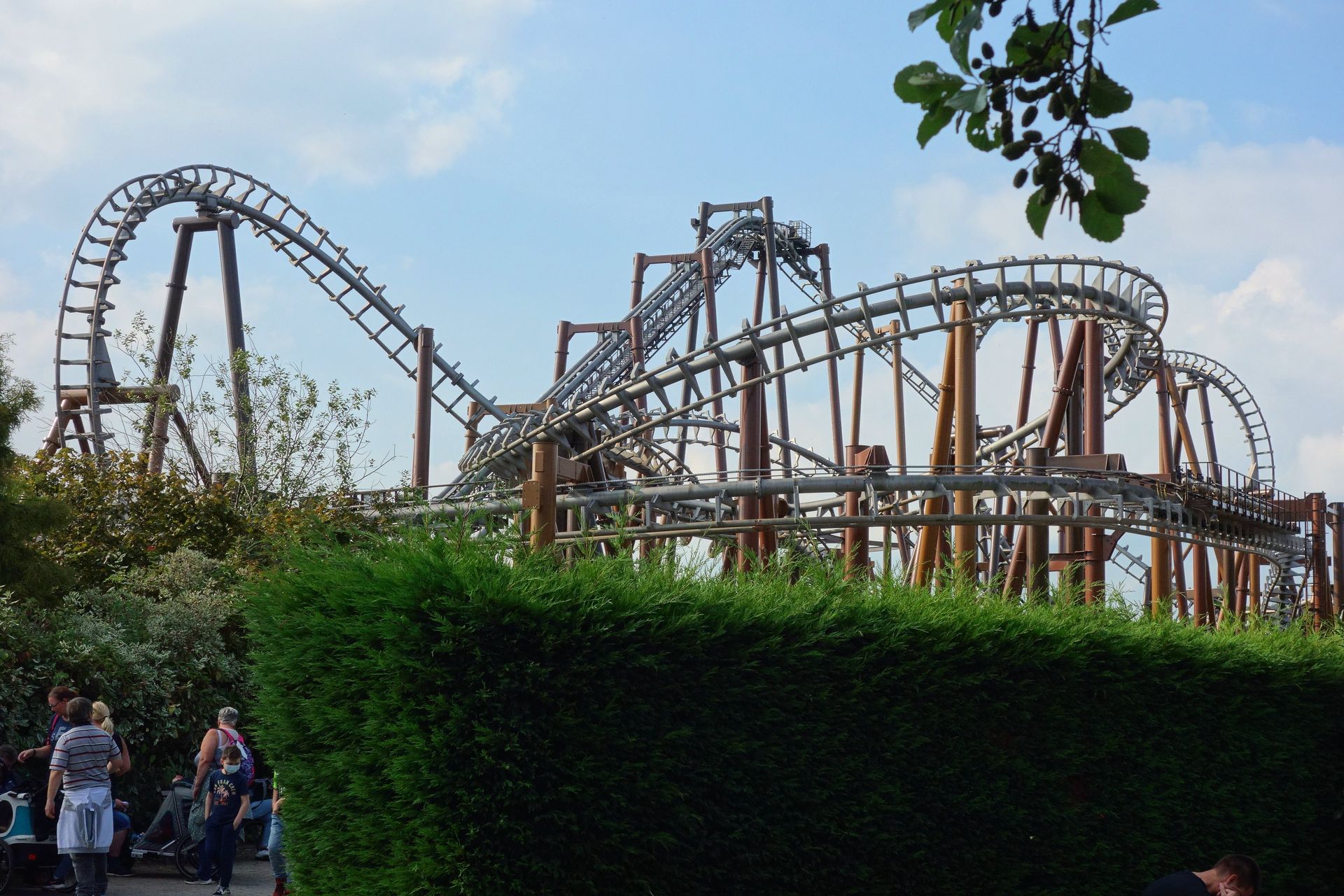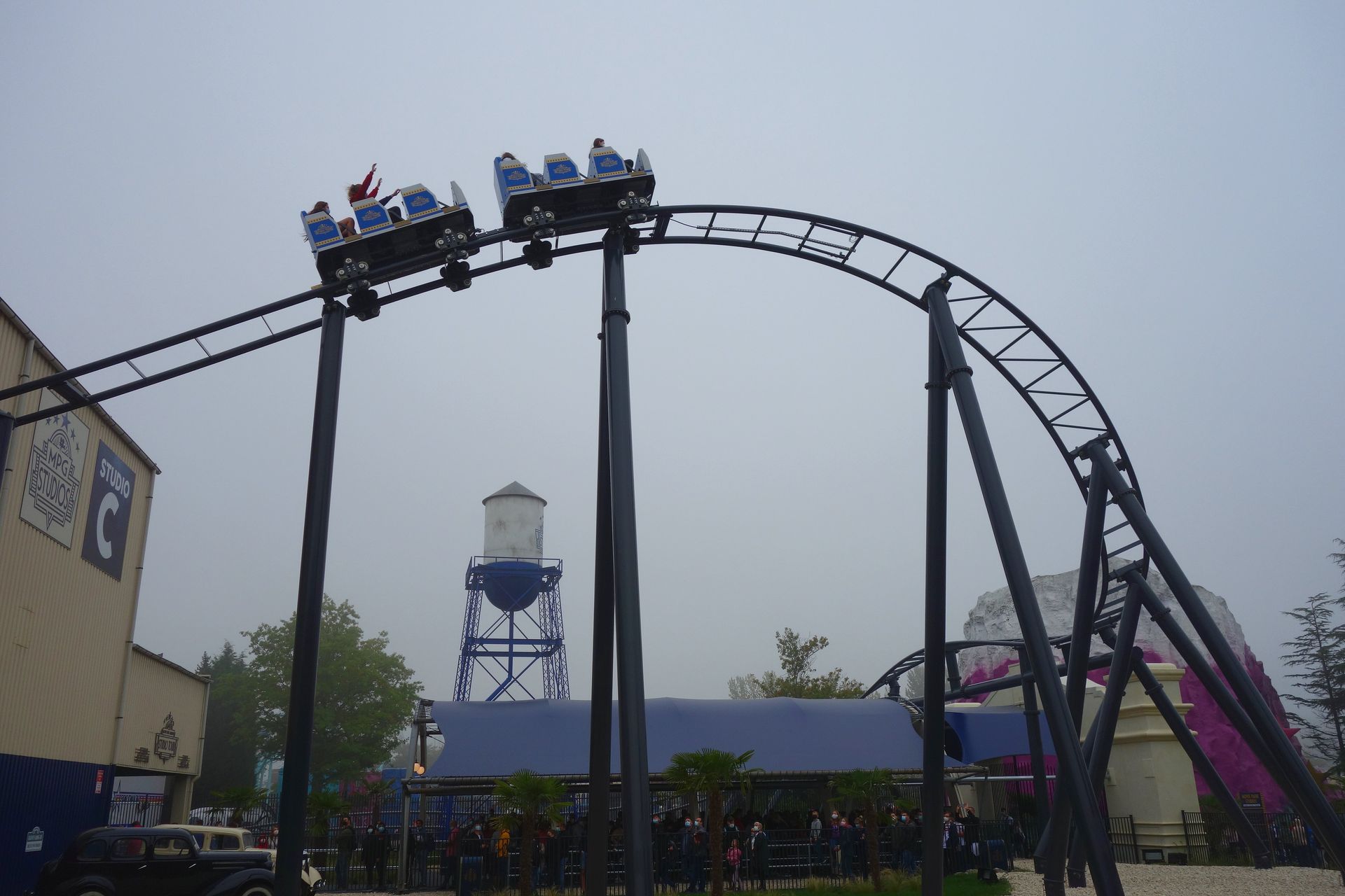 Und so machte ich mich am 18. September 2021, auf den Tag genau 10 Jahre nach meinem letzten Besuch, wieder auf den Weg gen Norden. Aufgrund der zerstörten Eifelstrecke diesmal allerdings nicht per Bahn, sondern mit dem Auto. Damit hatte ich dann auch die Möglichkeit, PowerNagel samt Frau Karlita in Brühl aufzugabeln und mitzubringen. Der Verkehr am frühen Morgen war überschaubar, sodass wir tatsächlich schon gegen 9 Uhr am Haupteingang des Parks vorbeifuhren. Man lotste uns auf den hintersten Parkplatz beim MP XPress, bzw. Lucky Luke. Von der Achterbahn war allerdings nicht sonderlich viel zu sehen, nur ganz schwach waren die Schienen in der dichten Nebelsuppe zu erahnen.