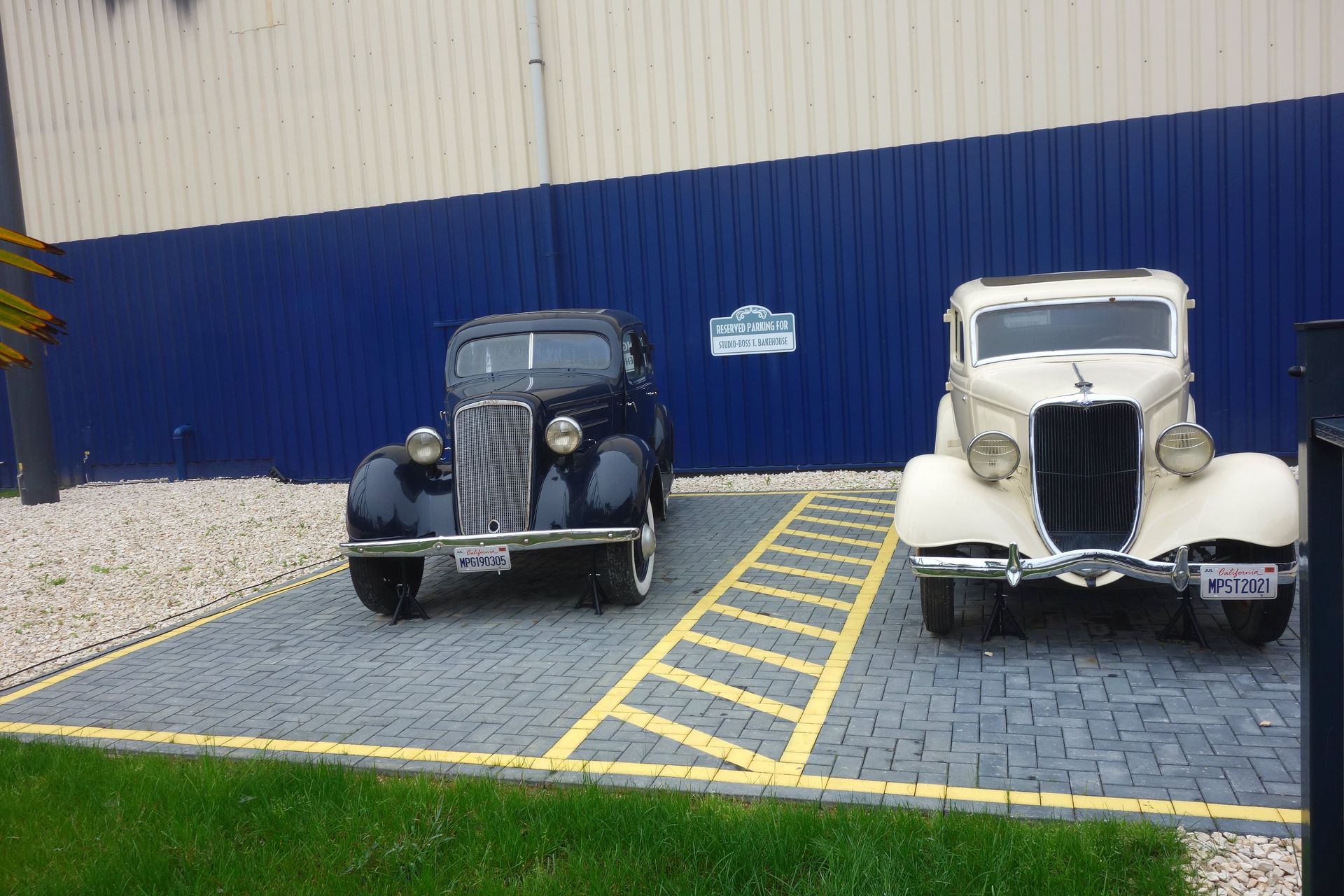 So hat der Wagen auf dem linken Parkplatz, der für den Studio-Boss T. Bakehouse (Thorsten Backhaus, Geschäftsführer des Parks) reserviert ist, das Kennzeichen MPG190305. Ein Hinweis auf den Saisonstart am 19. März 2005, als der Park erstmals unter dem heutigen Namen seine Tore öffnete. Das Kennzeichen MPST2021 am rechten Wagen ist dagegen etwas offensichtlicher und weist auf das Eröffnungsjahr der Movie Park Studios hin, deren Star-Regisseur Steven Thrillberg (Ähnlichkeiten mit real existierenden Personen sind vermutlich rein zufällig
