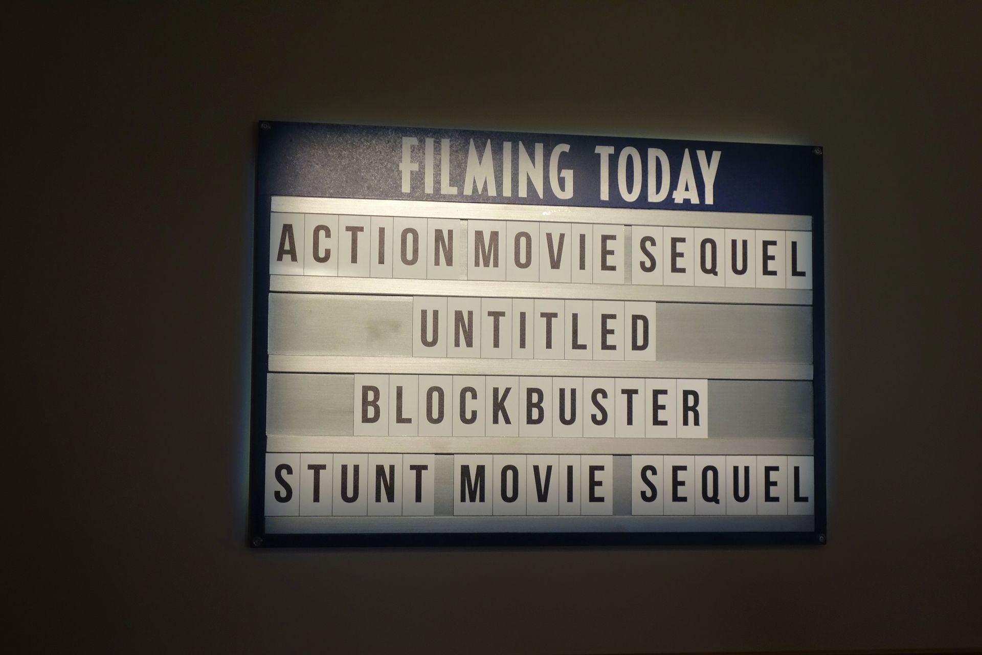 Eine kleine Tafel verrät, bei welchen Filmen wir an diesem Tag dem Studio-Team über die Schulter schauen dürfen.