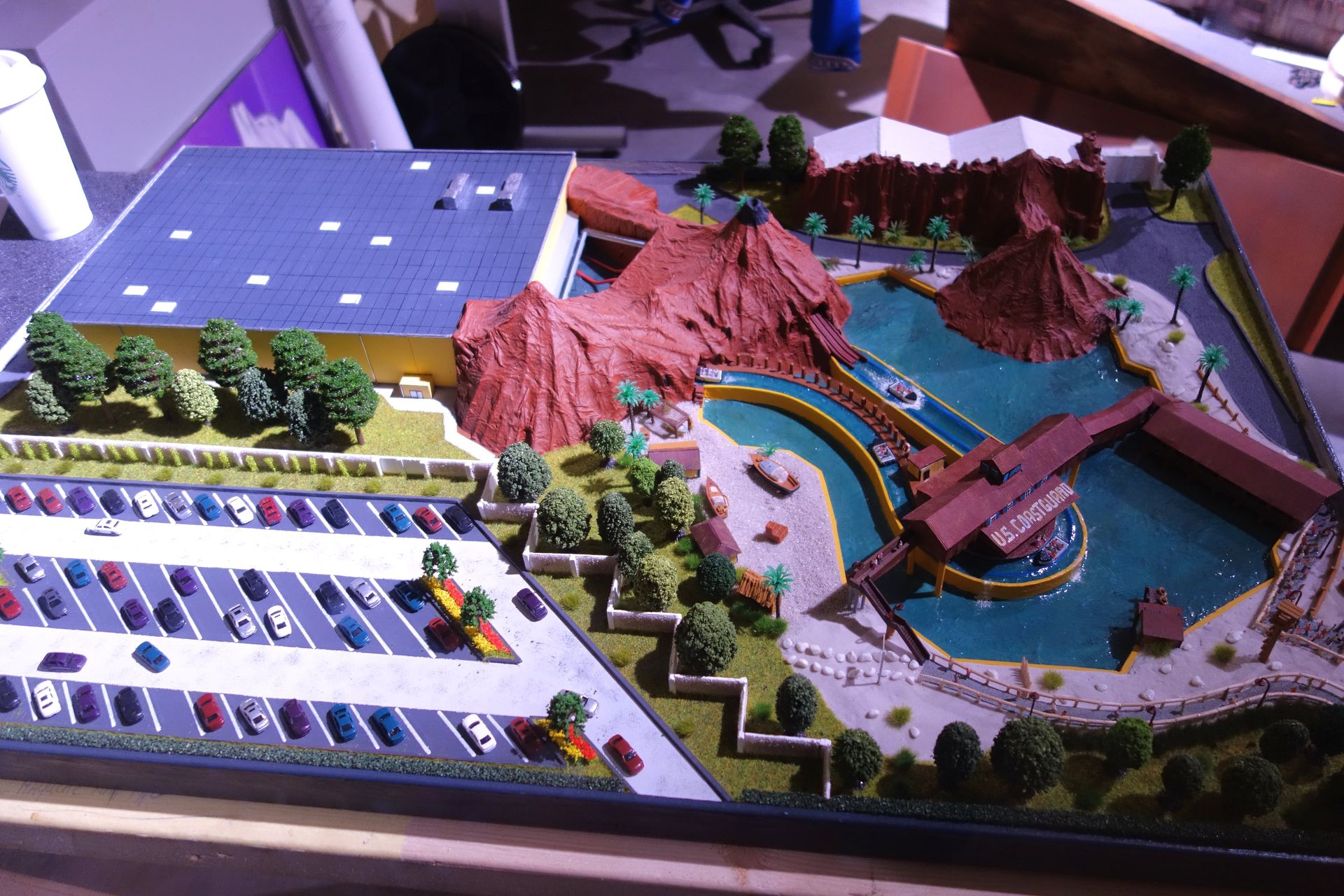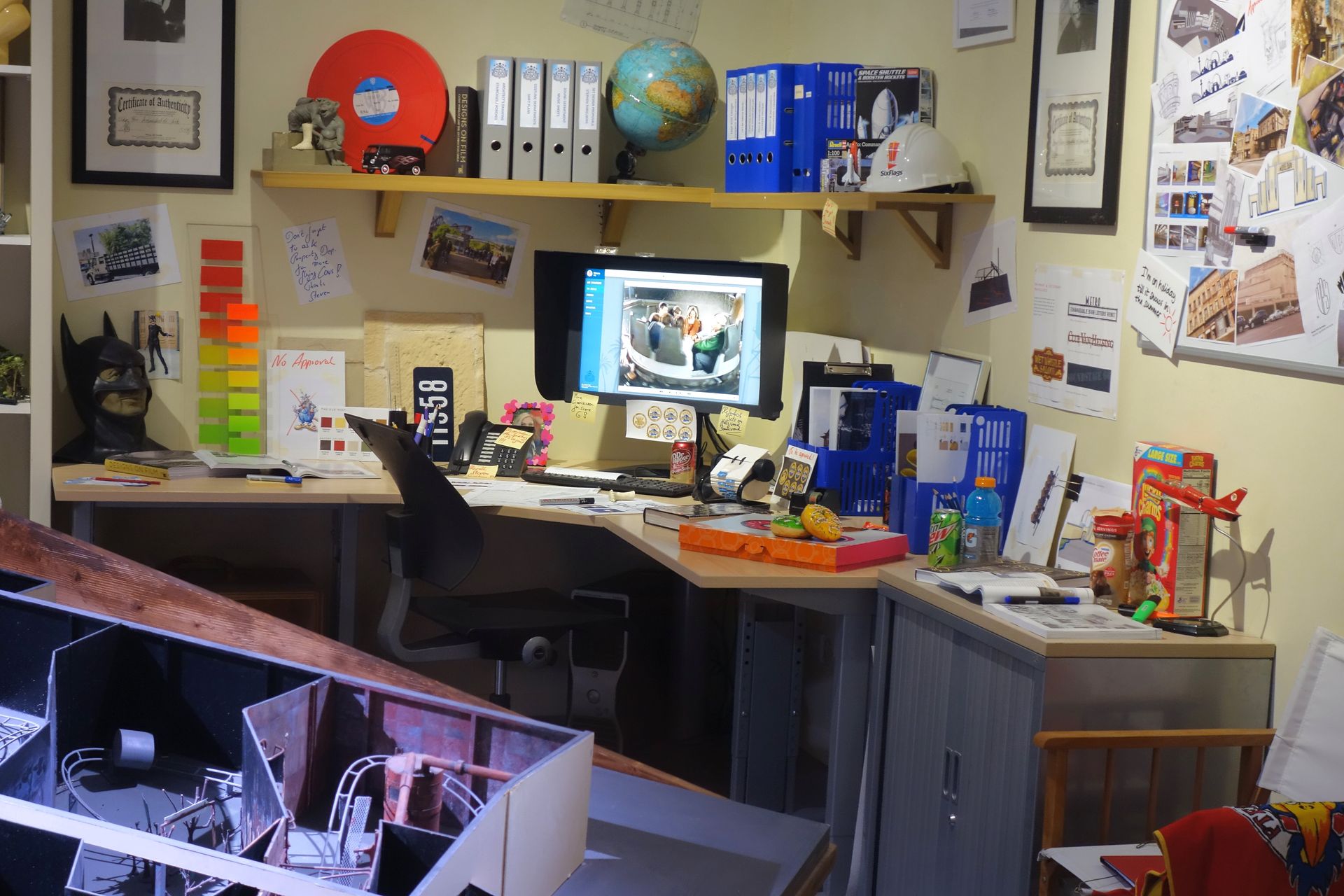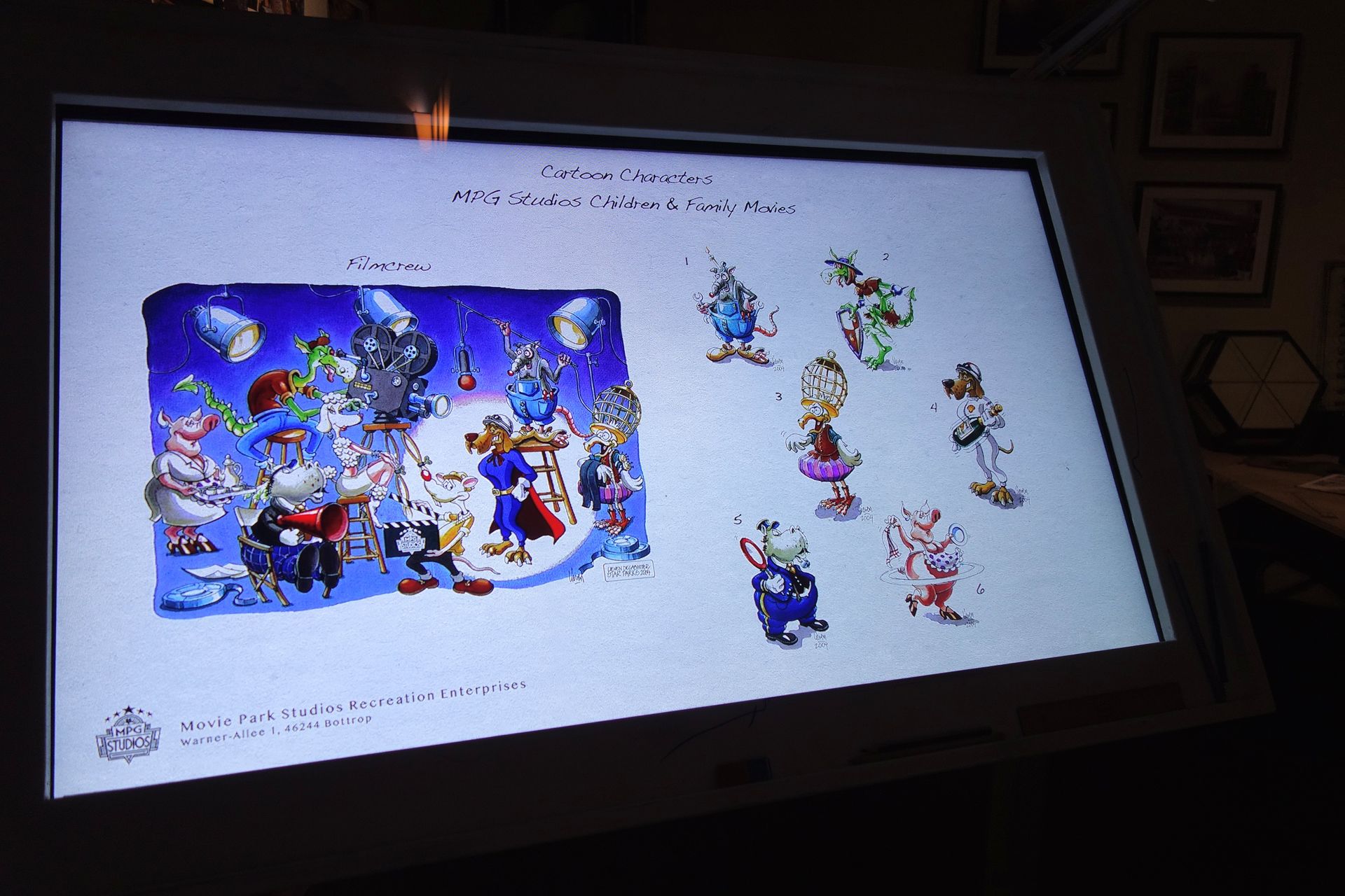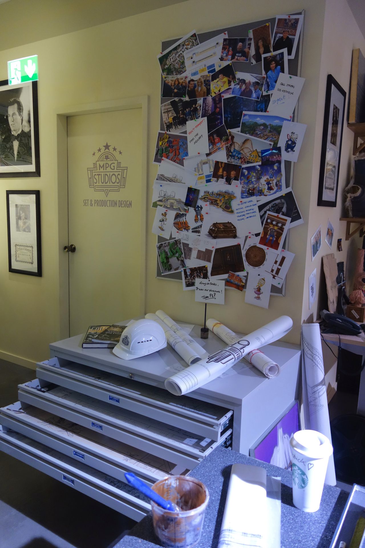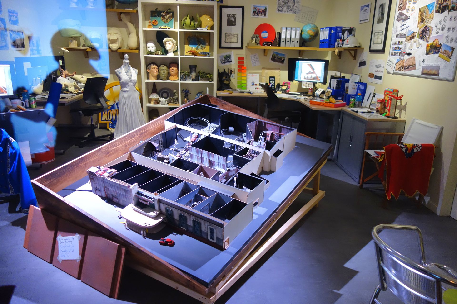 Vorbei an einem ersten Büro mit digitalem Zeichenbrett, das verschiedenste Skizzen aus der Parkgeschichte zeigt,