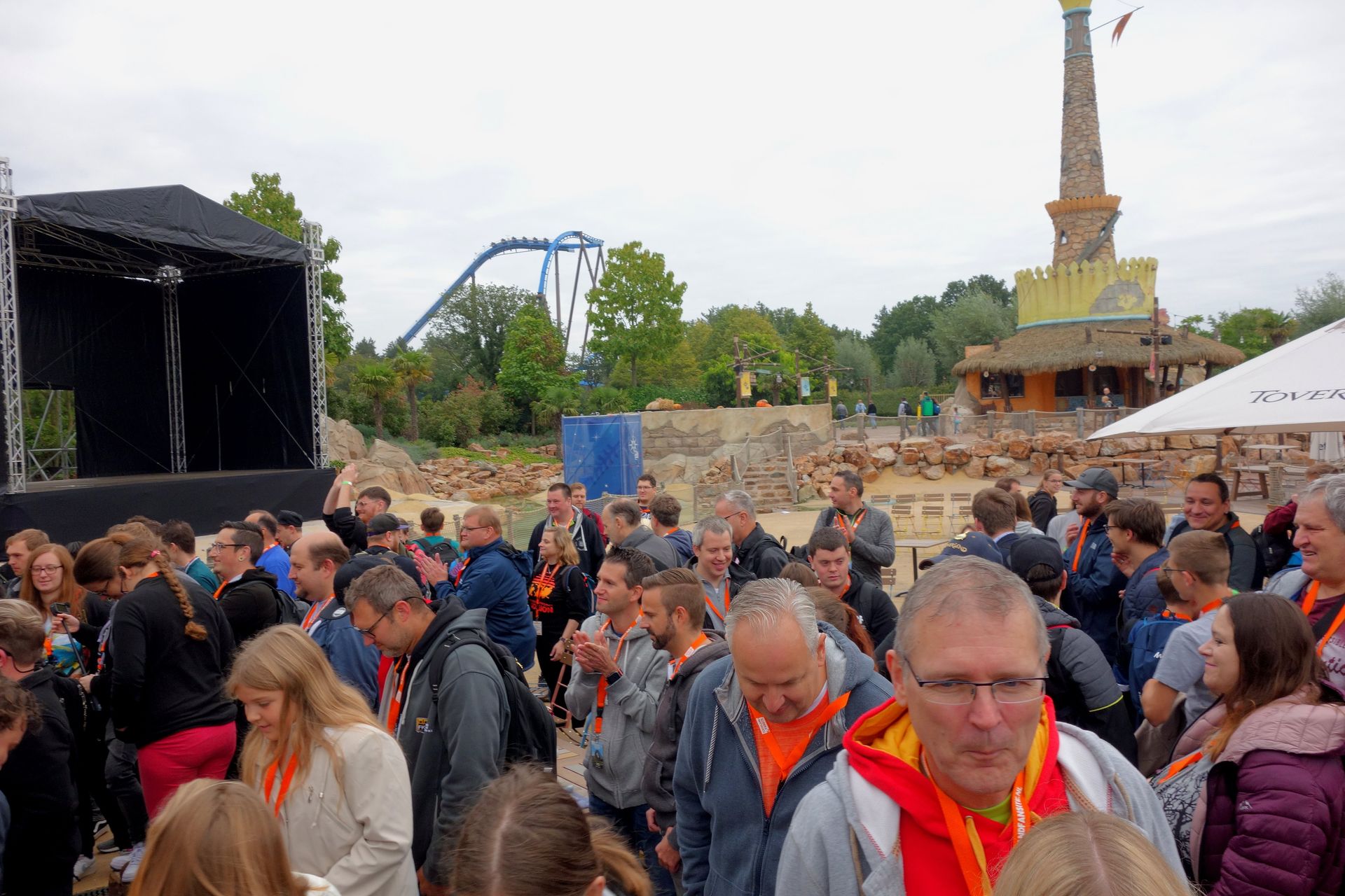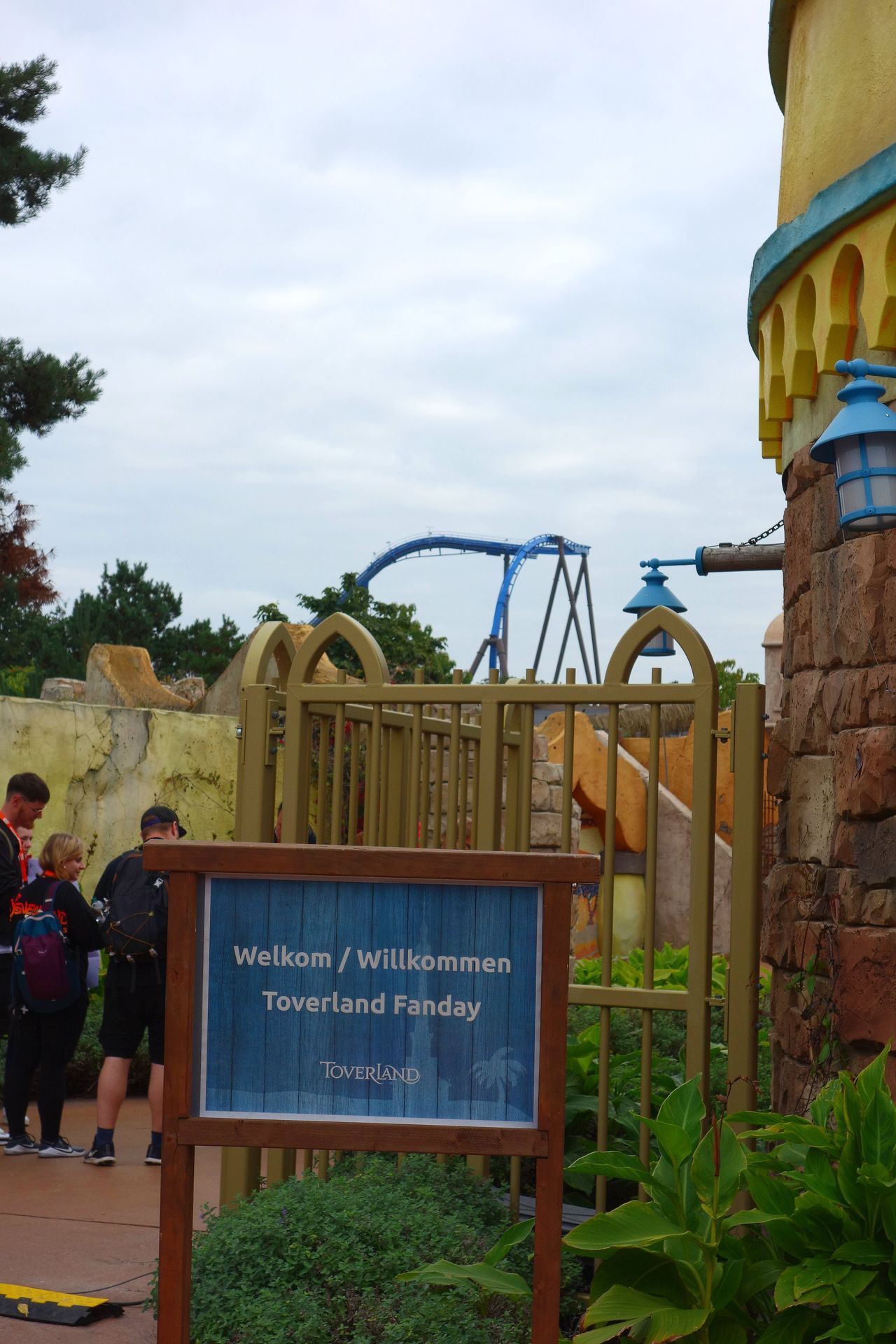 Als wir einige andere in der Reihe mit Zetteln sahen, waren wir zunächst ein wenig verwundert, denn eine Bescheinigung für die Teilnahme oder dergleichen hatten wir alle nicht bekommen. Zur Sicherheit hatte ich zwar die Zahlungsbestätigung dabei, aber die sollten wir tatsächlich nicht brauchen. Bei den Zettelleuten handelte es sich wohl um normale Besucher mit ihren Tickets, die wurden nämlich abgewiesen und warteten schließlich vor den normalen Gates auf ihren Einlass. Uns reichte unser Name, für den die Jungs der Toverland Fansite dann einen personalisierten Briefumschlag mit Schlüsselband, zugehörigem Namensschildchen samt Programm und einem Wristband fürs Buffet am Mittag heraussuchten und ausgaben. Tickets für den Parkplatz gab es bei Bedarf gesondert. Eine (oder waren es zwei?) Mitarbeiterin kontrollierte derweil die Impf- bzw. Testnachweise, die für eine Teilnahme am Buffet erforderlich waren. Der normale Parkbesuch wäre tatsächlich auch ohne möglich gewesen. Und auch sonst sollte der Besuch wieder ganz wie früher werden. Eine Maskenpflicht gab es nicht und auch die Abstandsregel wurde just an diesem Tag aufgehoben. Es durfte in den Warteschlangen also wieder gekuschelt werden.