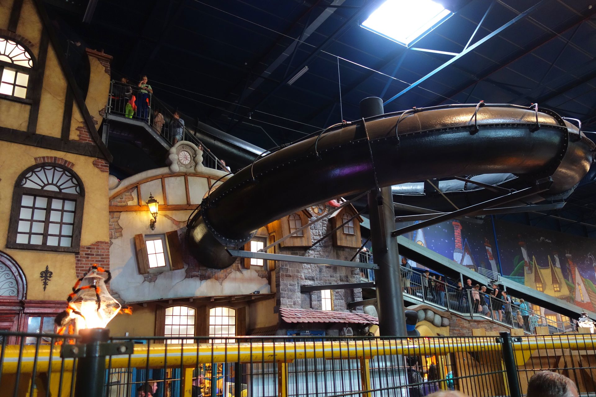 Die Treppen sind tatsächlich ziemlich steil, das ist schon grenzwertig. Früher soll es da ja sogar noch ein Drehkreuz gegeben haben, das ist inzwischen aber verschwunden. Schade ist auch, dass die Hallenseite zu Lift und Schlussbremse (noch?) nicht thematisiert wurde. Es müsste ja keine detailreiche Felswand sein, man sieht die Wand ja wirklich nur kurz, wenn man in der Schlussbremse steht. Aber diese einfache, grüne Blechwand stört das Gesamtbild doch etwas - wobei ich zugeben muss, dass die recht glatte Wand hier weniger auffällt als die "Wellblech"-Verkleidung der Arthur-Halle im Europa Park...