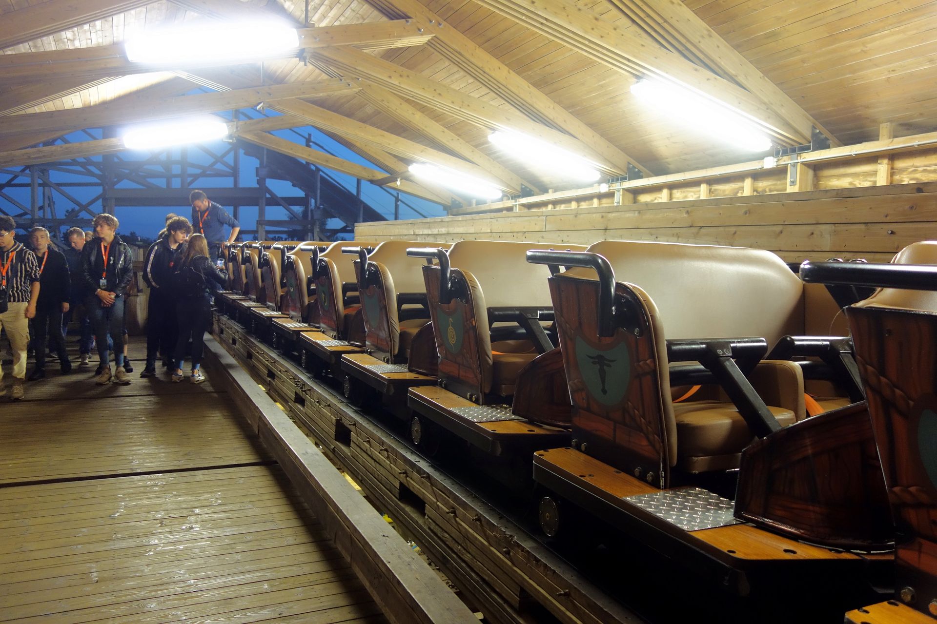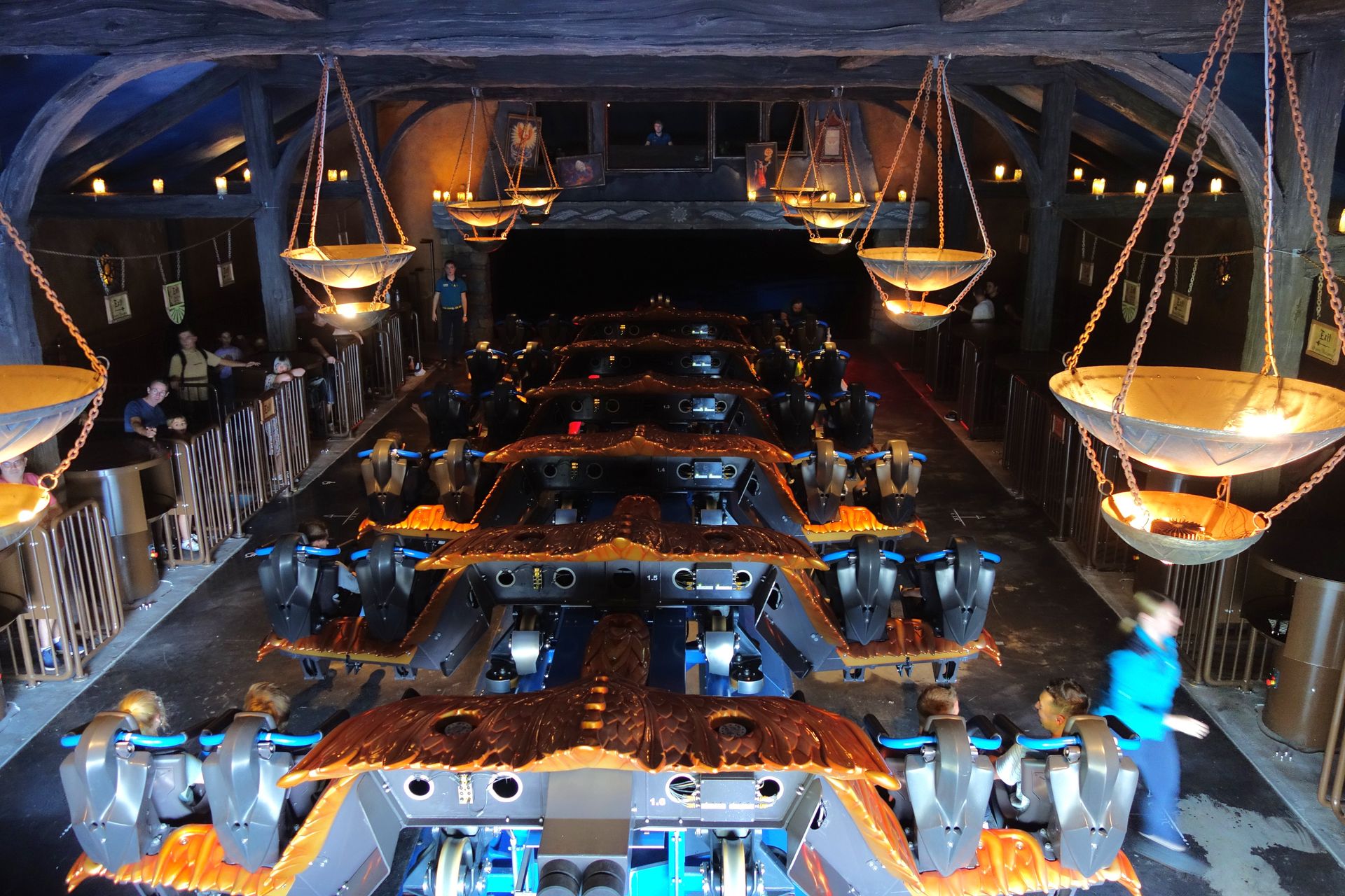 Man hatte von Seiten des Parks wohl mit mehr Andrang gerechnet, jedenfalls war der Indoor-Wartebereich in seiner vollen Länge geöffnet - inklusive eines kleinen Schlenkers nach draußen. Später wurde der zu durchlaufende Teil zum Glück etwas eingekürzt. Ein bisschen fehlte mir auch die Übersicht, wo man sich jetzt für welche Seite entscheiden kann, wie immer entdeckte ich die Aufteilung erst bei späteren Fahrten. Im ersten Versuch landeten wir jedenfalls links. Und die Station war nahezu leer, bei zwei Zügen konnte man sogar in der ersten Reihe spätestens im übernächsten einsteigen, mit etwas Glück konnte man in der Mitte sogar sitzen bleiben. Das hatte ich so tatsächlich überhaupt nicht erwartet, und war ein erfreulicher Kontrast zum überlaufenen Movie Park in der Woche zuvor. Wartebereich und Station sind sehr schön thematisiert, die Kurve und das Verschiebegleis vor dem Lift können da leider nicht wirklich mithalten. Der riesige Drachenkopf, der oberhalb der Hallenausfahrt die Wand durchbrochen hat und sich leicht sabbernd hin und her bewegt, kann nur bedingt von der ansonsten weitestgehend leeren Halle ablenken. Das ist halt der Nachteil an den breiten Zügen, ganz davon abgesehen, dass es sich wie gesagt um das Verschiebegleis handelt, wo man gestalterisch noch mehr eingeschränkt ist. Aber es gäbe doch sicher Mittel und Wege, diesen potentiellen Darkride-Part besser auszunutzen.