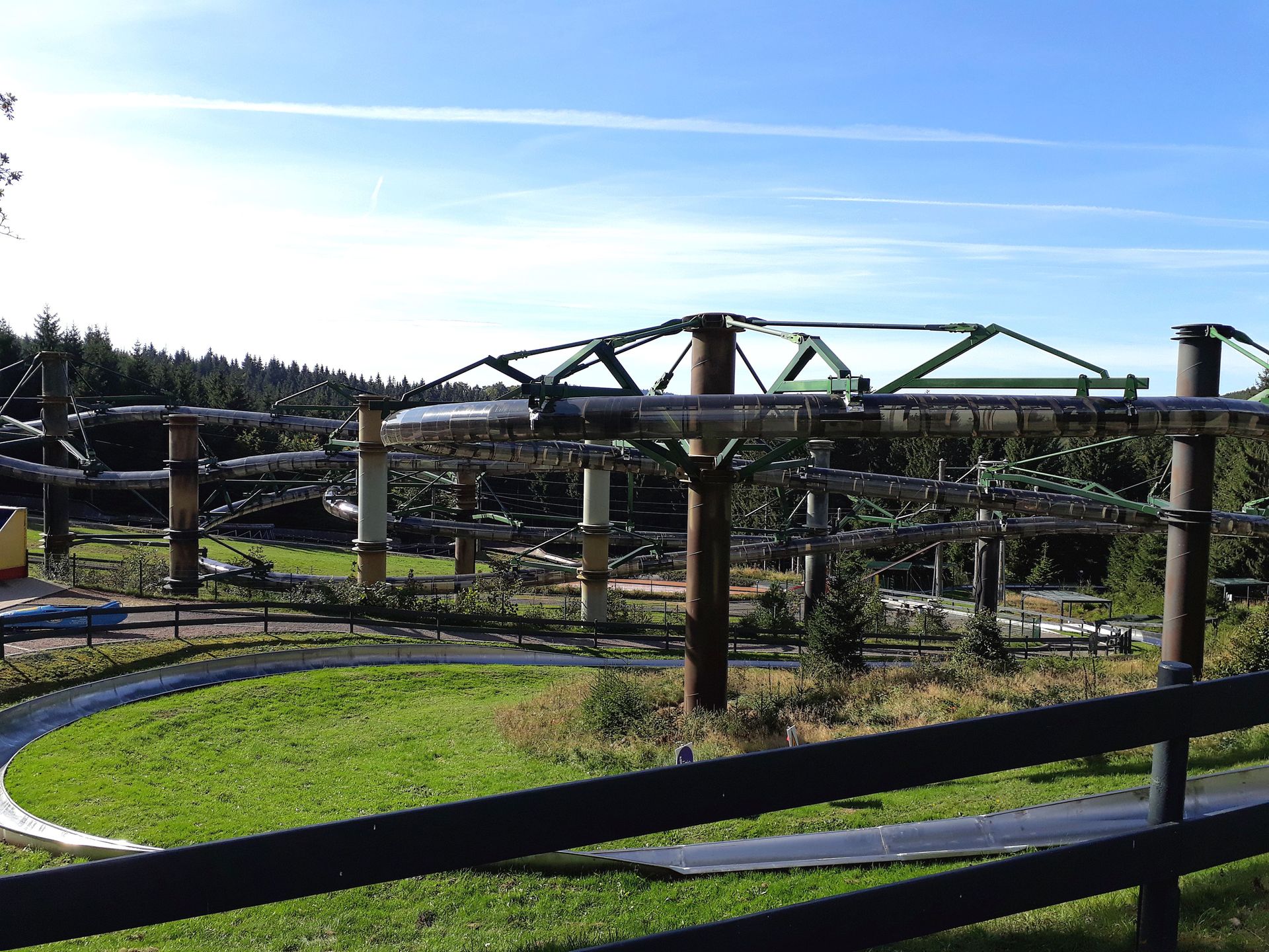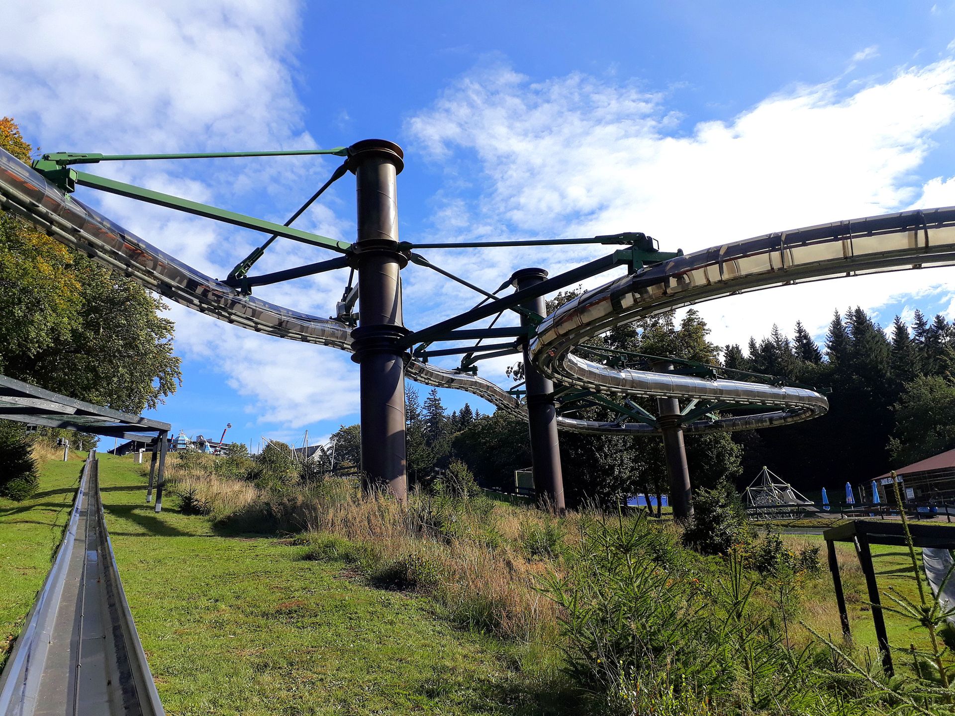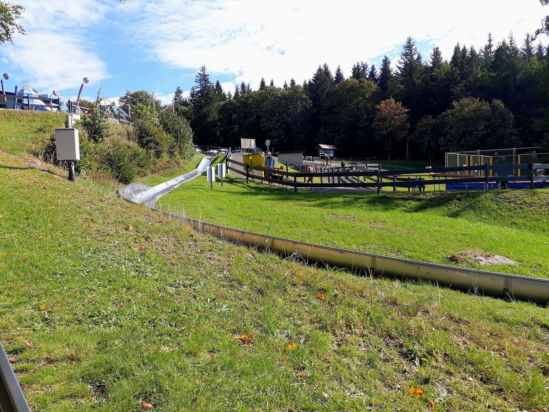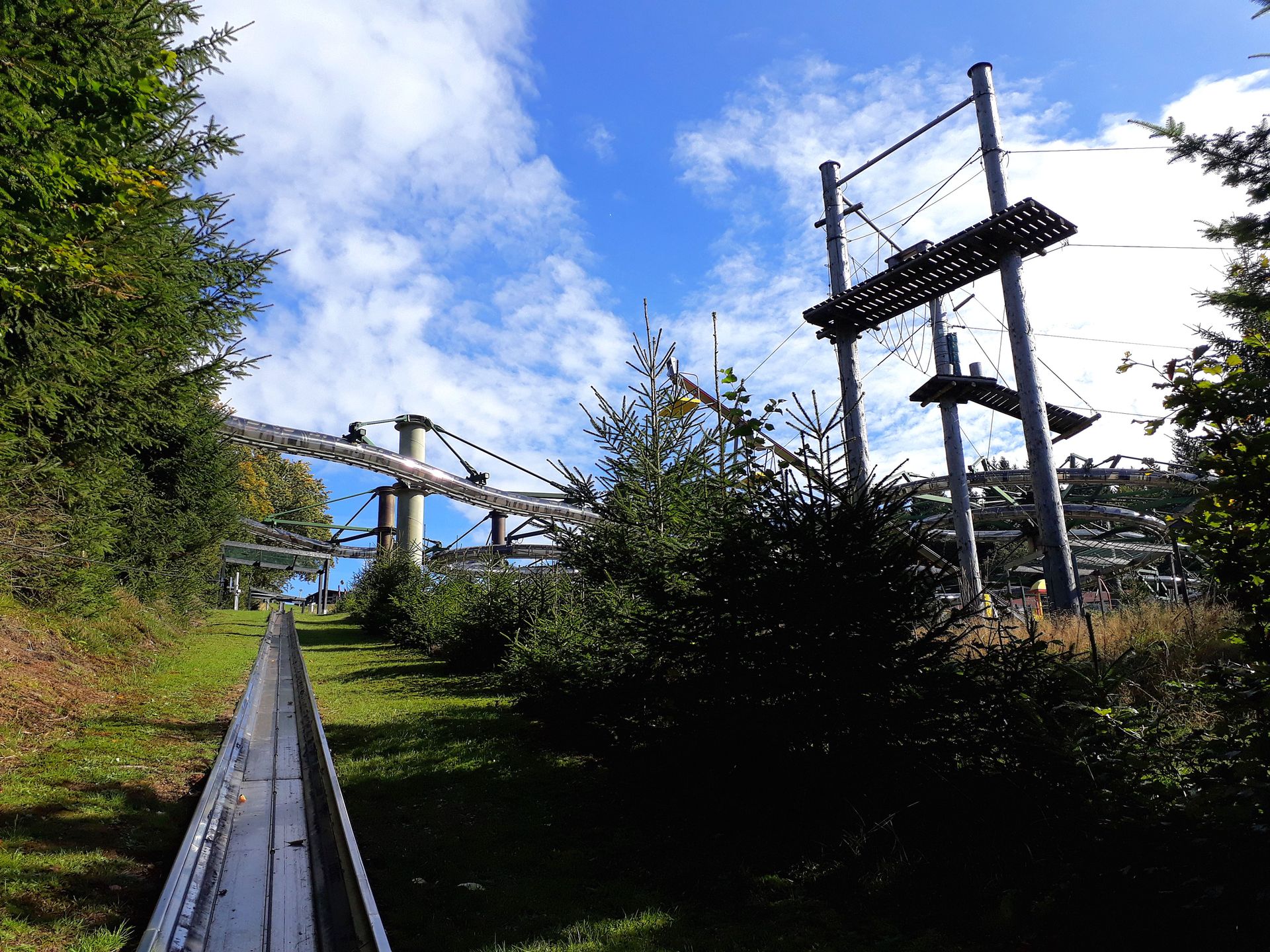 Da die Rinne noch leicht feucht und dreckig sei, sollten wir etwas vorsichtiger fahren, was wir auch taten. Von Feuchtigkeit habe ich allerdings wenig gemerkt. Im stärker bewaldeten Teil unten lag halt etwas Laub und Dreck in der Bahn, das schien die Bremswirkung aber auch nicht signifikant zu beeinträchtigen. Nach den ersten noch recht offenen Kurven mit kleinem Jump durch den Funpark verschwindet die Strecke wie gesagt im Wald und ist von außen nicht mehr einzusehen. Der Besuchs wird nach unten hin immer dichter und man wundert sich dann doch irgendwann, wie weit es denn noch nach unten geht. Dabei beträgt die Höhendifferenz angeblich nur 65 Meter - im Gegensatz zu 111 Metern bei der deutlich kürzeren Bahn in Ruhla. Auch hier gibt es kein Mega-Highlight, aber langweilig sind die 1.000 Meter Bergabstrecke dennoch nicht.
