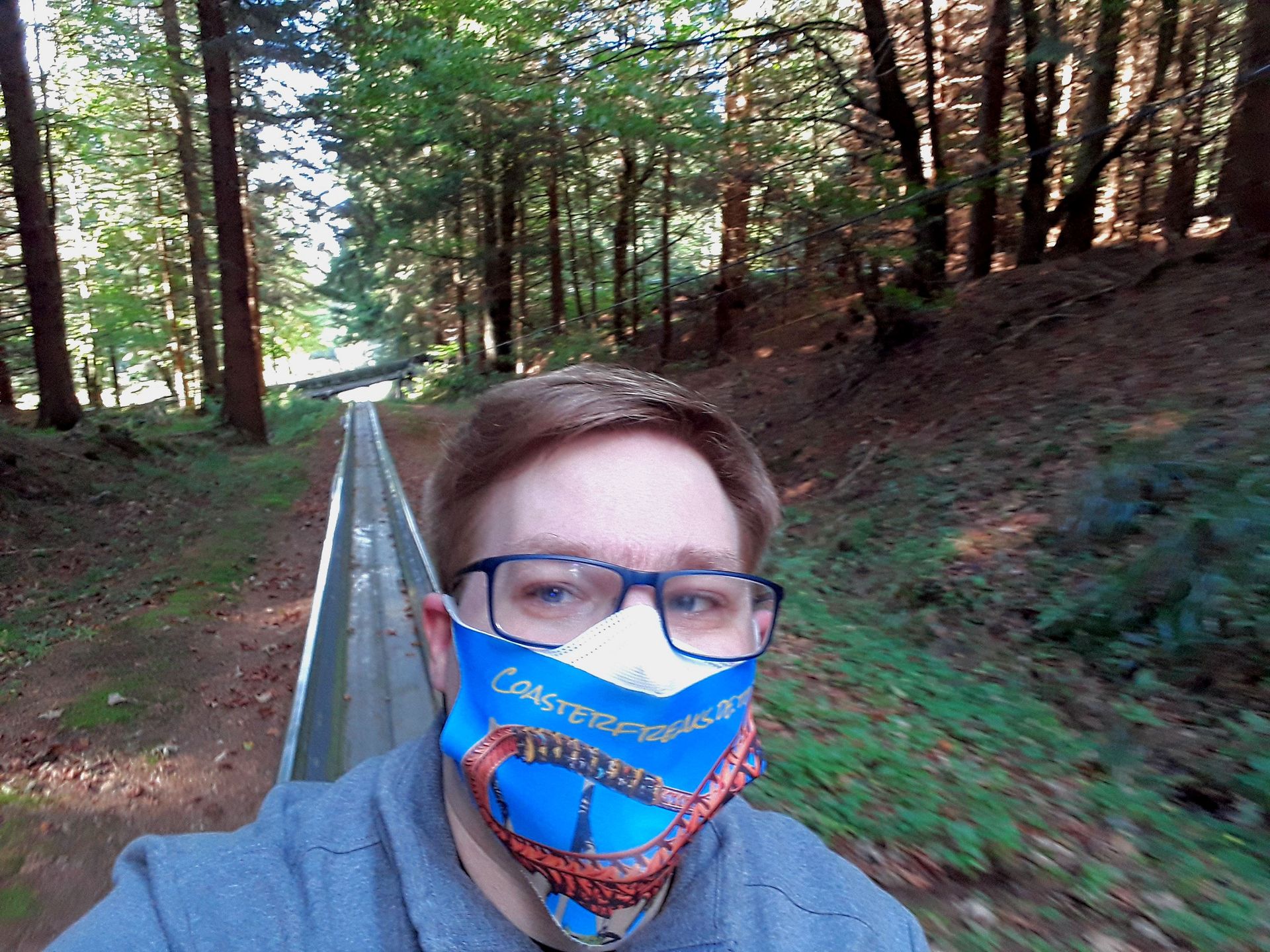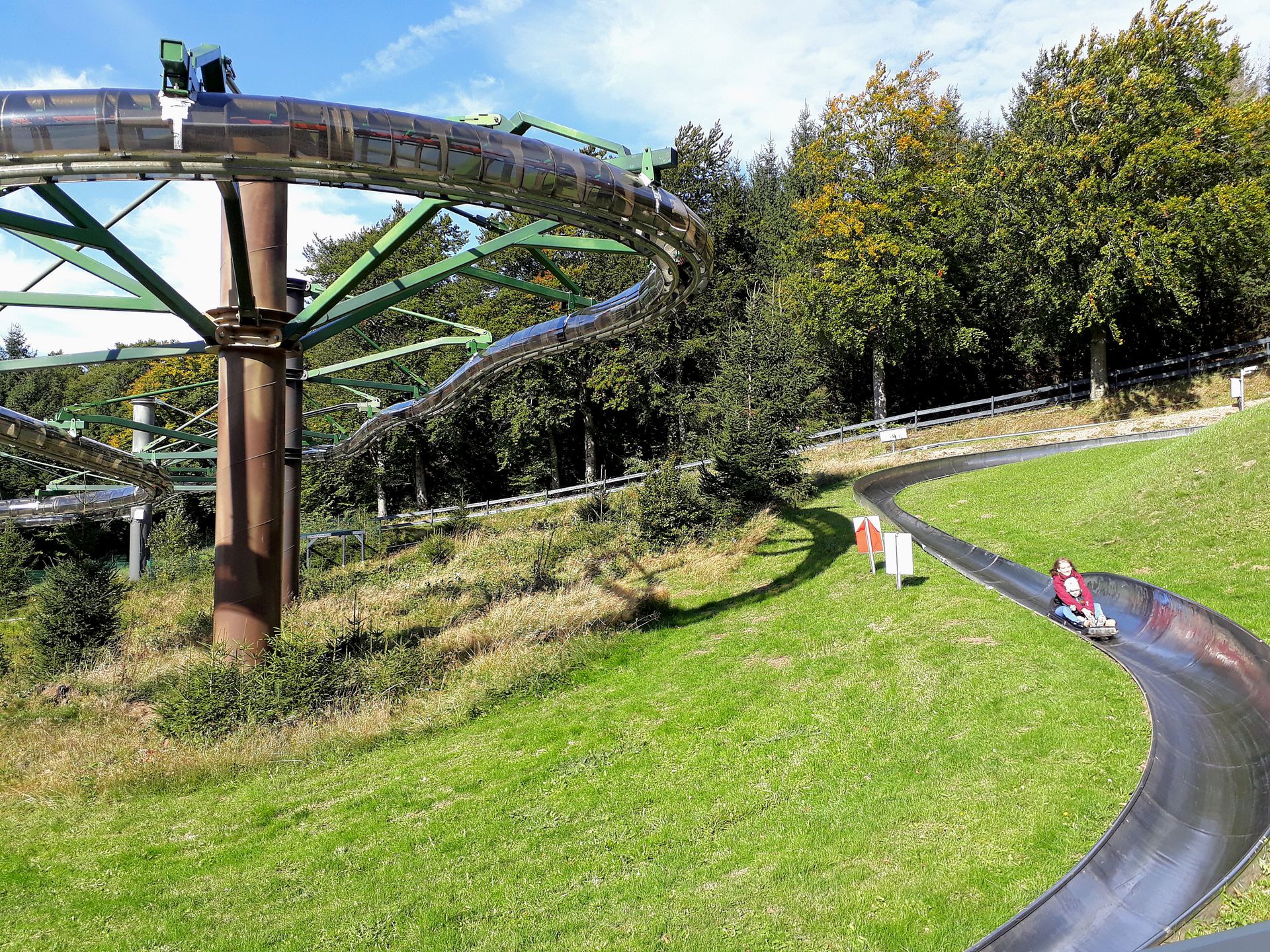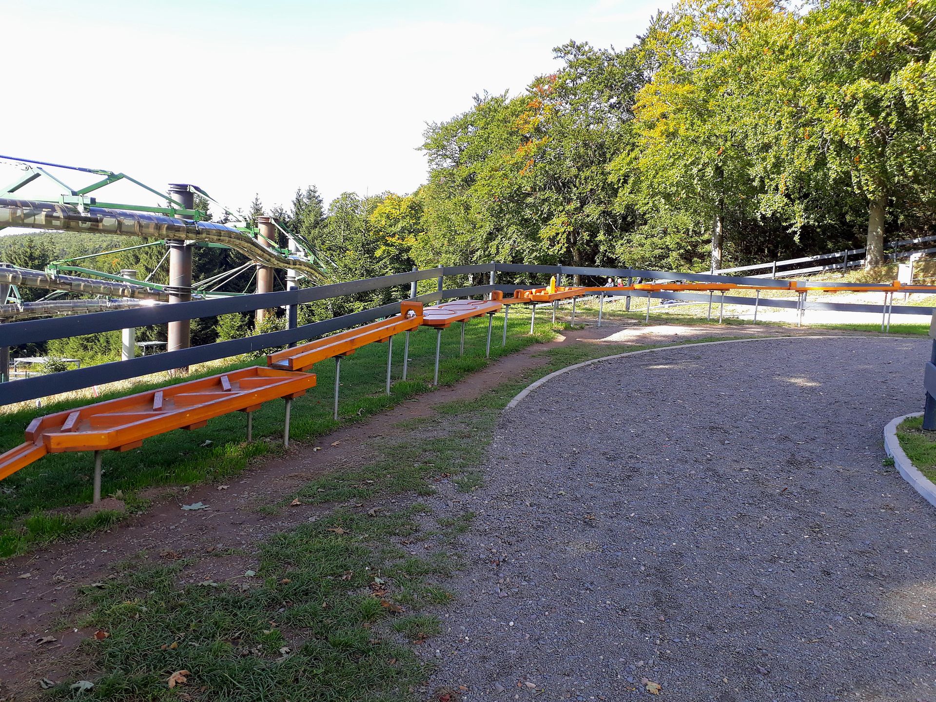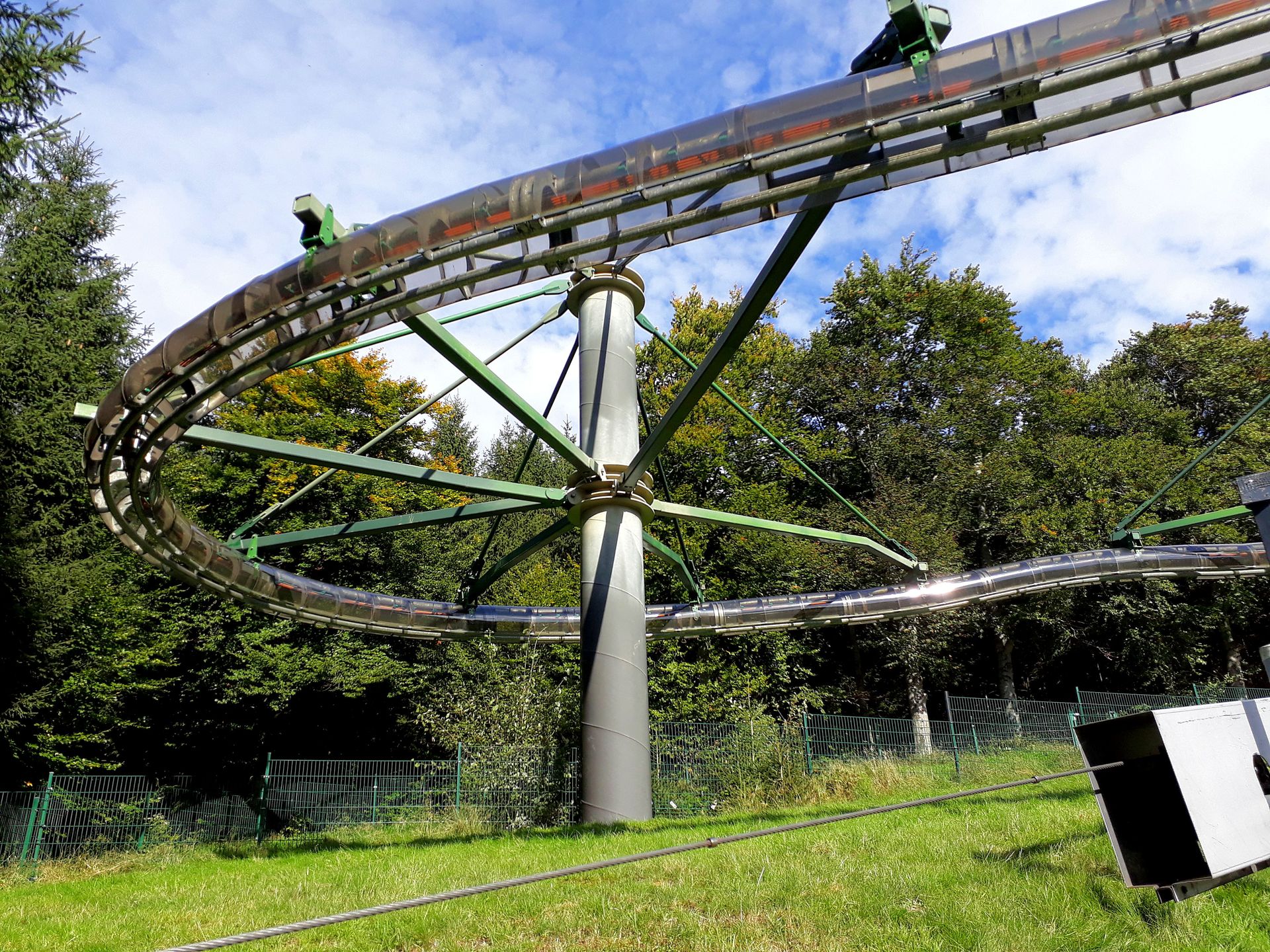 Da die Rinne noch leicht feucht und dreckig sei, sollten wir etwas vorsichtiger fahren, was wir auch taten. Von Feuchtigkeit habe ich allerdings wenig gemerkt. Im stärker bewaldeten Teil unten lag halt etwas Laub und Dreck in der Bahn, das schien die Bremswirkung aber auch nicht signifikant zu beeinträchtigen. Nach den ersten noch recht offenen Kurven mit kleinem Jump durch den Funpark verschwindet die Strecke wie gesagt im Wald und ist von außen nicht mehr einzusehen. Der Besuchs wird nach unten hin immer dichter und man wundert sich dann doch irgendwann, wie weit es denn noch nach unten geht. Dabei beträgt die Höhendifferenz angeblich nur 65 Meter - im Gegensatz zu 111 Metern bei der deutlich kürzeren Bahn in Ruhla. Auch hier gibt es kein Mega-Highlight, aber langweilig sind die 1.000 Meter Bergabstrecke dennoch nicht.