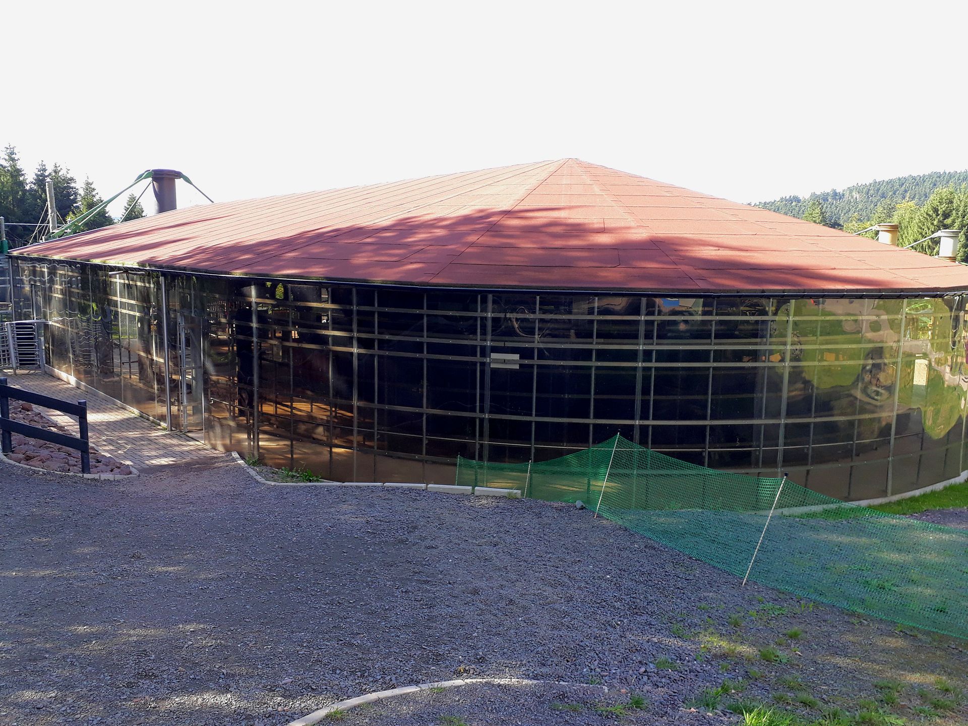 Dieser recht klobige Plexiglas-Bau ist die Station mitsamt Wartebereich, Abstellanlage und Werkstatt.