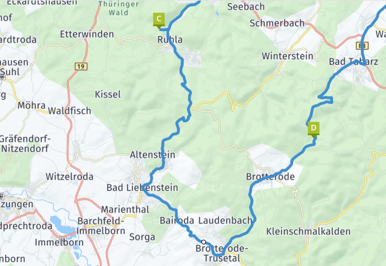 Der Umweg über Bad Liebenstein und Trusetal war (inklusive des mehrfachen Wendes) fast doppelt so weit wie der direkte Weg.