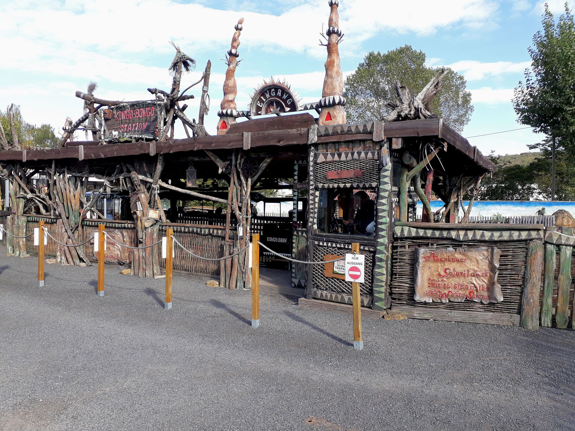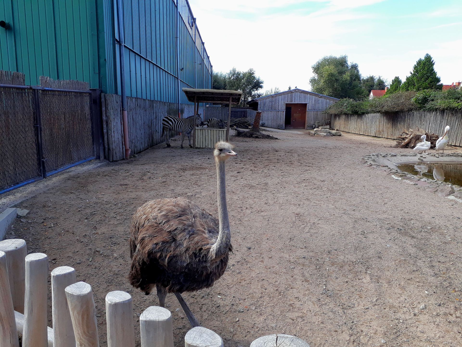 Zwischen der großen Halle und den nächsten Wohnhäusern des Ortes findet sich eine afrikanische Savanne mit Zebras, Straußen und Co.