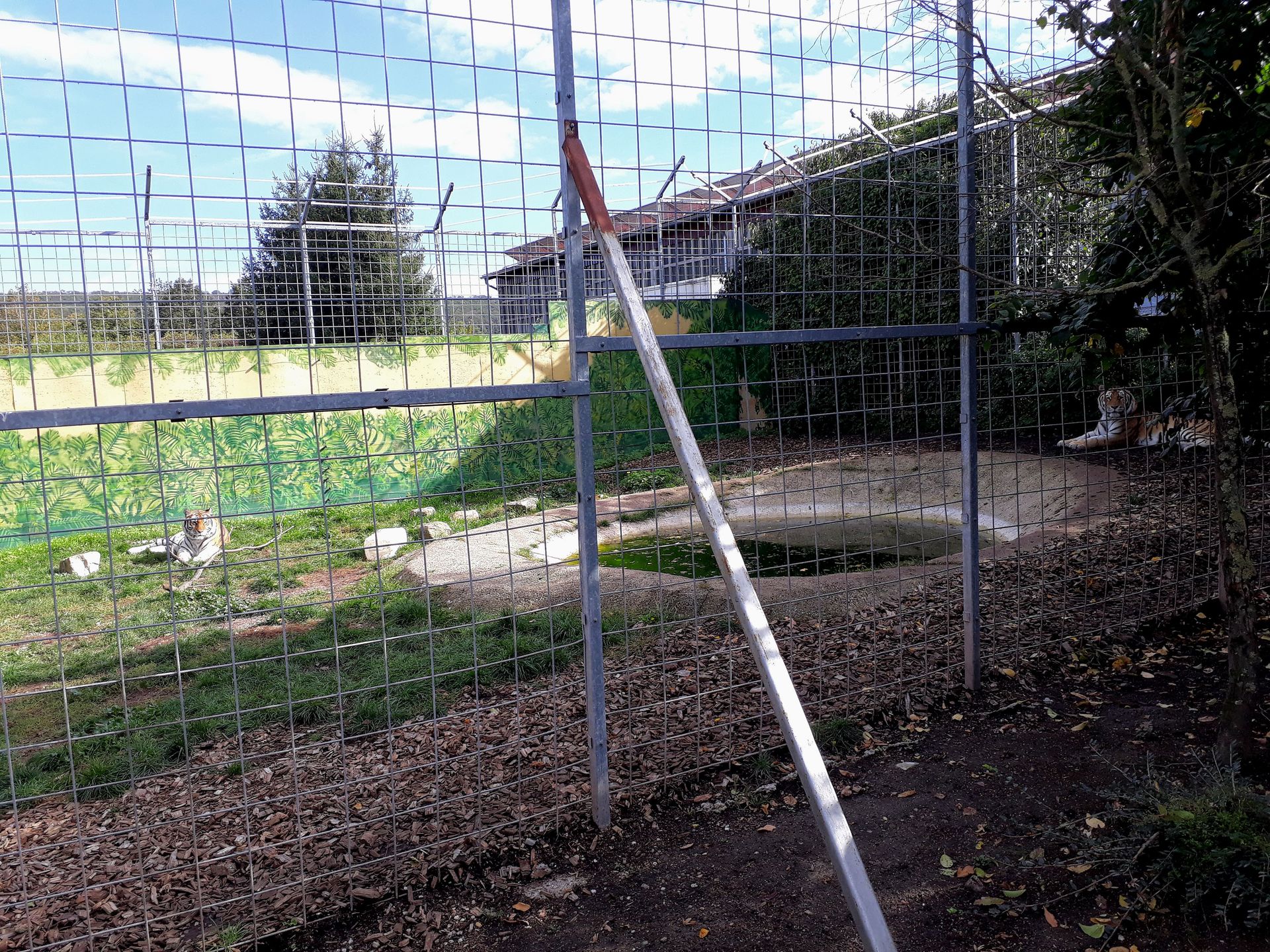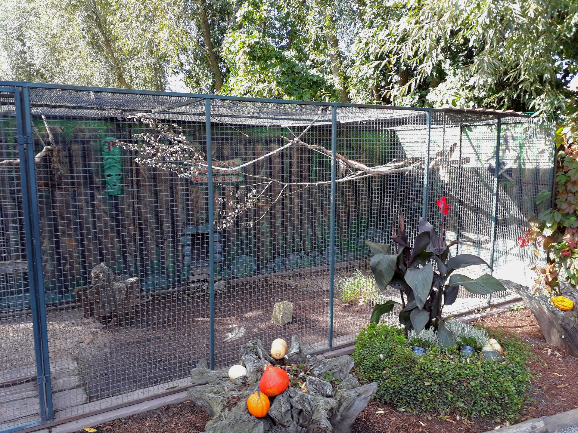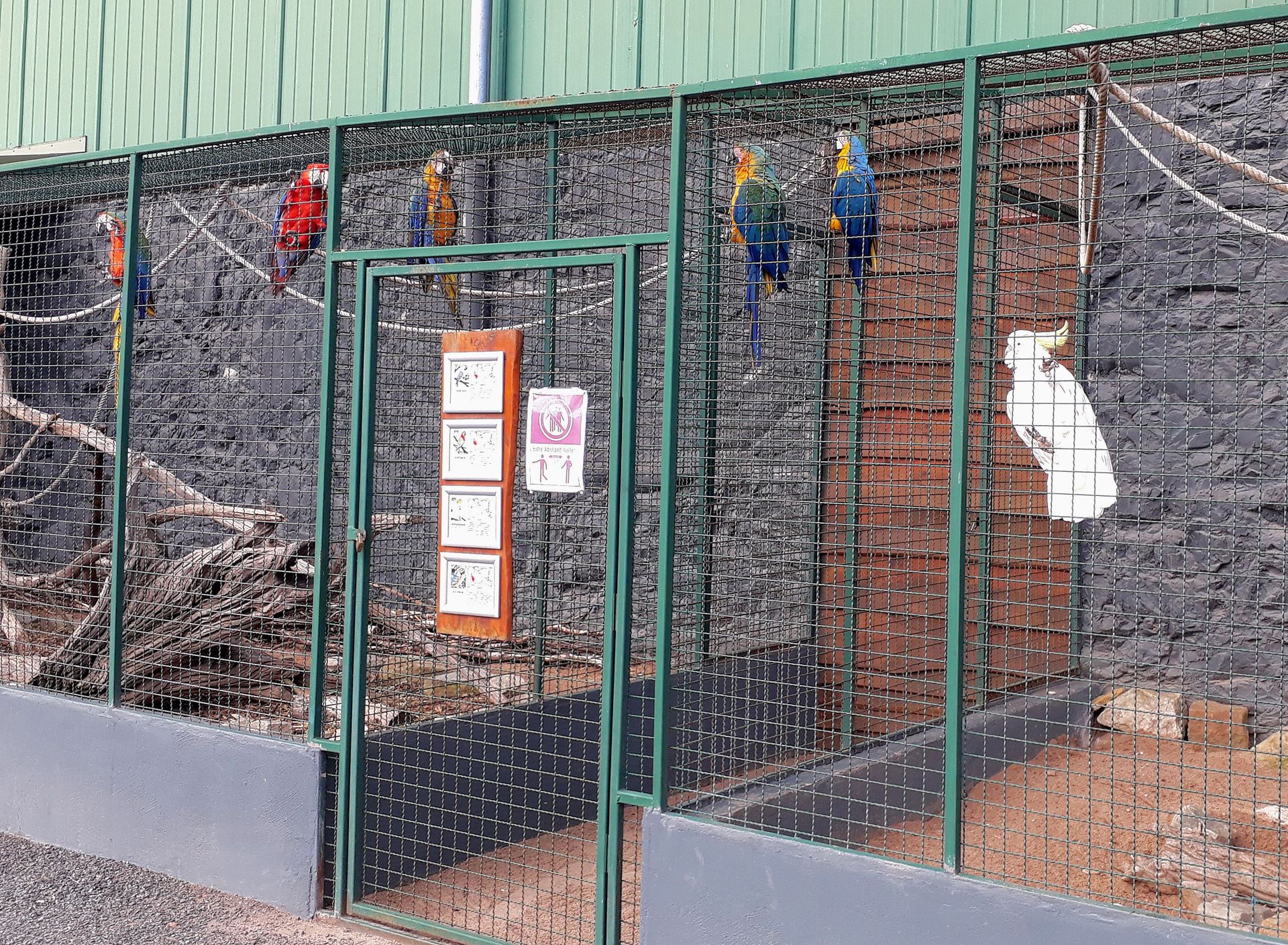Noch fanden wir sie in einem Käfig an der Außenwand des Parks zu einem KFZ-Servicebetrieb vor, wo laut Plan Graupapageien hätten sein sollen.