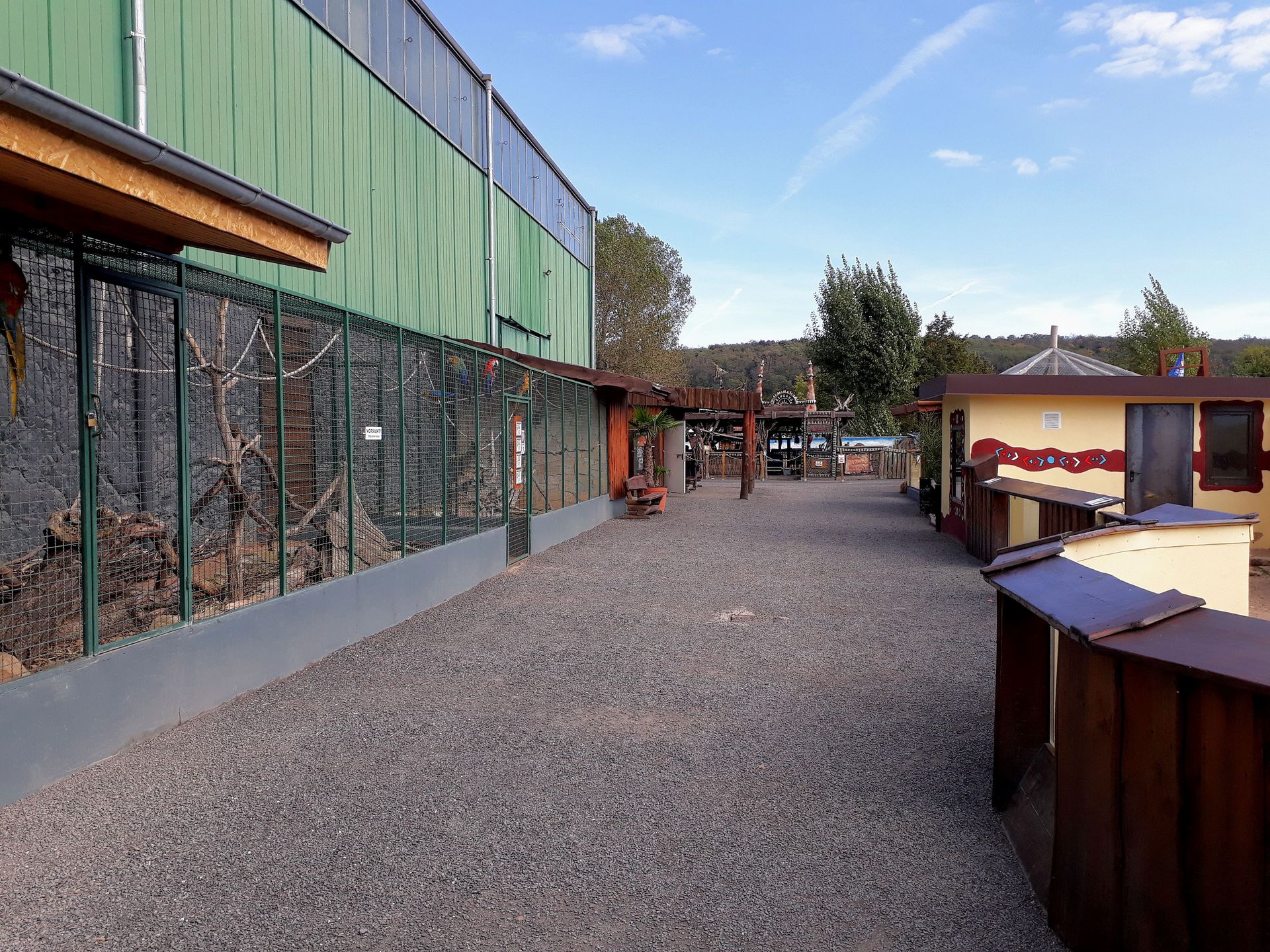 Auf der anderen Seite der Halle führt eine von Volieren und Gehegen gesäumte Gasse nach hinten.