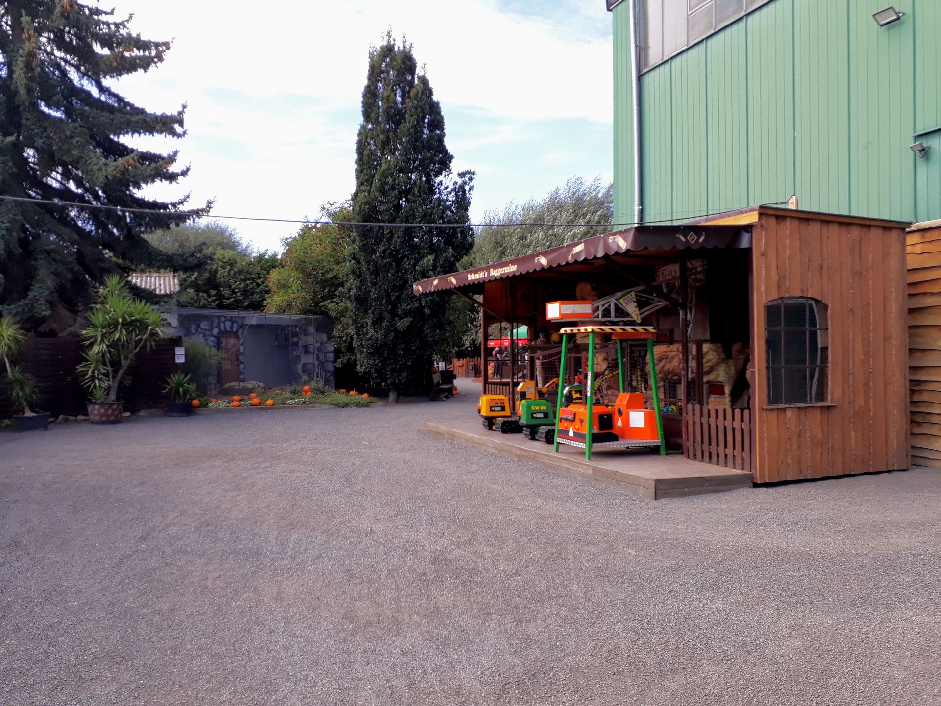 Die langgezogene, grüne Halle direkt hinter dem Eingang des Parks war bei unserem Besuch nicht zugänglich - mir wäre jedenfalls keine offene Tür aufgefallen. Im vorderen Teil war bis 2013 wohl eine Dschungel-Halle mit Picknickplatz und Tretcarbahn zu finden. Nach der Übernahme durch Uwe Gehrmann wurde dort zunächst eine Show-Arena eingerichtet, ehe man im Jahr 2017 eine ganzjährig geöffnete Indoor-Spielhalle ankündigte. Man rechnete mit einer Eröffnung zum Ende des Jahres und hatte die ersten Teile offenbar auch rechtzeitig auf dem Hof stehen, die Baugenehmigung ließ allerdings auf sich warten, da die Umnutzung eine Prüfung des Brandschutzes und ein neues Emissionsgutachten erforderlich machte. Als man laut verschiedenen Artikeln endlich grünes Licht bekam, war es schon 2019. Auf dem von uns erhaltenen Parkplan war aber auch weitere zwei Jahre später noch "Indoorspielhalle in Planung" aufgedruckt. Ich könnte mir vorstellen, dass die Halle eigentlich fertig ist, dank Corona aber noch nicht freigegeben werden konnte. Möglicherweise waren deswegen auch die Pferdeställe im hinteren Teil der Halle geschlossen.