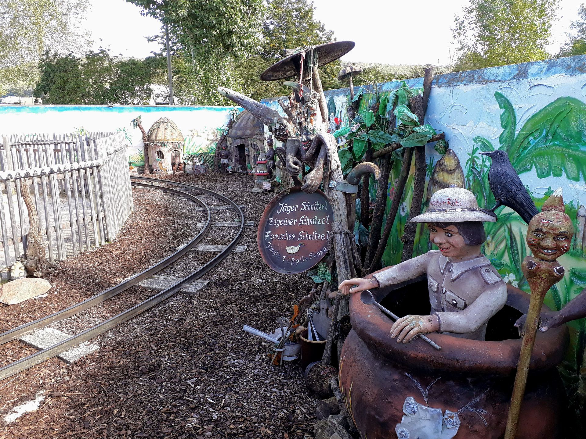 Hinter dem Spielplatz geht es in eine kleine Sackgasse, wo früher eine Eisenbahn ihre Runden um Karussells und ein Riesenrad drehte.