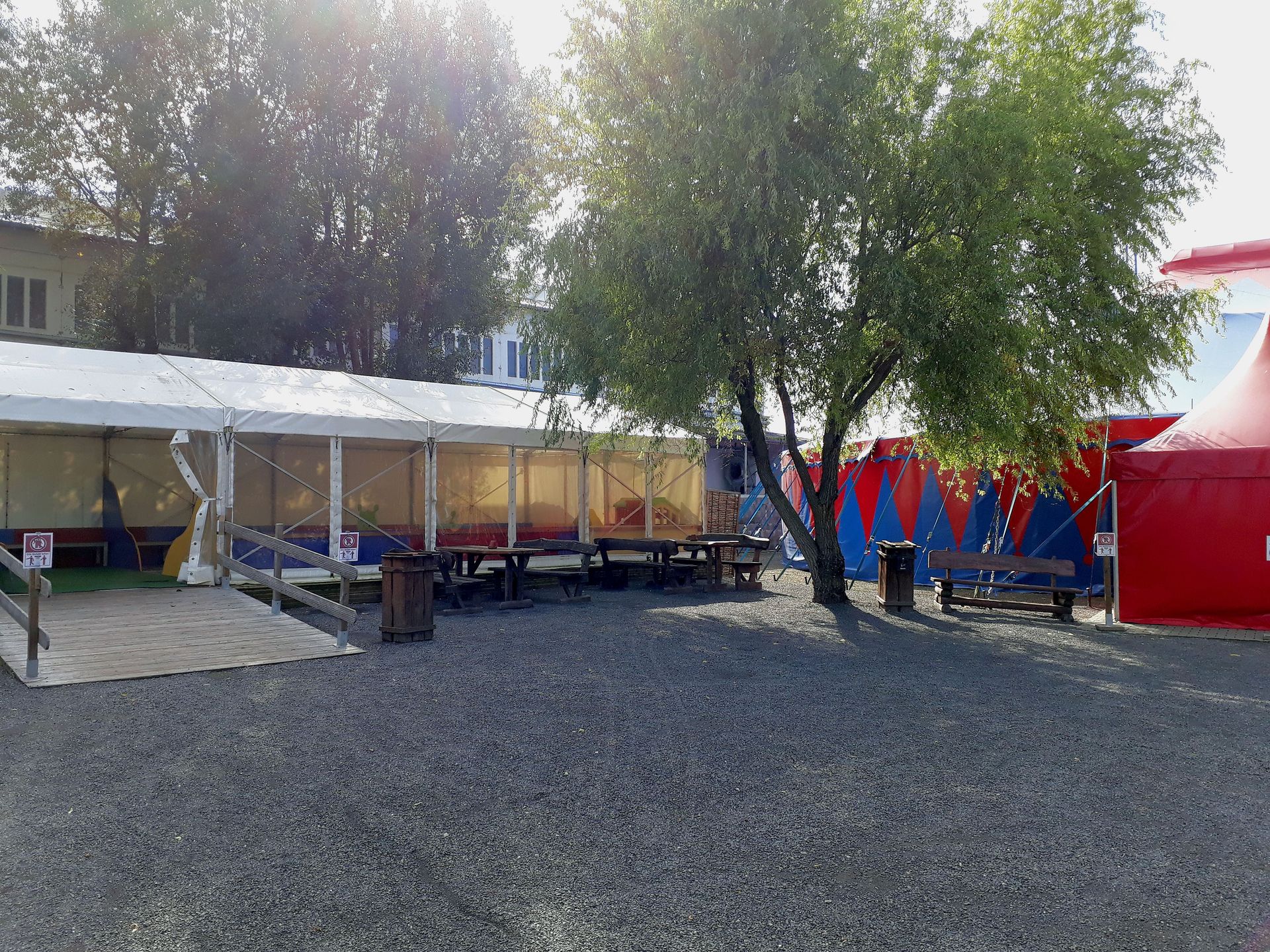 Der Sitzbereich des "Restaurants" befindet sich nach wie vor in einem Zelt, der alte Zirkuswagen mit der Küche wurde aber durch ein festes Gebäude ersetzt.