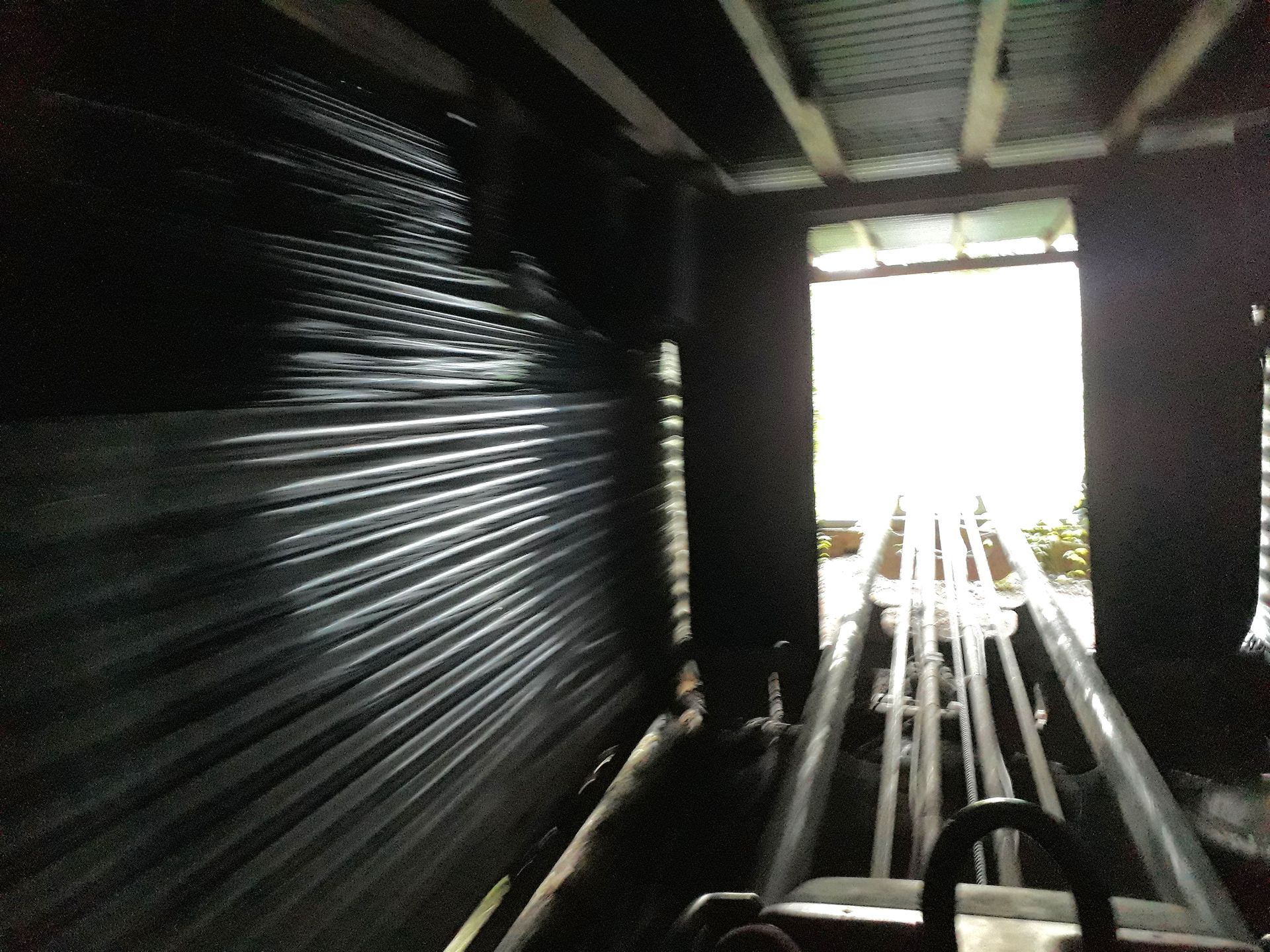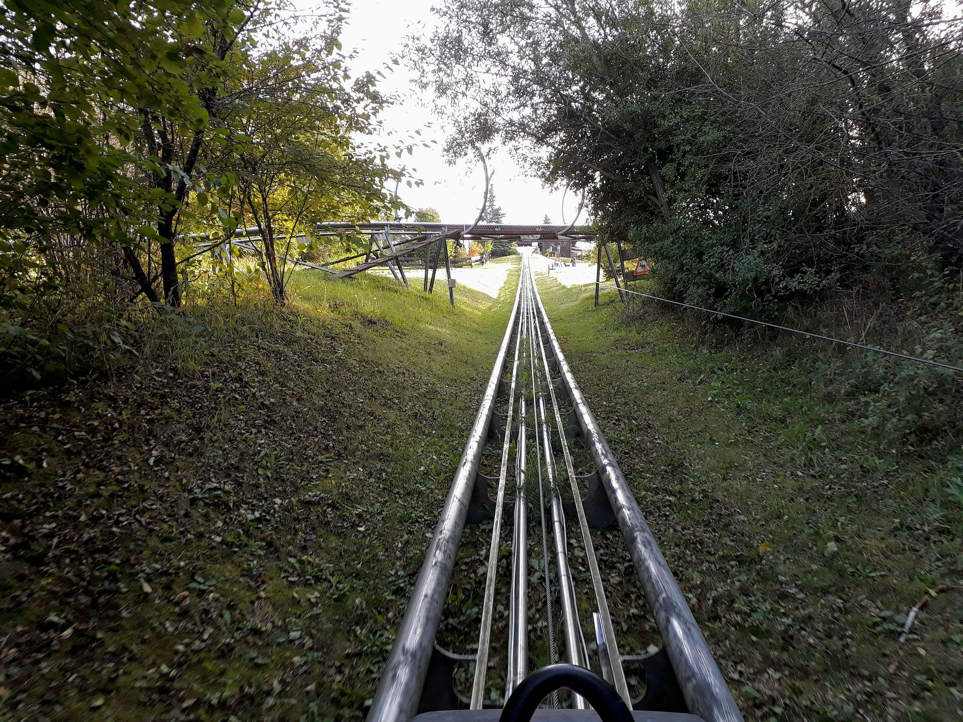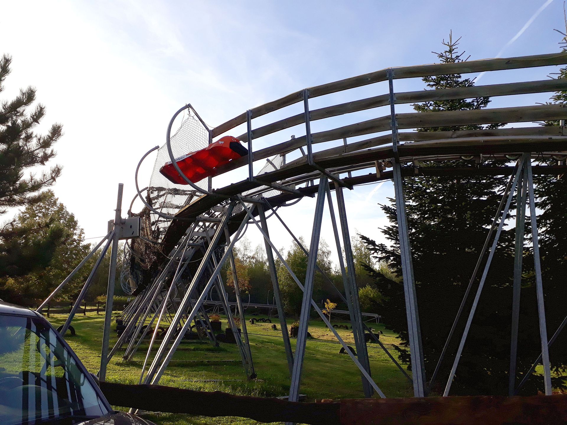 Der Rest der rund 560 Meter langen Bergabstrecke ist dann nicht mehr einsehbar, wartet aber wenigstens noch mit drei richtigen Kurven zum Finale auf. Bei fast 100 Metern mehr Länge überwindet die Bahn etwa genauso viele Höhenmeter wie die Anlage in Petersberg. Logisch, dass es sich hier nicht gerade um eine Hochgeschwindigkeitsanlage handelt. Trotzdem gefällt mir das Layout mit dem Slalom-Beginn irgendwie. Vielleicht hätte man zu Beginn etwas steiler zum Boden zurückkommen können, damit man mit etwas mehr Tempo startet, aber angesichts der Geländeeigenschaften war hier sonst schlichtweg nicht mehr drin. Den Standortnachteil versucht man aber mit viel Liebe zum Detail auszugleichen. Den im Geländer steckenden Schlitten am Liftende habe ich ja schon gezeigt, kurz vor Ende hängt ein weiterer in einem Baum auf der Außenseite der Kurve. Dazu kommen zwei Tarnnetz-Tunnel und ein Wellblech-Schuppen, den man während der Auffahrt durchfährt. Letzterer ist mit Musikboxen und zumindest auf älteren Onrides auch mit 2-3 bunten LED-Strahlern versehen. Rund um Halloween sollen sich da angeblich auch mal Live-Erschrecker drin verstecken.